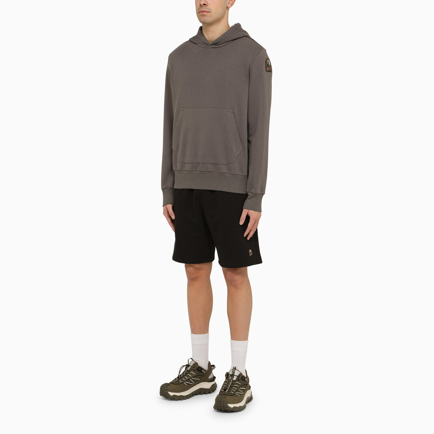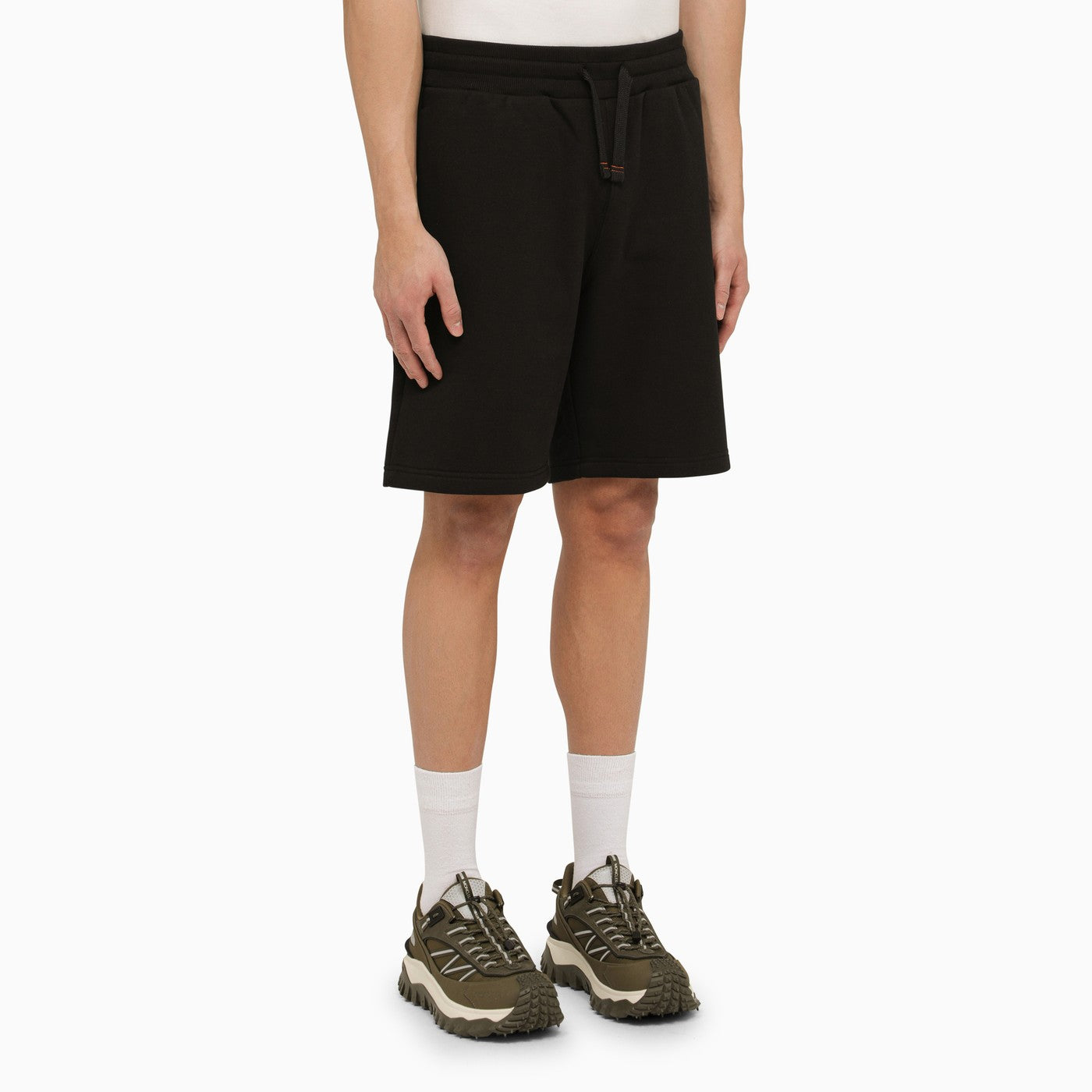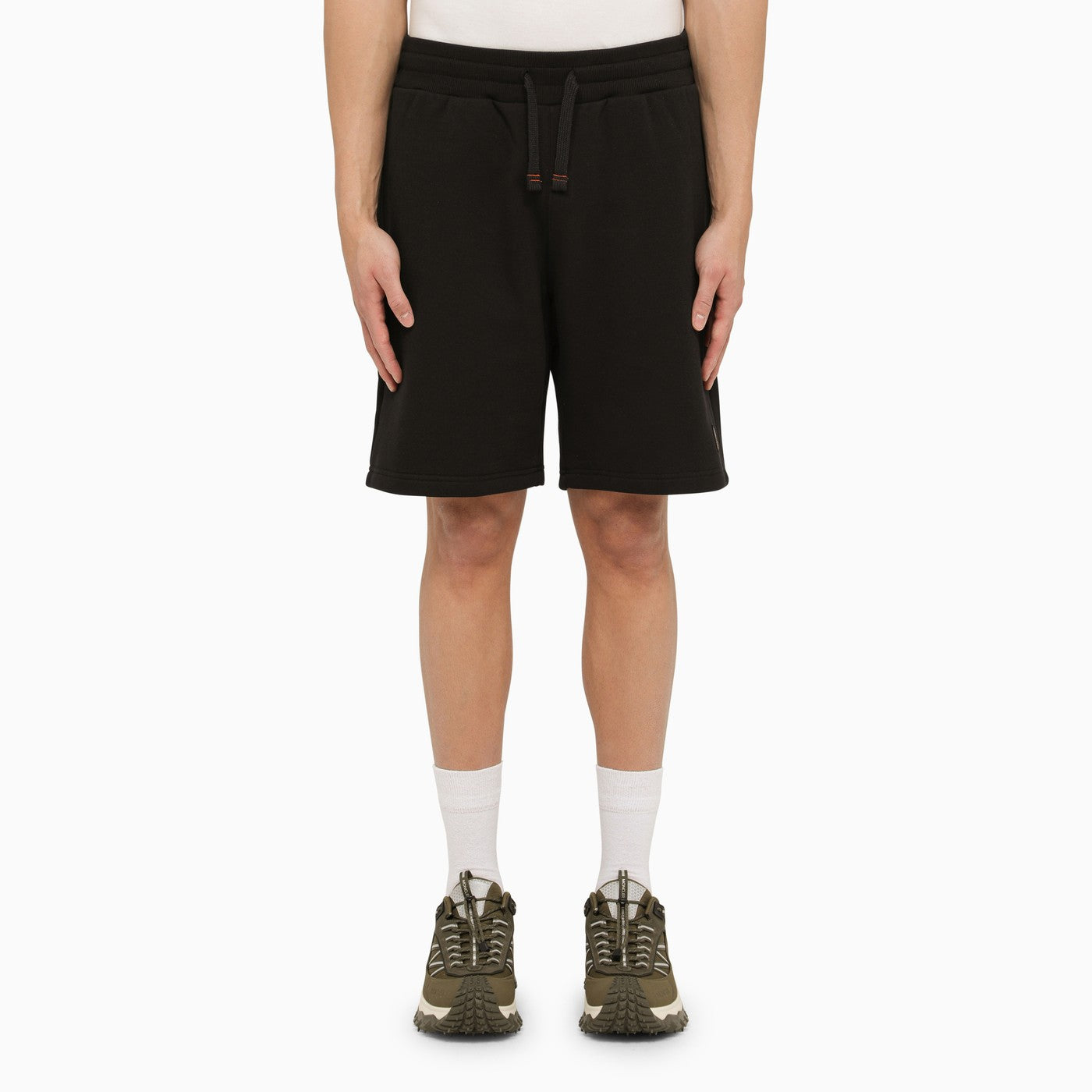Black cotton Parajumpers Bermuda shorts featuring an elasticated waistband with drawstring, two welt pockets, a back patch pocket and logo patch on the front.