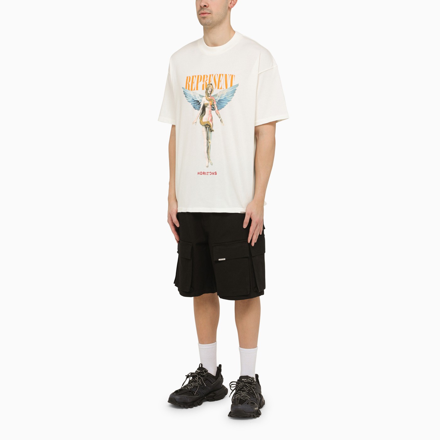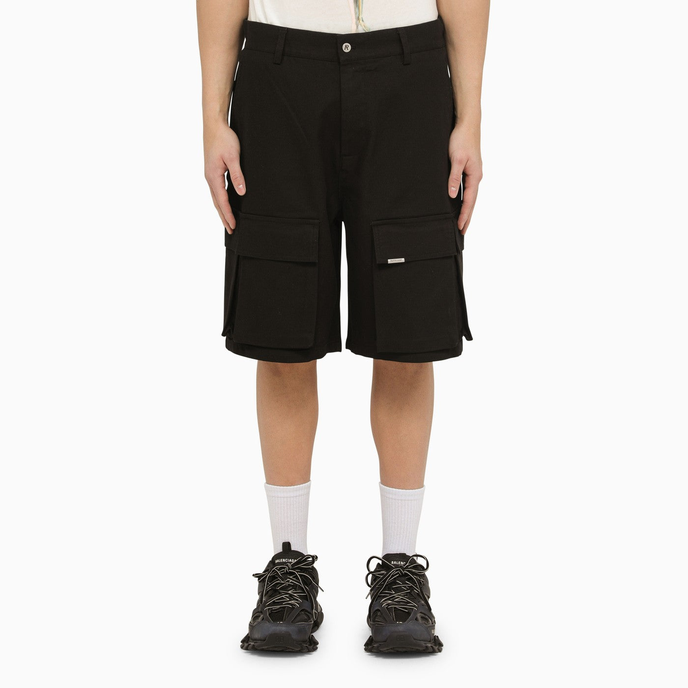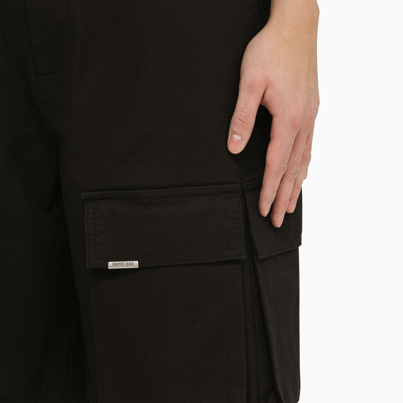 Black cotton cargo bermuda shorts from Represent featuring a front zip and button fastening, belt loops with logo detail, two welt pockets, several patch cargo pockets with flaps and a small logo plaque.