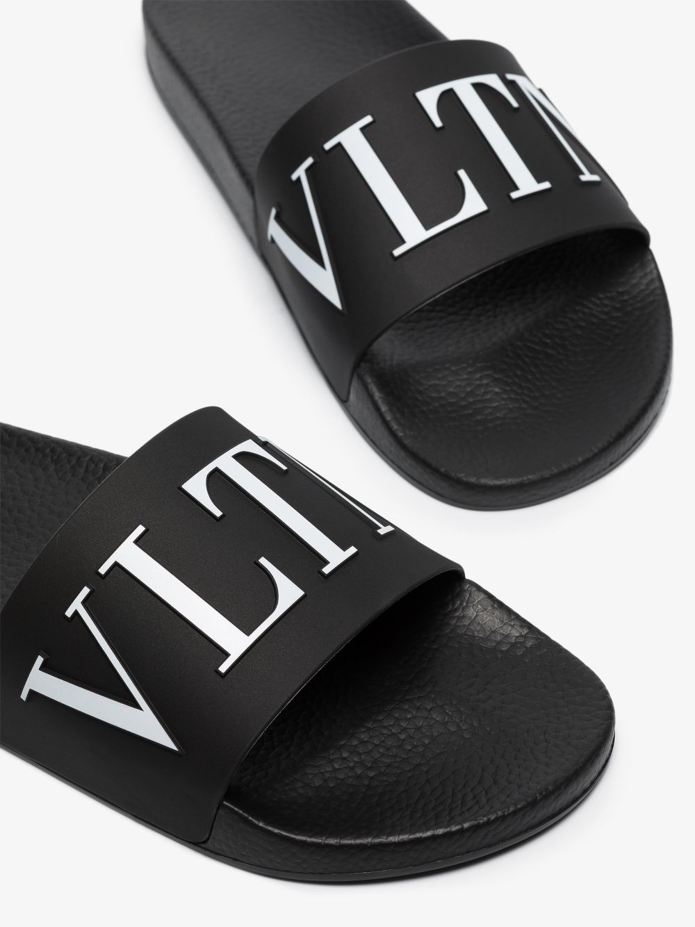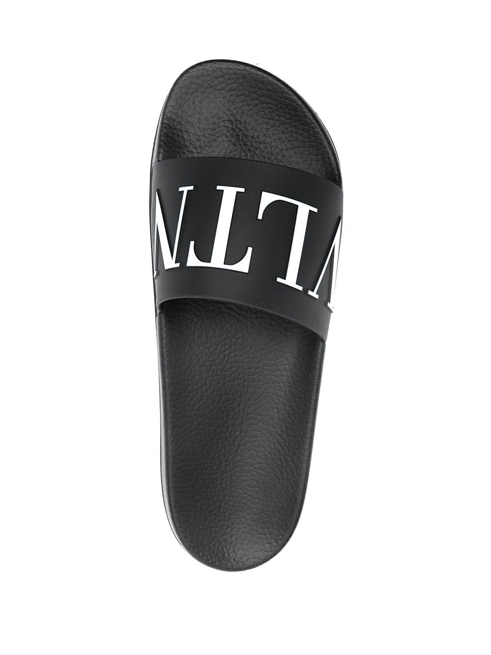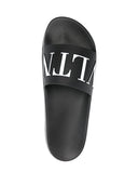 Black rubber VLTN print slides from VALENTINO GARAVANI featuring open toe, flat rubber sole and signature VLTN print.