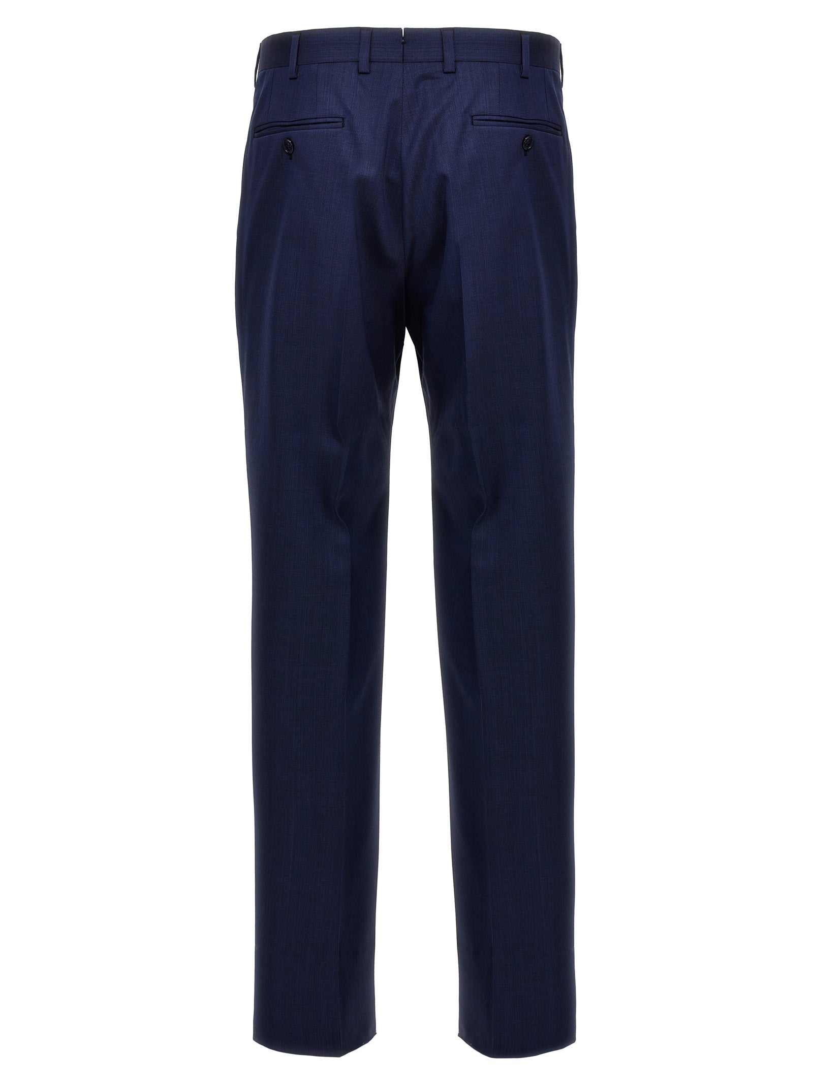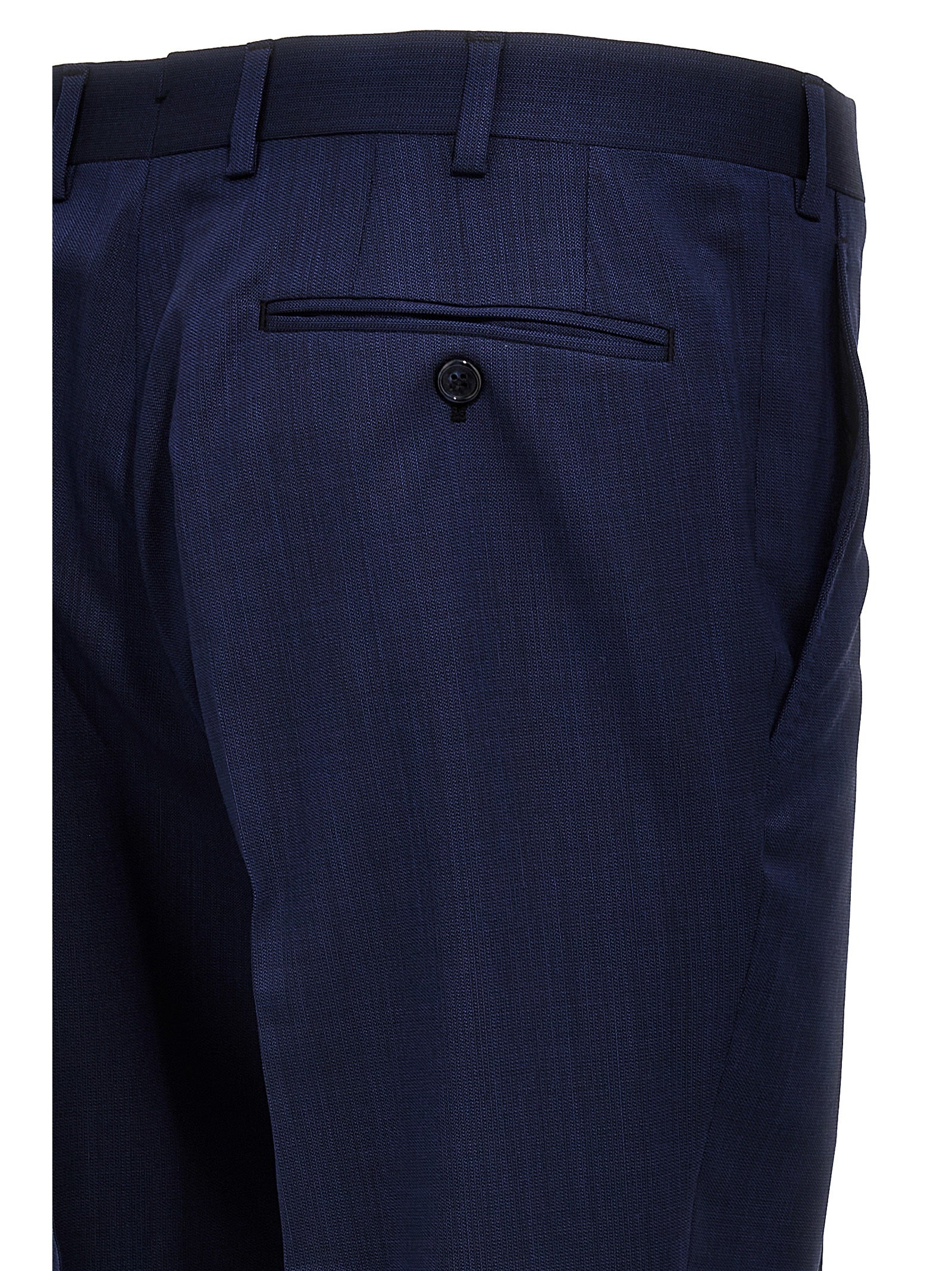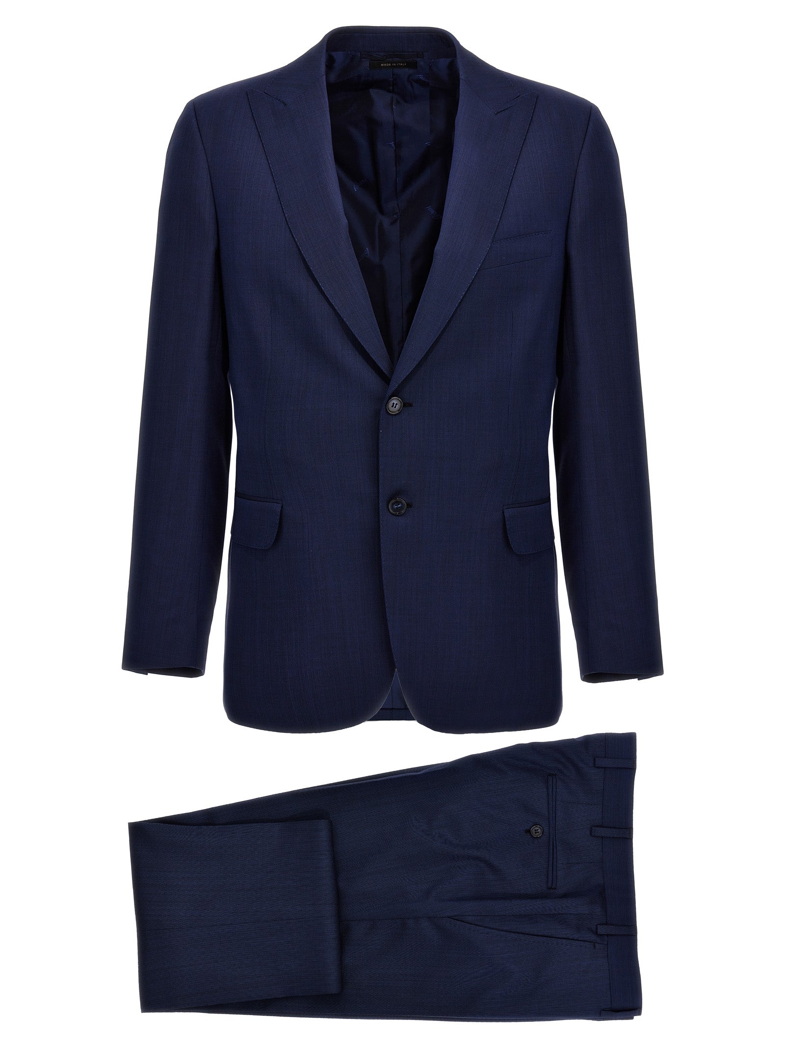 'Trevi' wool suit consisting of single-breasted blazer with peak lapels and padded shoulders, regular pants with straight leg.