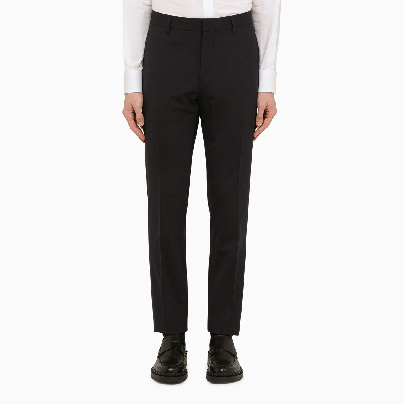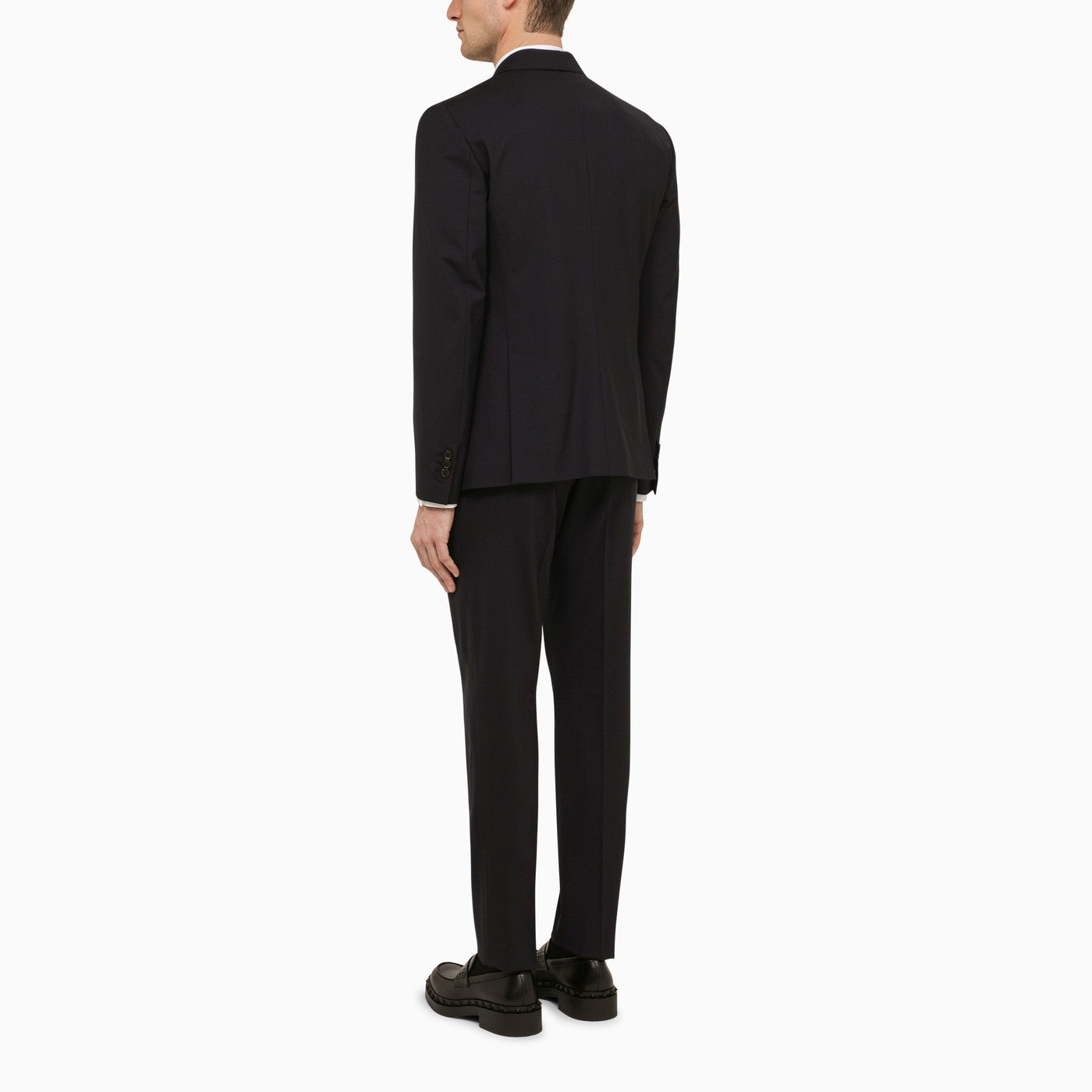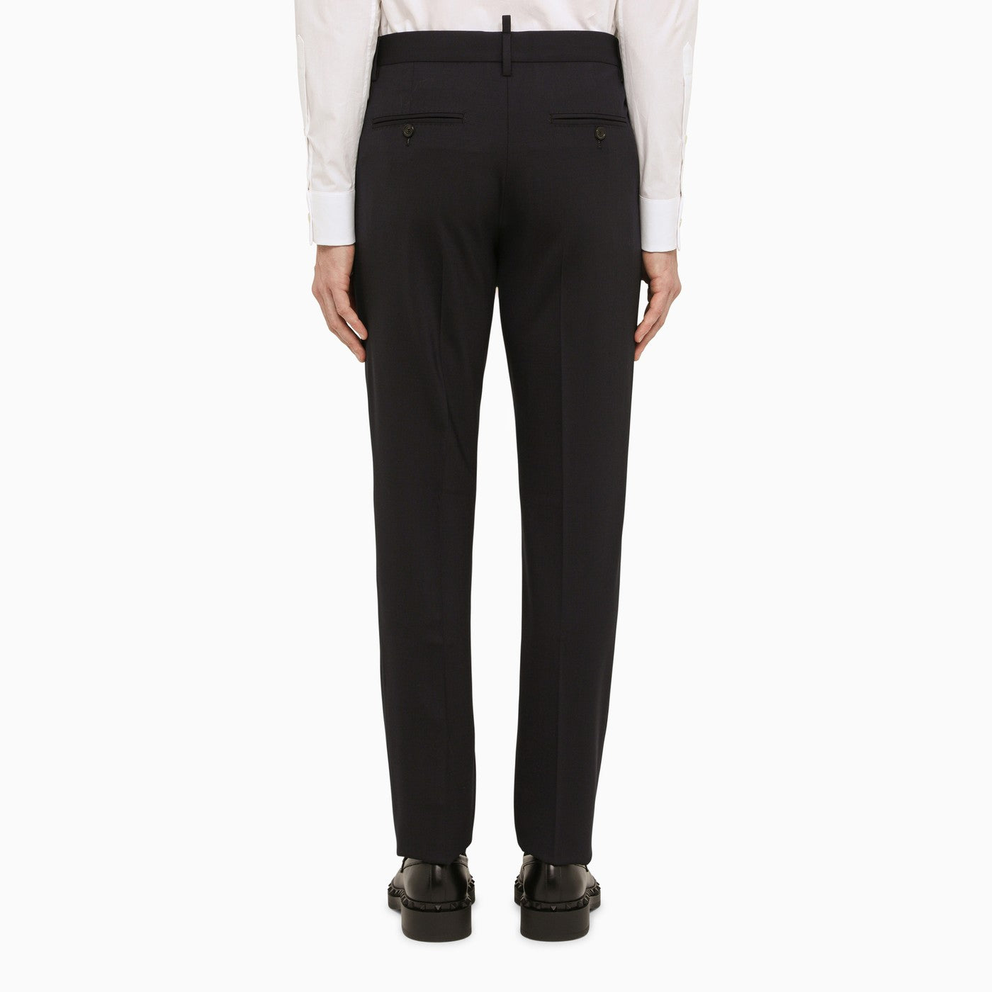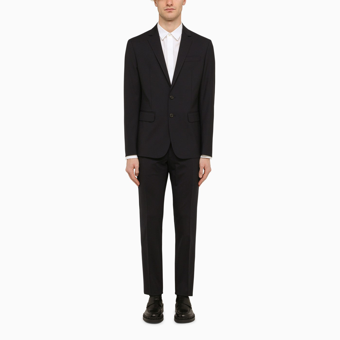 Blue Navy wool single breasted suit from Dsquared2. Single-breasted model, featuring a front button fastening, long sleeves, buttoned cuffs, deep lapels, two front flap pockets, a welt pocket on the chest and grey wool trousers, featuring two welt pockets with a button on the back and belt loops at the waist.