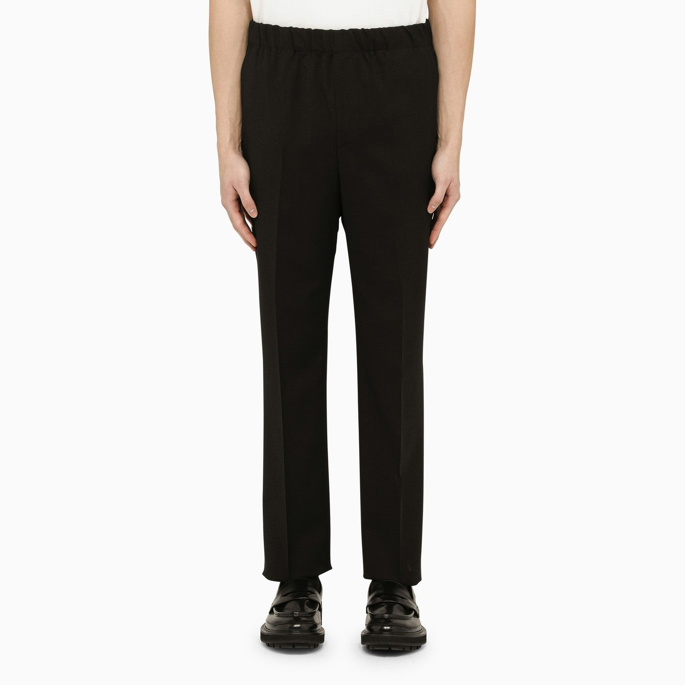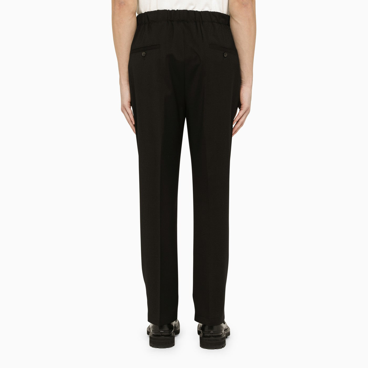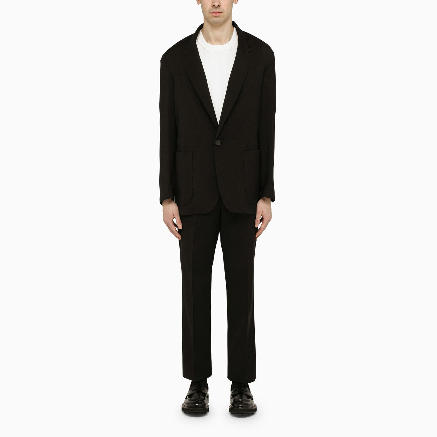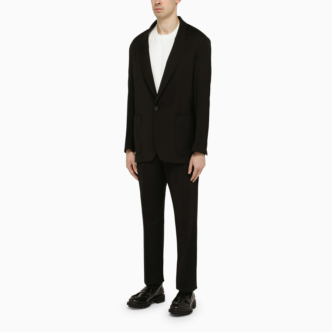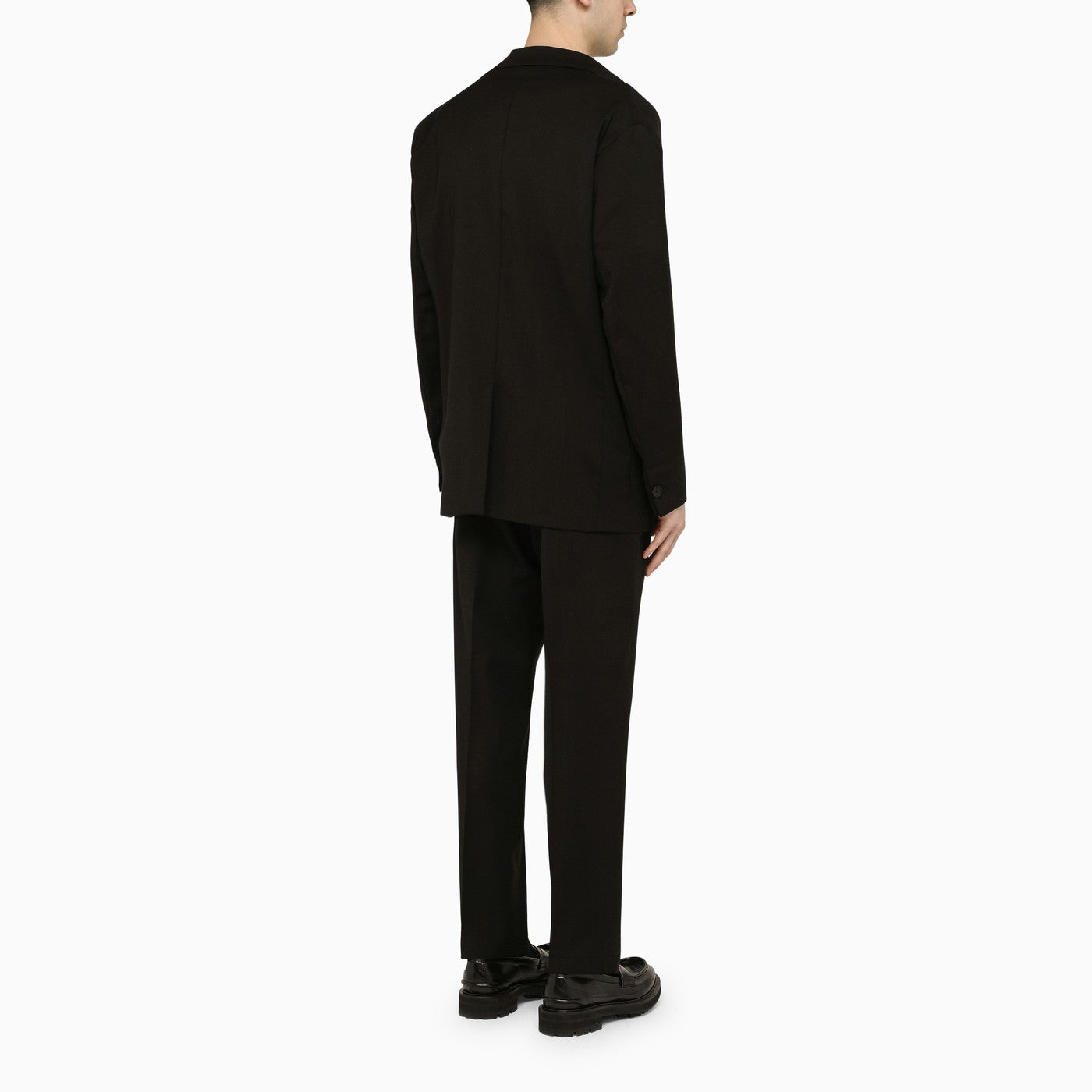 Black wool single-breasted suit by Hevò, featuring button fastening, two front pockets and a breast pocket, back vent and tone-on-tone trousers with elasticated waist and two back pockets.