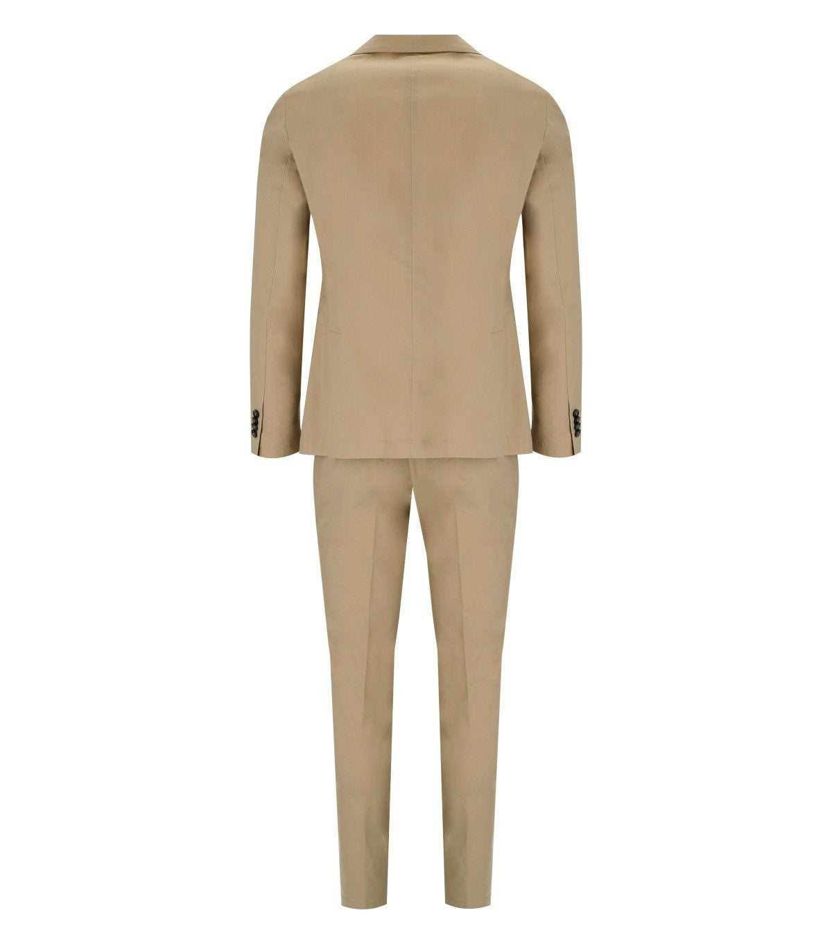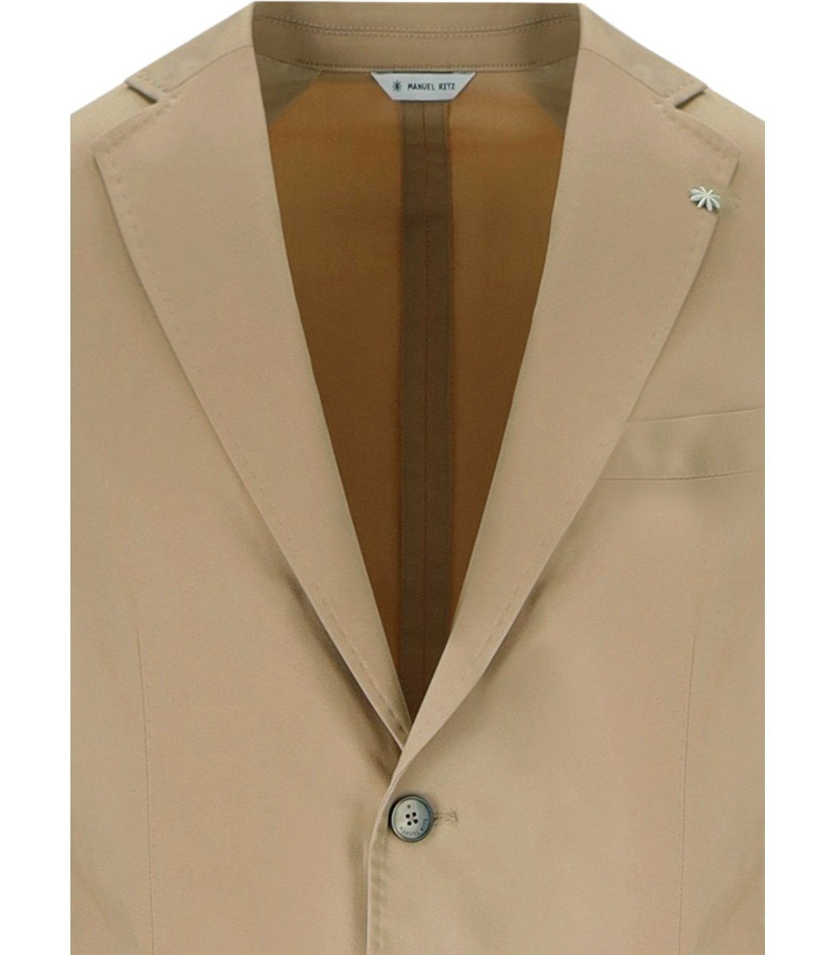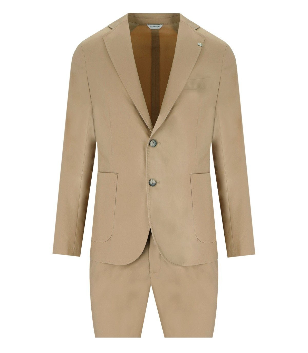 Manuel Ritz beige stretch cotton suit, consisting of a single-breasted jacket and slim-fit trousers. Partially lined jacket with lapel collar, patch pockets on the front, back vents, and button closure. Trousers with elasticated waist, adjustable drawstring, zip and metal hook. Front darts, French pockets on the hips, and welt pockets on the back. This item has a small fit, we recommend buying one size larger than usual. Composition: 61% cotton, 36% polyamide, 3% elastane.
