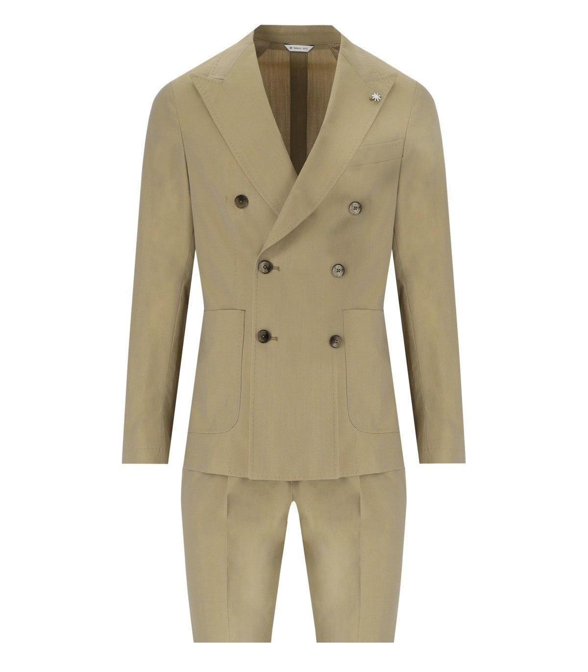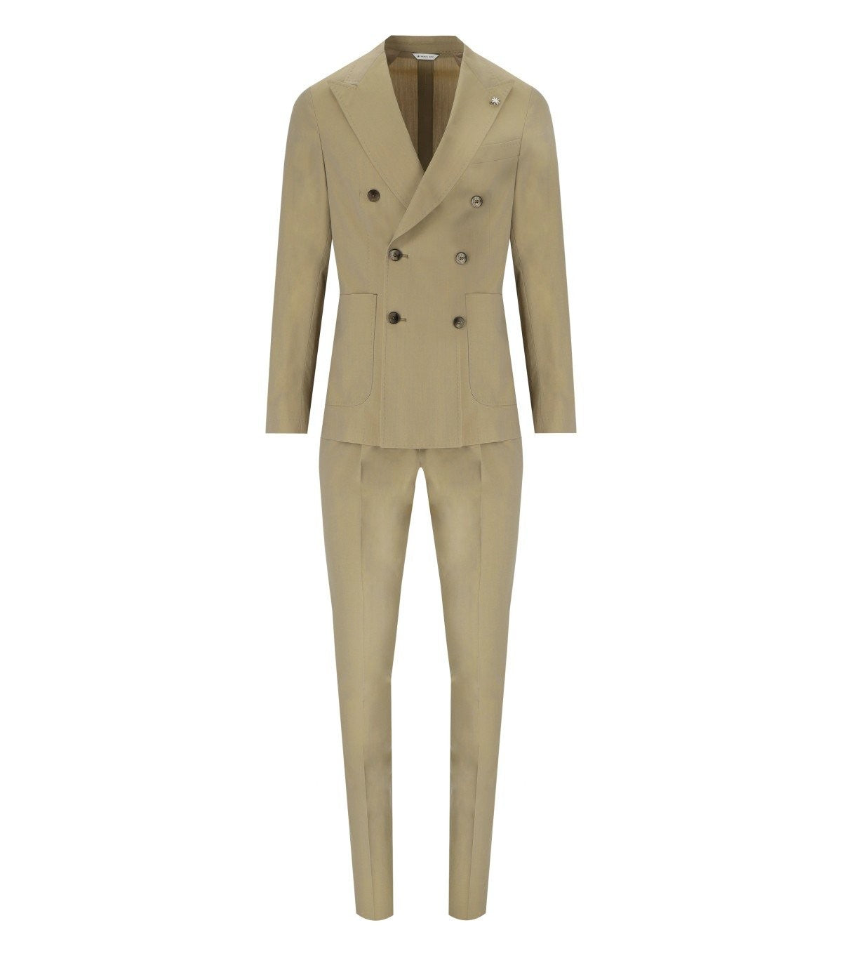 Manuel Ritz drop 8 suit made in wool and cotton solaro fabric in shades of green/beige. Double-breasted jacket, partially lined, with notched lapel, back vents, and patch pockets on the front. Slim fit trousers with darts and front pockets, welt pockets on the back, zip closure, metal hook and button. This item has a small fit, we recommend buying one size larger than usual. Composition: 37% cotton, 33% wool, 30% polyester. Lining: 55% acetate, 45% viscose.