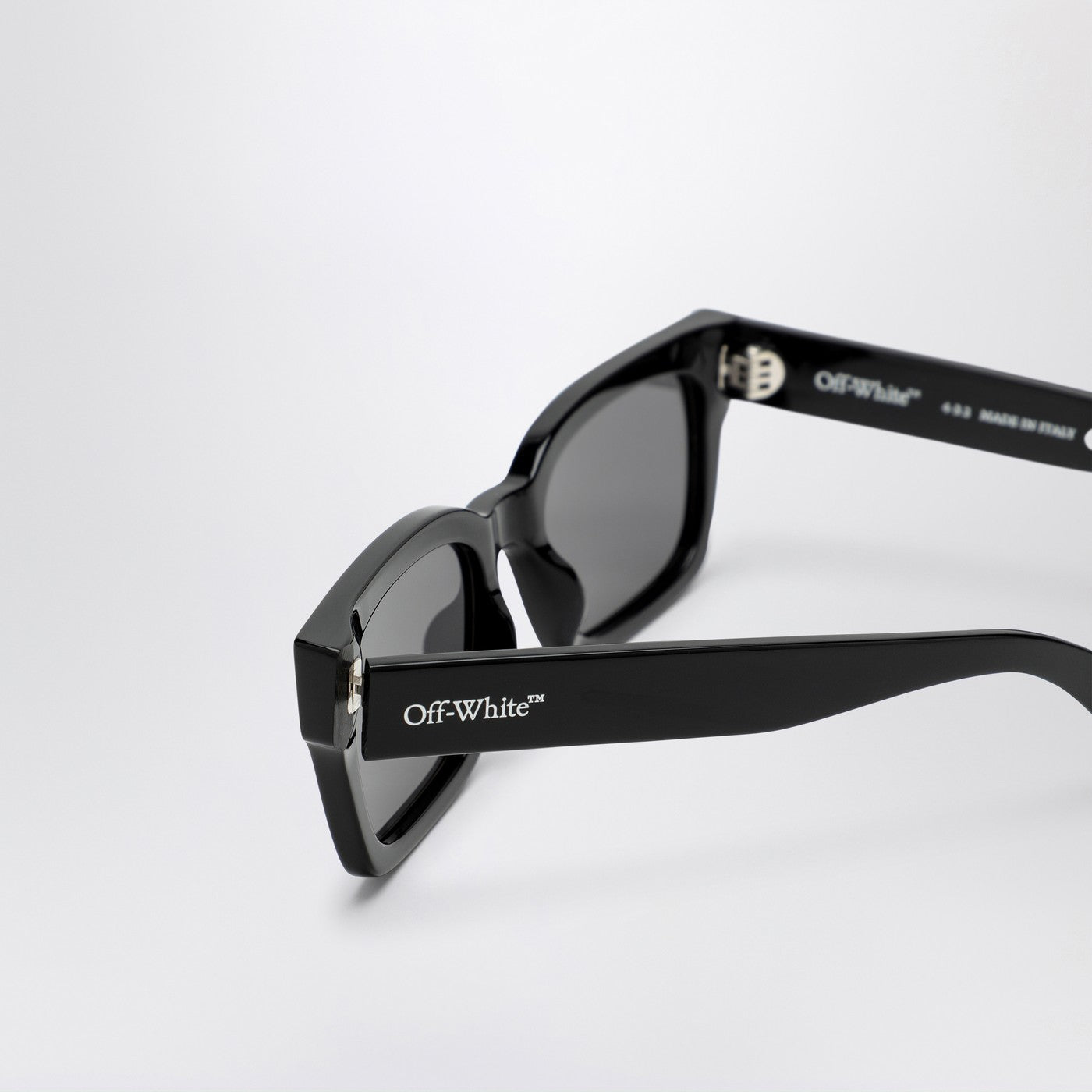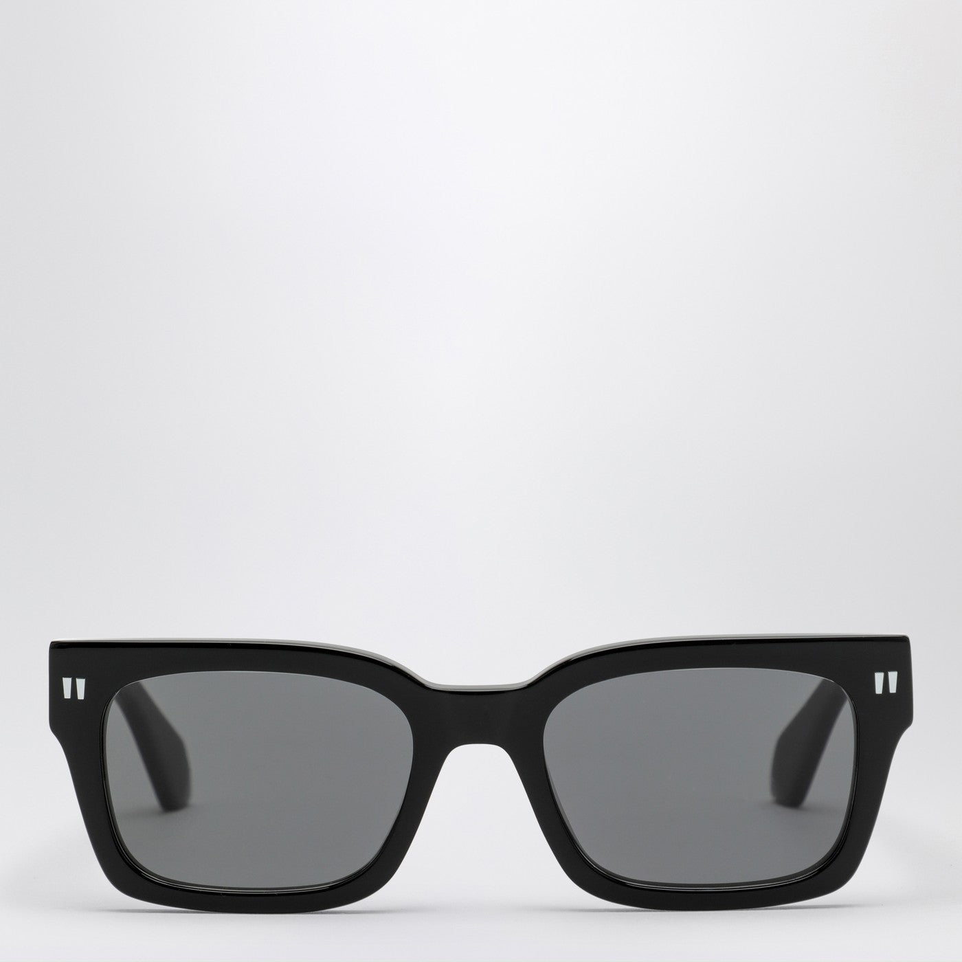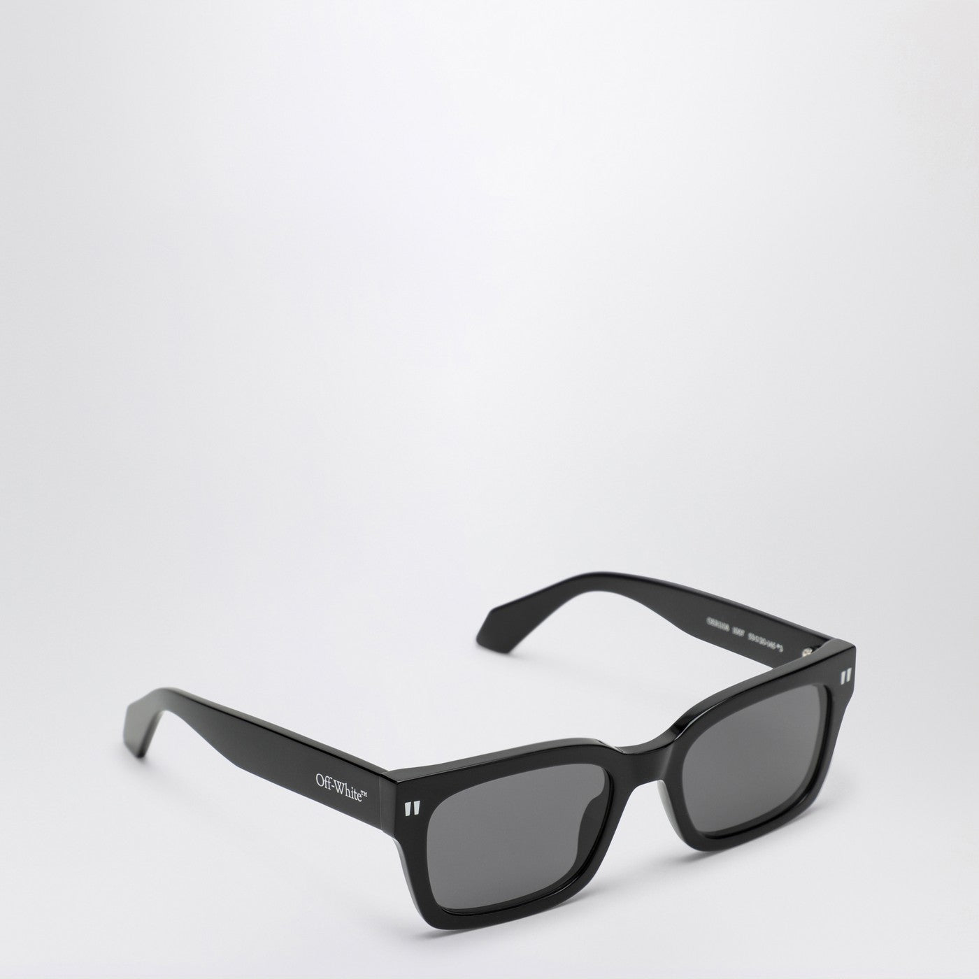 Black acetate sunglasses by Off-White with black lenses, featuring a slim geometric frame and contrasting lettering logo on the temples.
