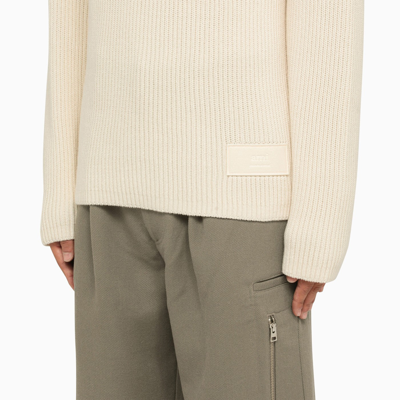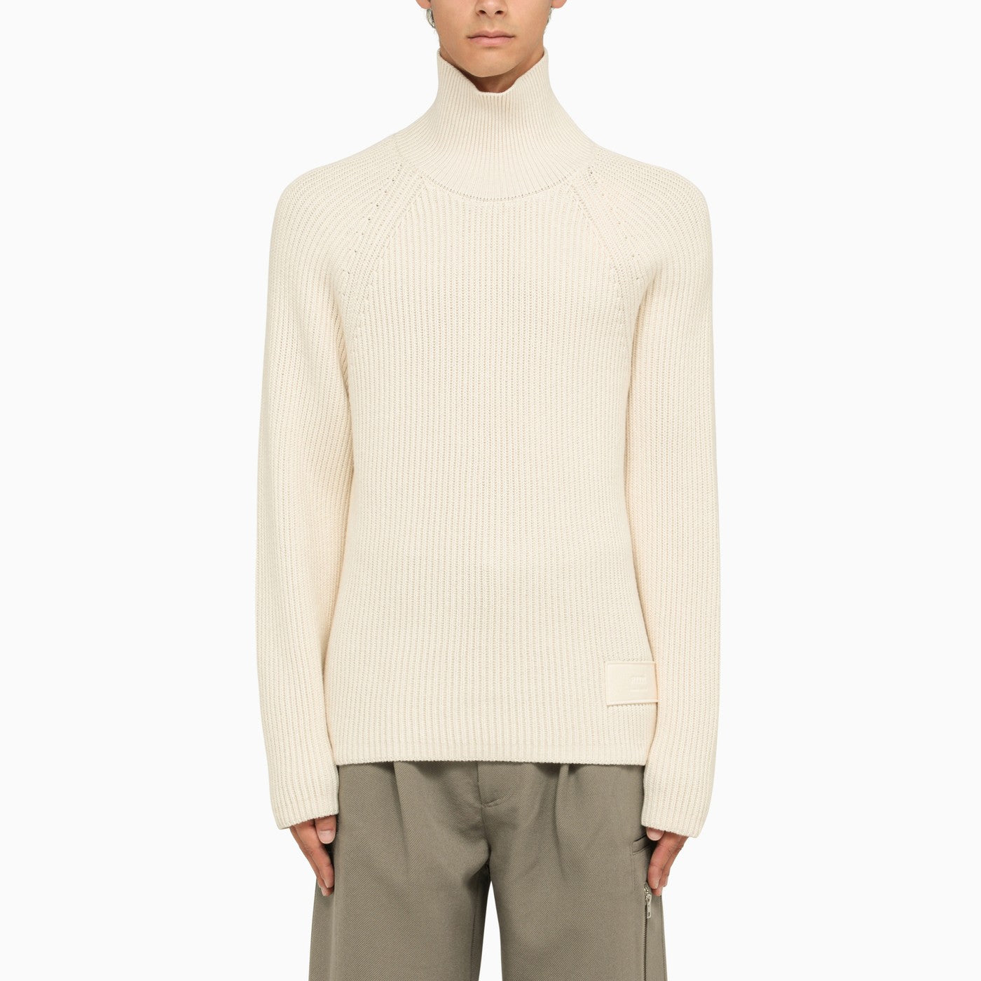 Ivory cotton Ami Paris turtleneck featuring a ribbed design and logo patch.