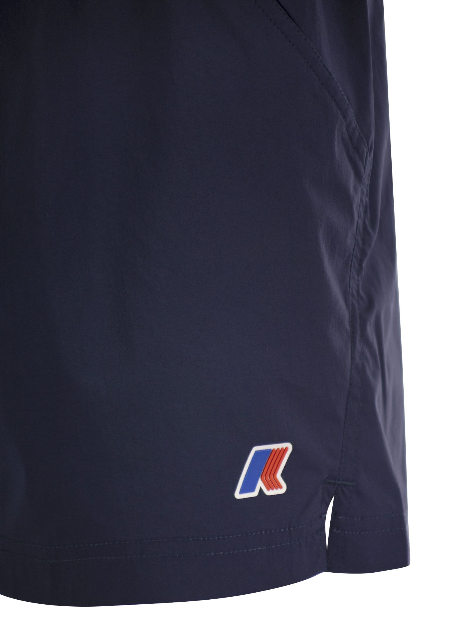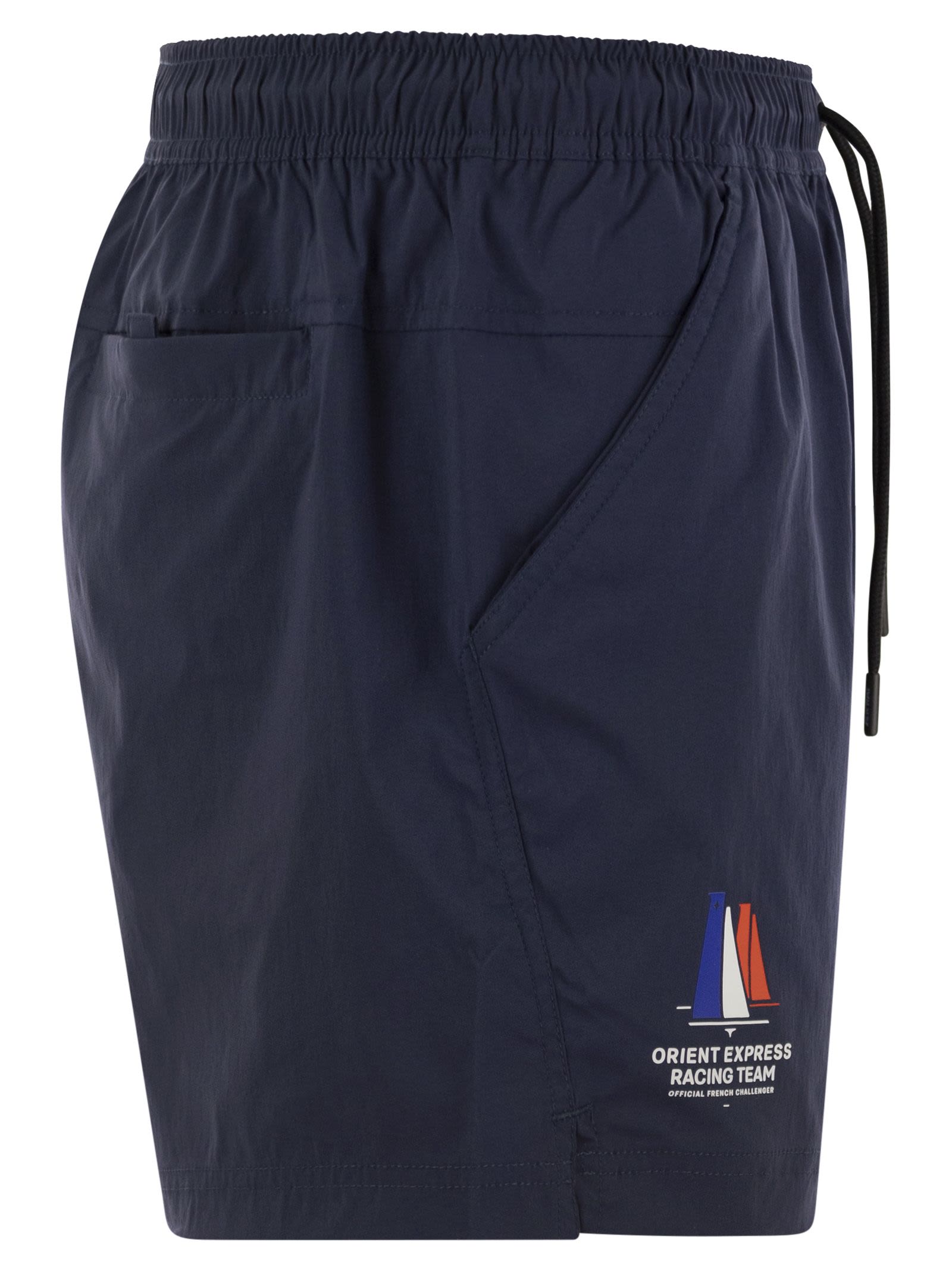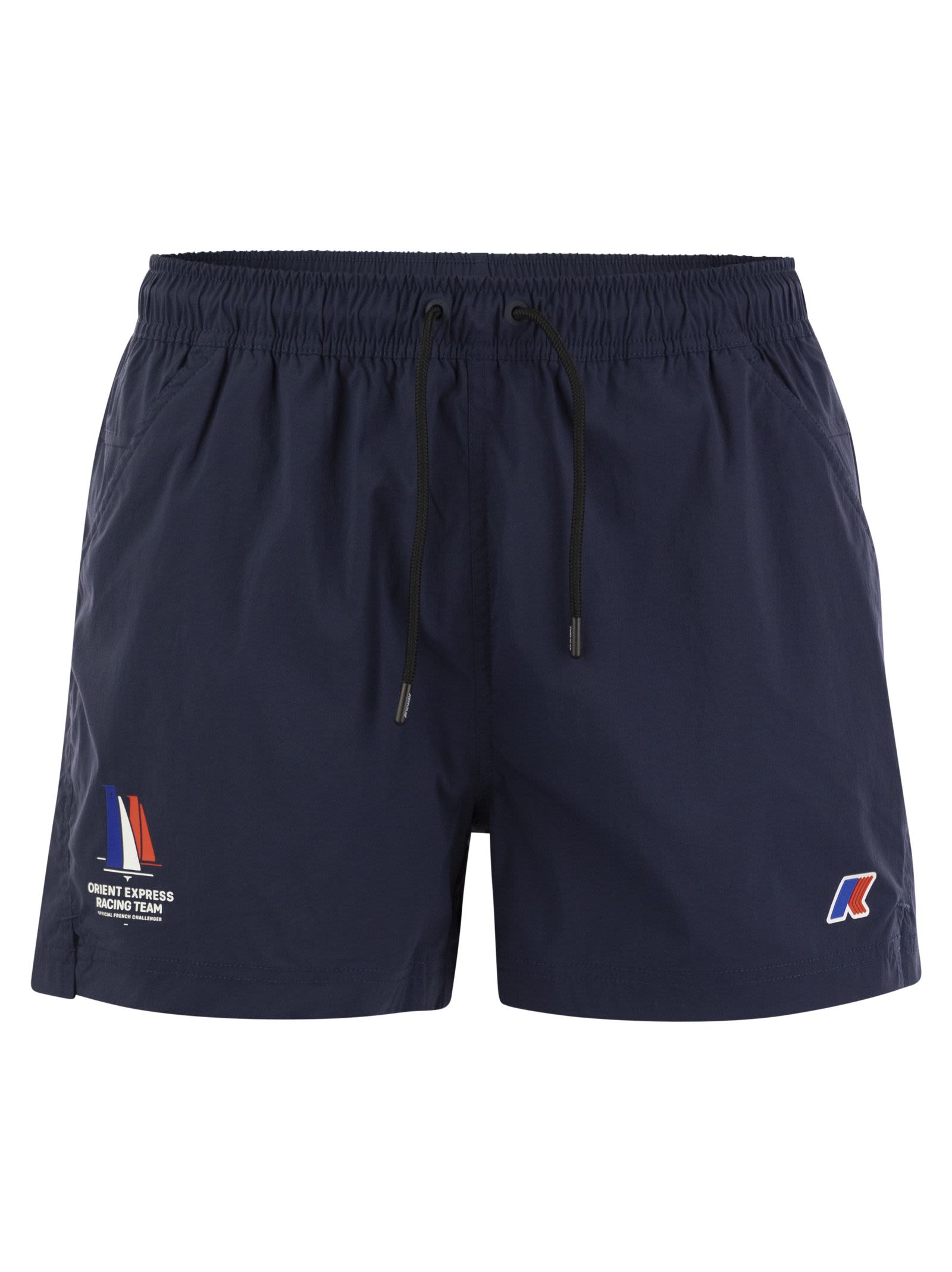 MEHDY ORIENT EXPRESS is the regular fit swimming trunk from K-Way commemorating the Orient Express Racing Team's sponsorship of the 37th America's Cup. Made of quick-drying technical fabric, with mesh lining and adjustable elasticated waistband with drawstring, it is perfect for enjoying every ray of sunshine, from the beach to poolside. Back pocket with Velcro opening. Application and printed K-Way and Orient Express Racing Team logos. - Quick-dry fabric - Mesh lining - Elasticated waistband - Side pockets - Back pocket with Velcro opening - Regular fit - Applique and print logo DESIGNER ID: K2126IW B29