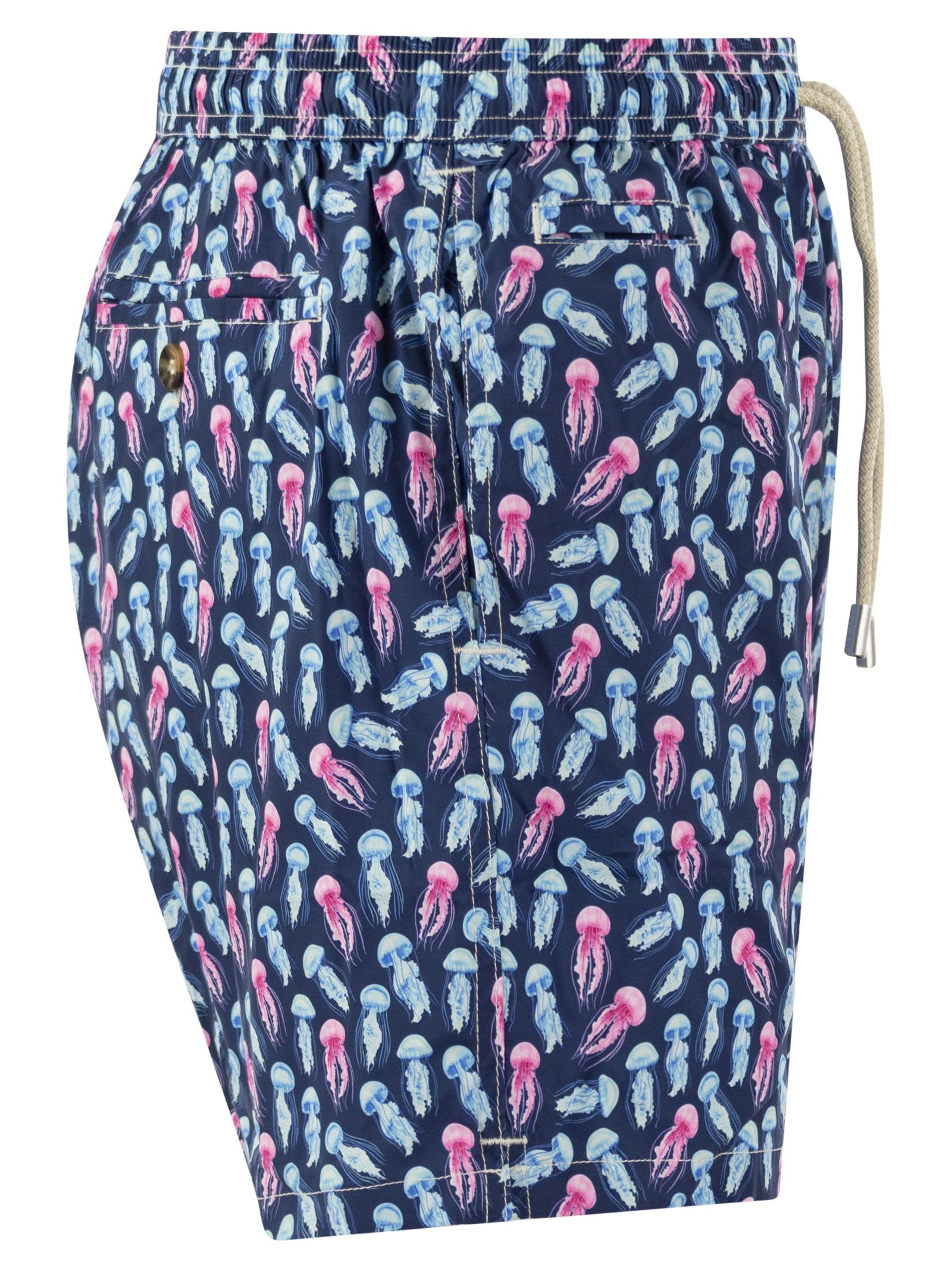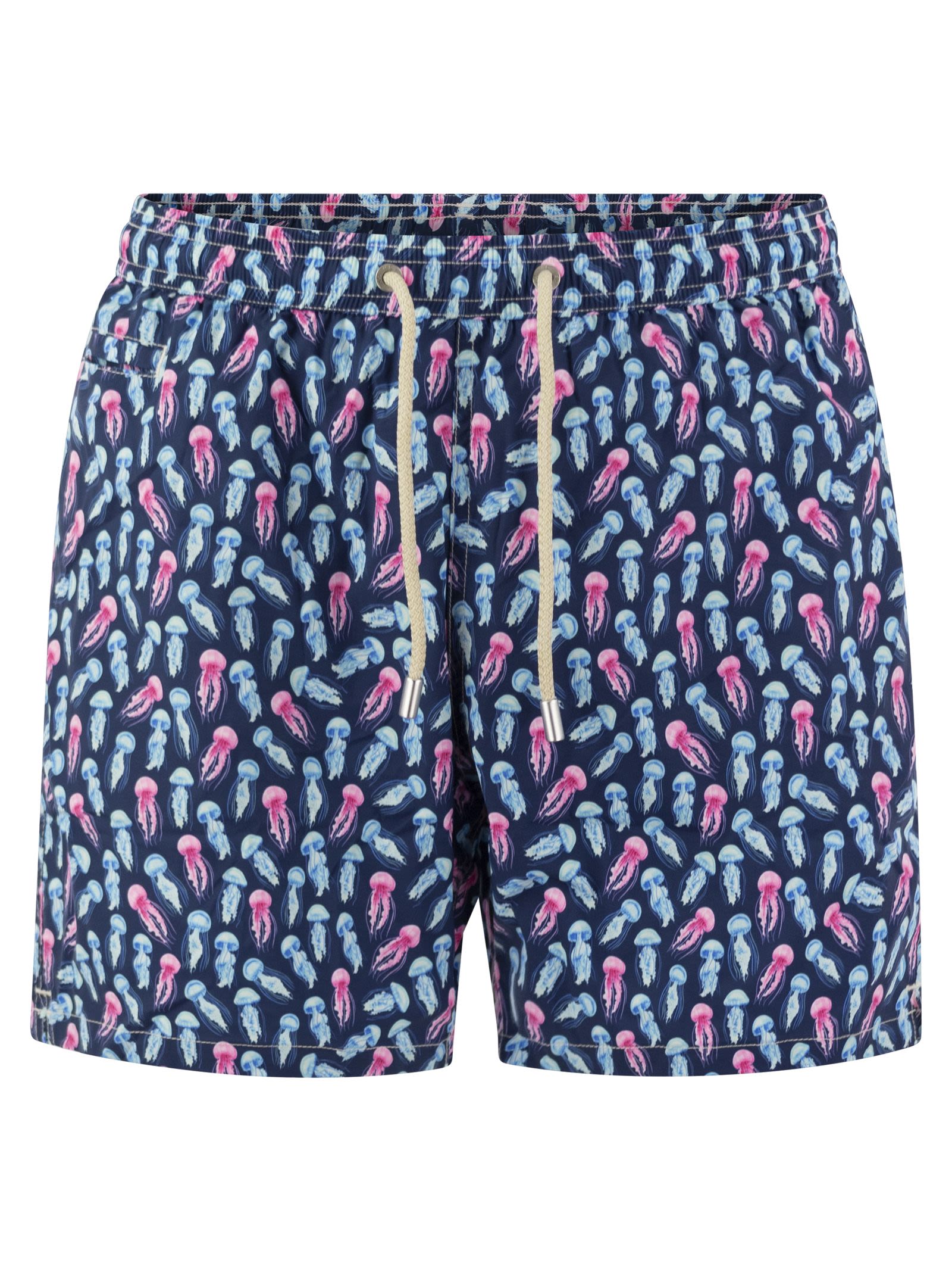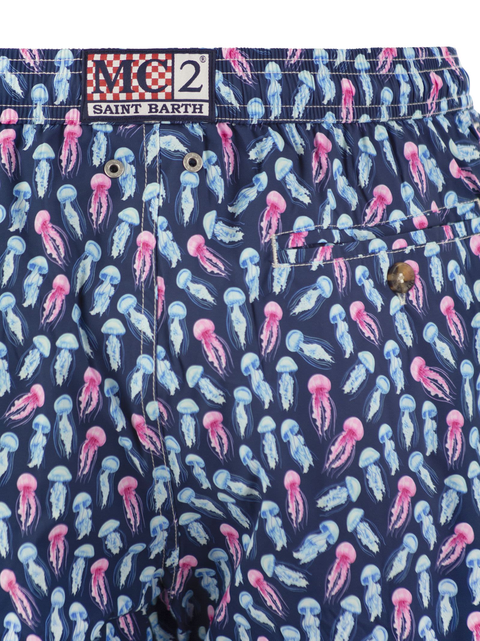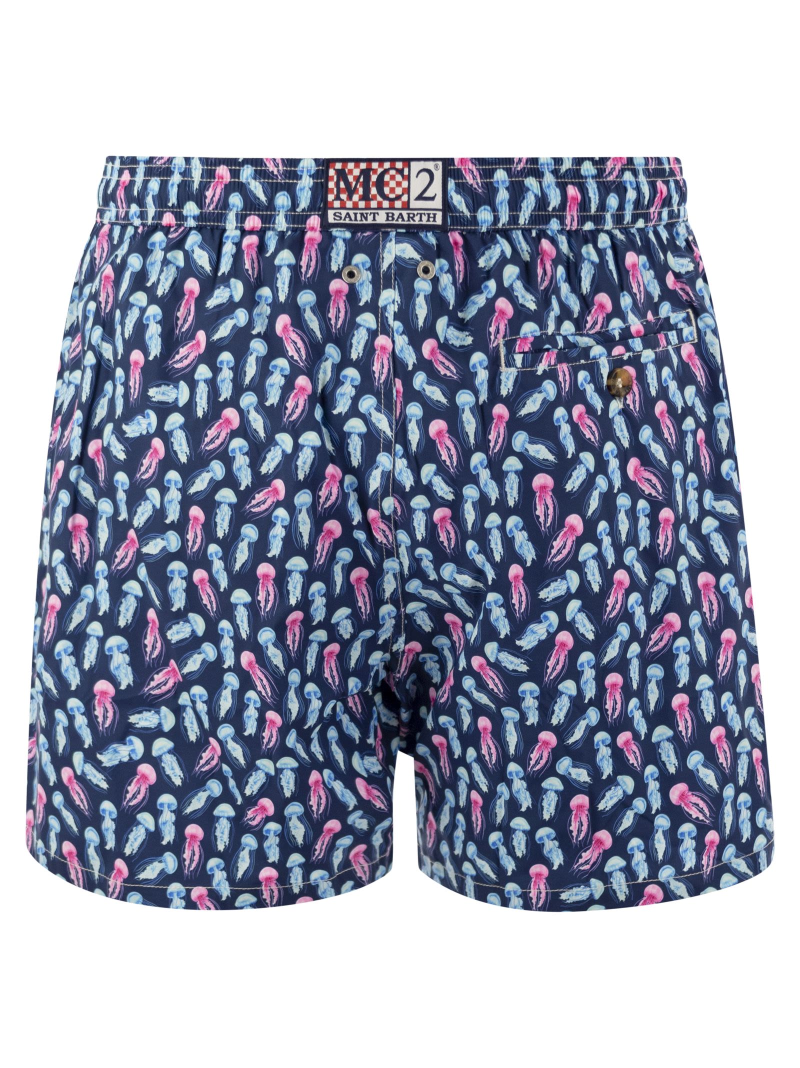 Introducing Comfort Light, the perfect swimwear companion designed for both water activities and casual outings. With its relaxed fit and essential design, this swimwear goes perfectly from the beach to the bar. The distinguishing feature of this model is its comfortable fit made from mechanical stretch fabric, a light, quick-drying fabric: style combined with comfort and practicality. This model is presented in a wide range of exclusive micro-patterns by MC2 Saint Barth. It has two side pockets, a front pocket with Velcro fastening, an elasticated waist with drawstring and logoed end pieces, an inner mesh lining, a back pocket with button fastening, logoed eyelets on the back for water drainage, and a back label with MC2 lettering. San Barth logo. - Print jellyfish - Mechanical stretch fabric - Soft fit - Side pockets in the seam - Back right pocket with velcro - MC2 Saint Barth signature embroidered on left hem - MC2 Saint Barth label on the back - Internal mesh briefs for extra support - Branded rear eyelets to drain water - Elastic waistband with drawstring DESIGNER ID: COM0009 03391F