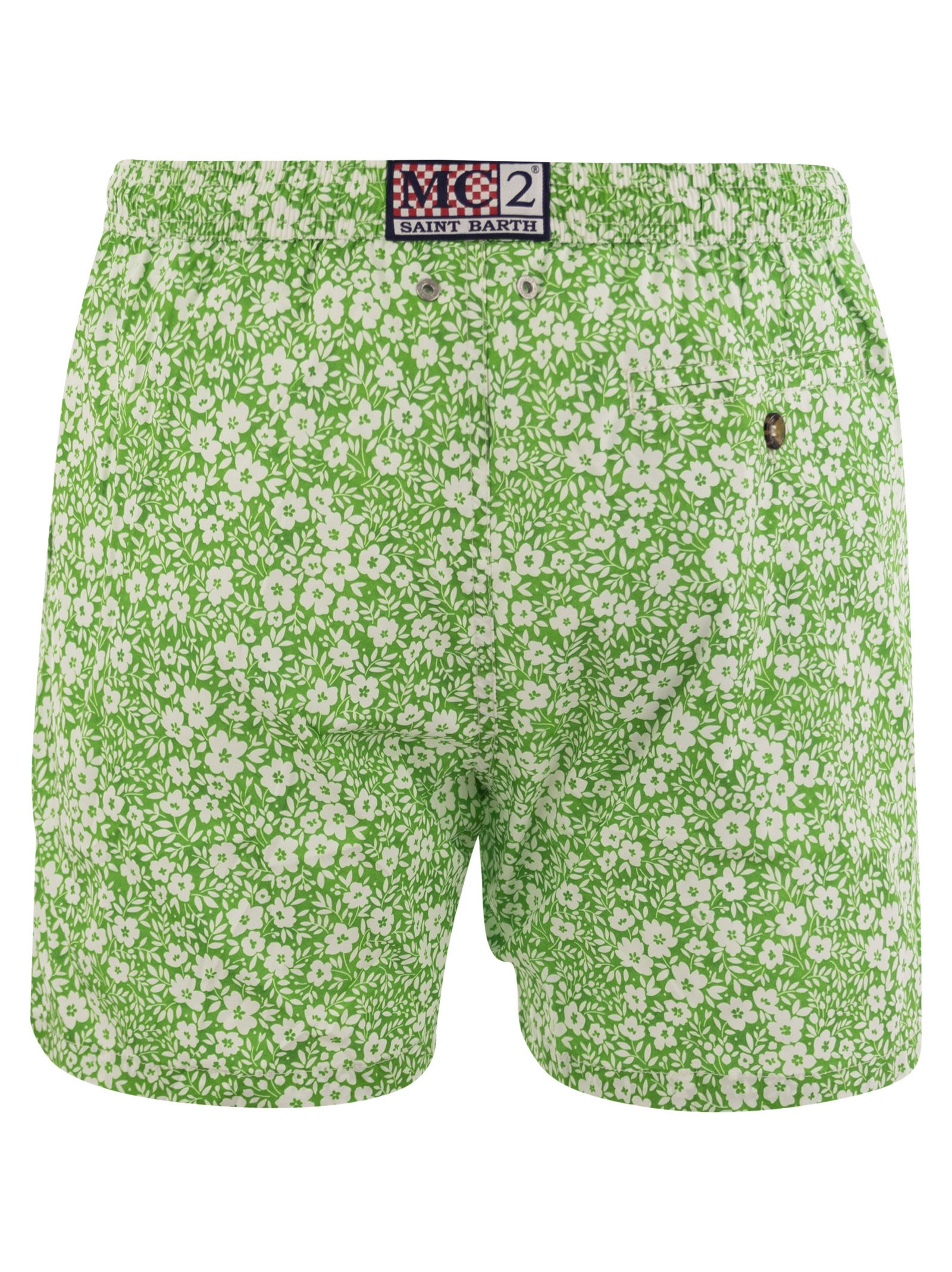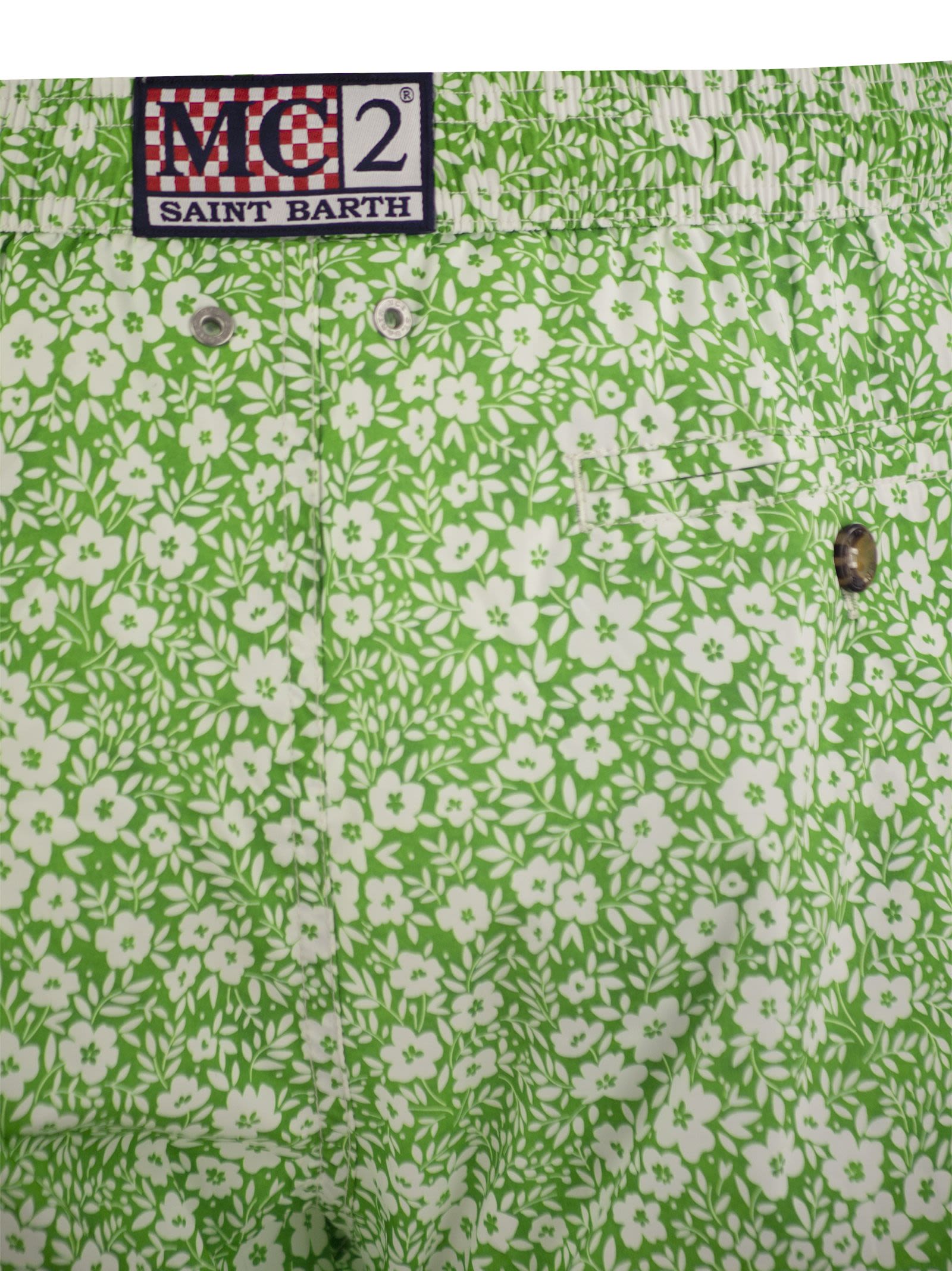 Introducing Comfort Light, the perfect swimwear companion designed for both water activities and casual outings. With its relaxed fit and essential design, this swimwear goes perfectly from the beach to the bar. The distinguishing feature of this model is its comfortable fit made from mechanical stretch fabric, a light, quick-drying fabric: style combined with comfort and practicality. This model is presented in a wide range of exclusive micro-patterns by MC2 Saint Barth. It has two side pockets, a front pocket with Velcro fastening, an elasticated waist with drawstring and logoed end pieces, an inner mesh lining, a back pocket with button fastening, logoed eyelets on the back for water drainage, and a back label with MC2 lettering. San Barth logo. - Print flowers - Mechanical stretch fabric - Soft fit - Side pockets in the seam - Back right pocket with velcro - MC2 Saint Barth signature embroidered on left hem - MC2 Saint Barth label on the back - Internal mesh briefs for extra support - Branded rear eyelets to drain water - Elastic waistband with drawstring DESIGNER ID: COM0009 04049F