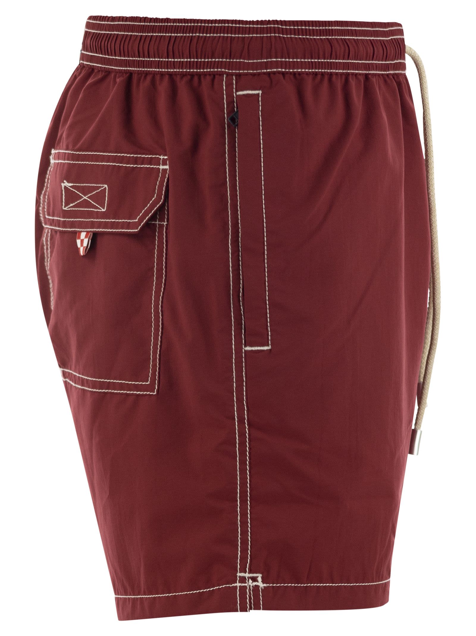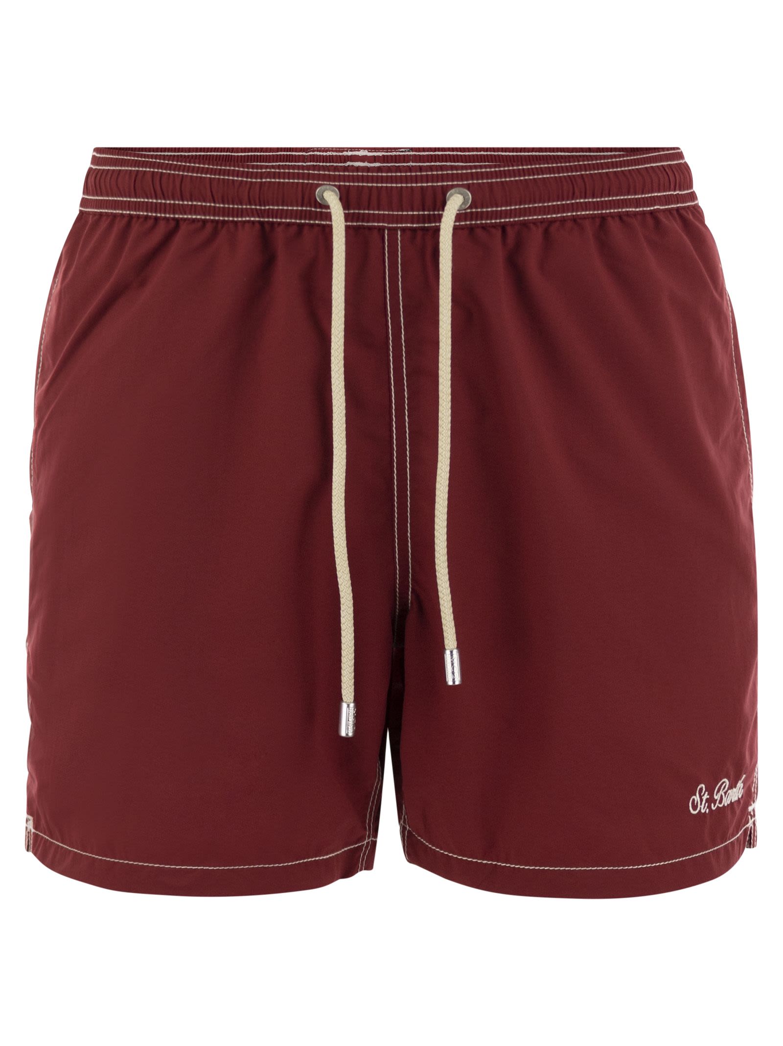 The Patmos swim shorts, made from a structured polyester fabric, offer a cotton-like feel. Embellished with contrast stitching and drawstring, as well as the exclusive Saint Barth logo detail embroidered on the leg bottom. Features a back pocket with flap and Velcro fastening. This version is made from a quick-drying seersucker fabric. - Patmos mid-length swimming shorts - Quick-drying seersucker fabric - Exclusive Saint Barth logo detail on bottom leg - Comfortable elasticated waistband - Adjustable drawstring with branded ends - Mesh lining - Right-hand side pocket with zip - Back patch pocket with Velcro closure - Signature eyelets designed to drain water and prevent ballooning - Exclusive MC2 Saint Barth label on the back - Classic fit DESIGNER ID: PATM001 03519F