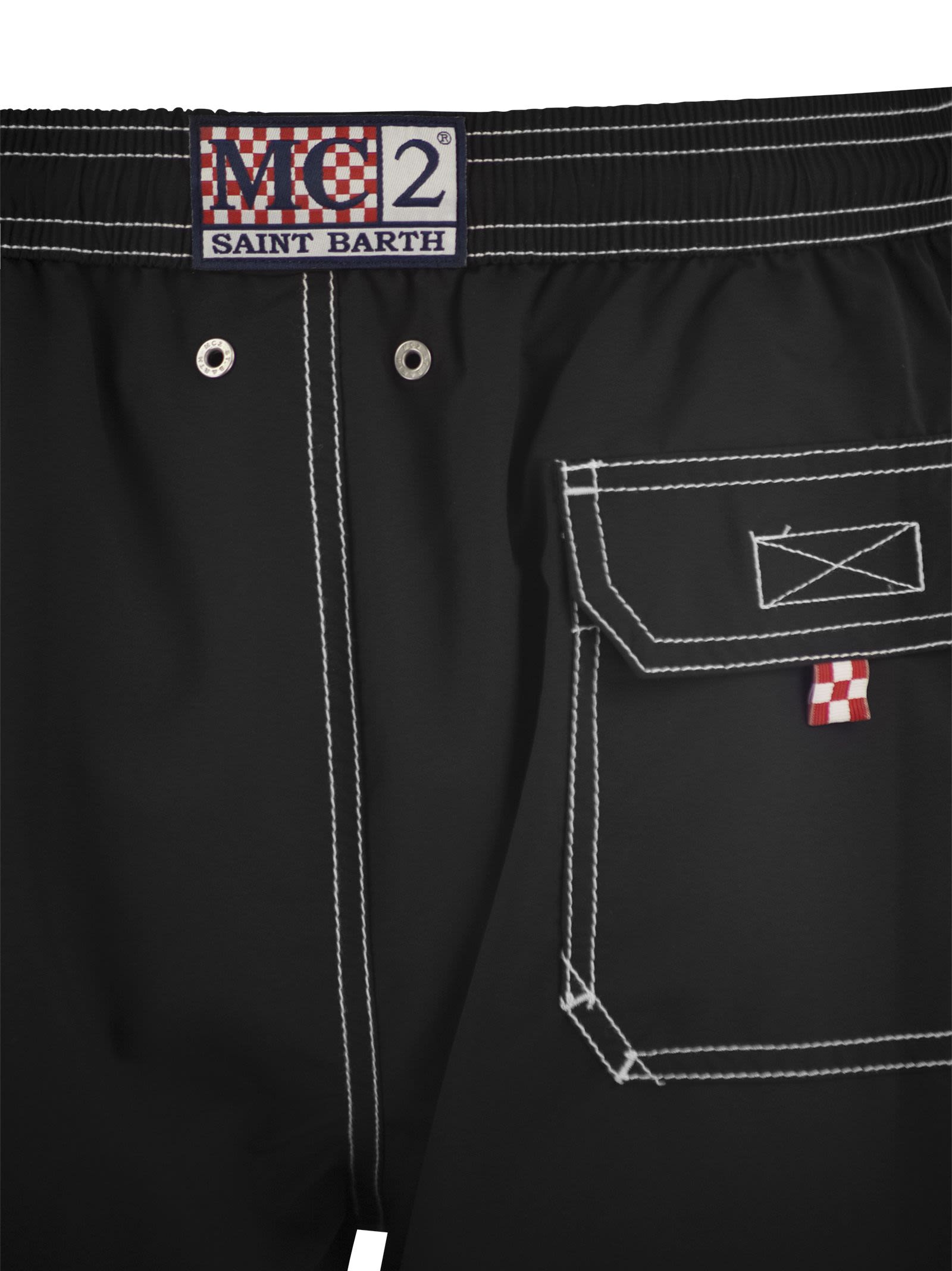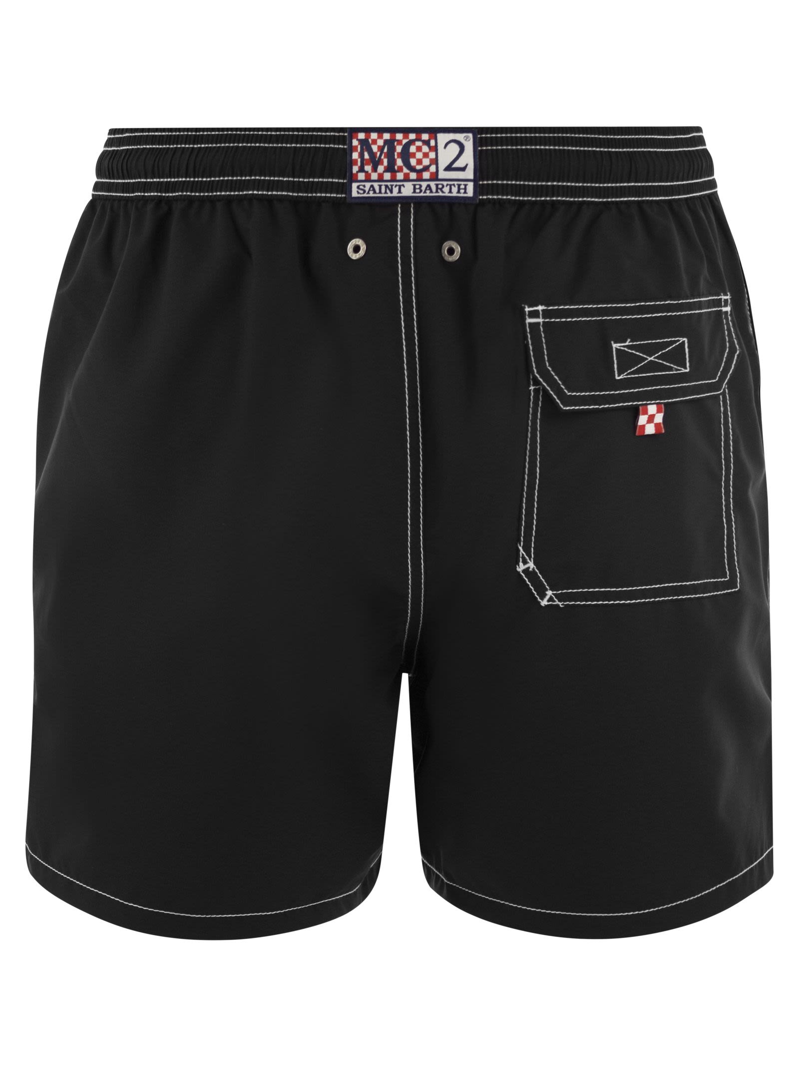 The Patmos swim shorts, made from a structured polyester fabric, offer a cotton-like feel. Embellished with contrast stitching and drawstring, as well as the exclusive Saint Barth logo detail embroidered on the leg bottom. Features a back pocket with flap and Velcro fastening. This version is made from a quick-drying seersucker fabric. - Patmos mid-length swimming shorts - Quick-drying seersucker fabric - Exclusive Saint Barth logo detail on bottom leg - Comfortable elasticated waistband - Adjustable drawstring with branded ends - Mesh lining - Right-hand side pocket with zip - Back patch pocket with Velcro closure - Signature eyelets designed to drain water and prevent ballooning - Exclusive MC2 Saint Barth label on the back - Classic fit DESIGNER ID: PATM001 01338F