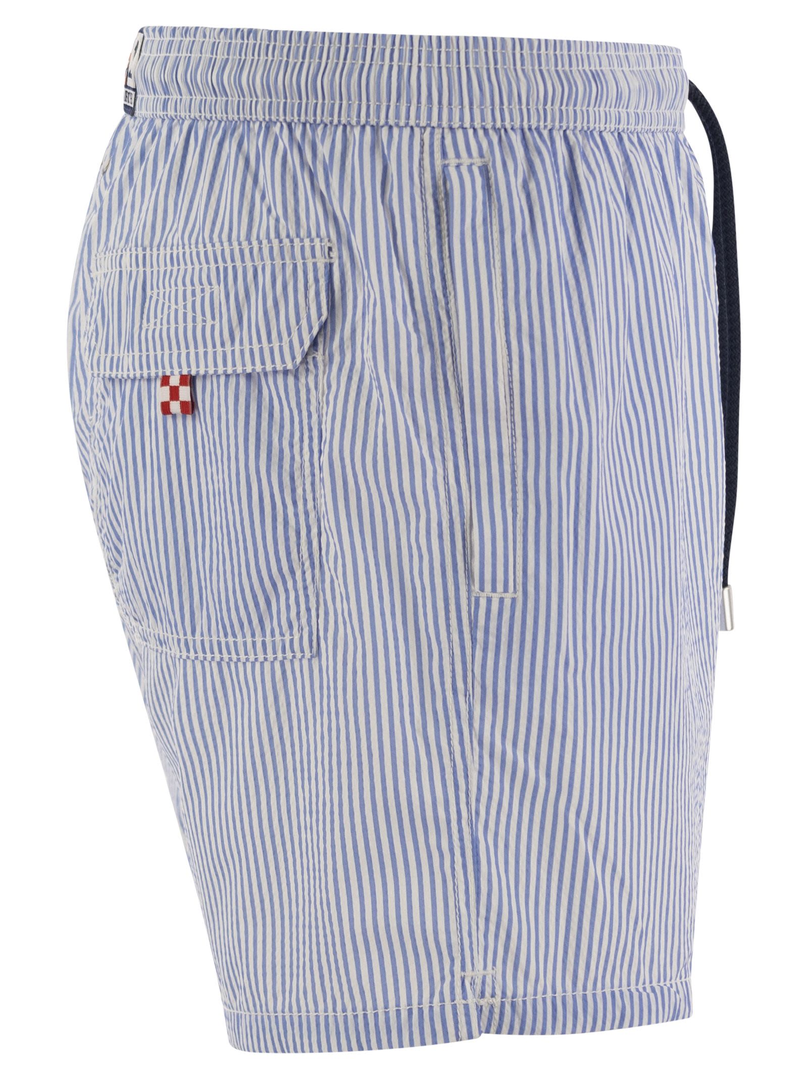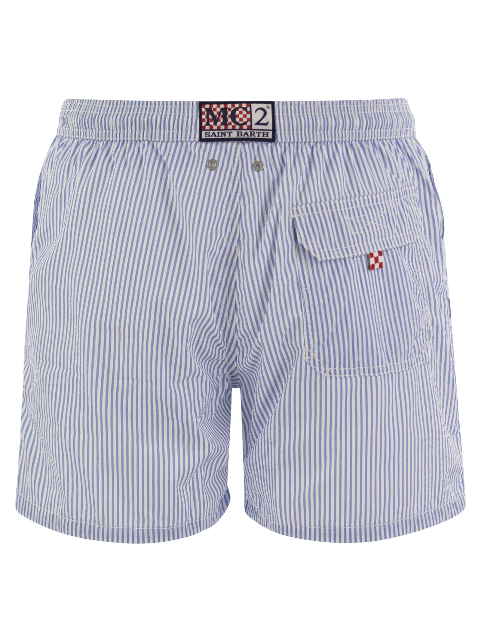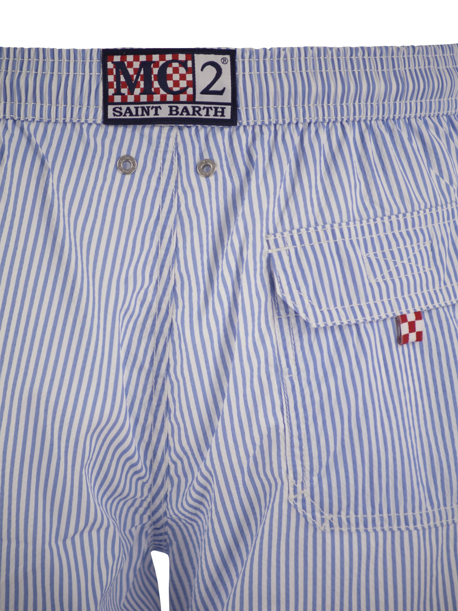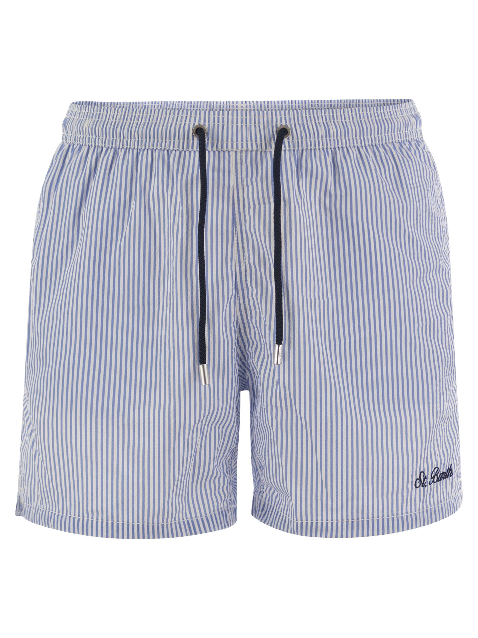 The Patmos swim shorts, made from a structured polyester fabric, offer a cotton-like feel. Embellished with contrasting stitching and drawstrings, as well as the exclusive Saint Barth logo detail embroidered on the leg bottom. Features a back pocket with flap and Velcro fastening. This version is made from a quick-drying seersucker fabric with a vertical pinstripe pattern. - Patmos mid-length swimming shorts - Quick-drying seersucker fabric - Exclusive Saint Barth logo detail on bottom leg - Comfortable elasticated waistband - Adjustable drawstring with branded ends - Mesh lining - Right-hand side pocket with zip - Back patch pocket with Velcro closure - Signature eyelets designed to drain water and prevent ballooning - Exclusive MC2 Saint Barth label on the back - Classic fit DESIGNER ID: PATM001 00274F