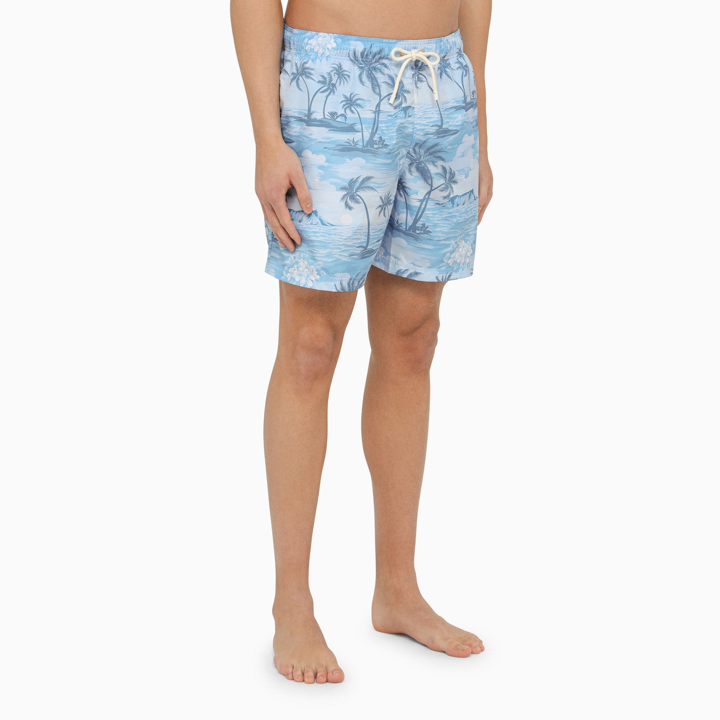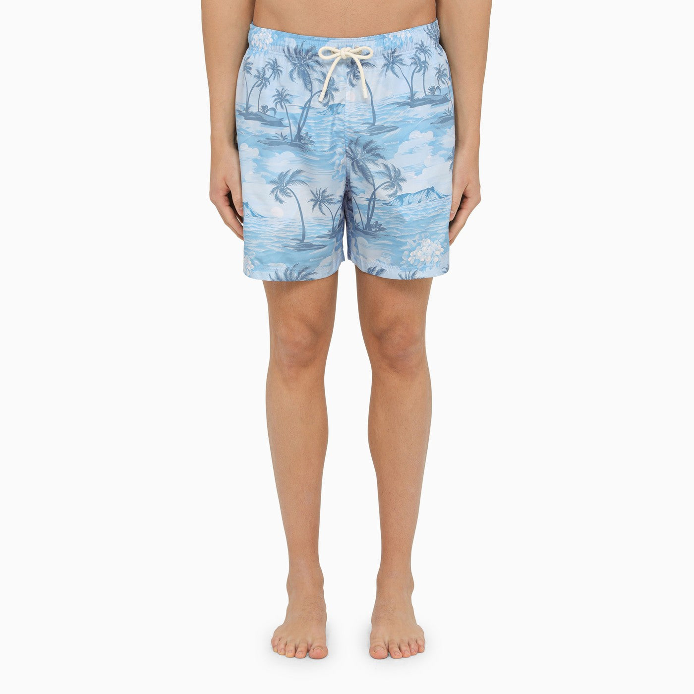 Swimming costume by Palm Angels in indigo blue nylon, featuring Sunset print, elasticated waistband with drawstring, two side welt pockets and a flap pocket with logo patch on the back.