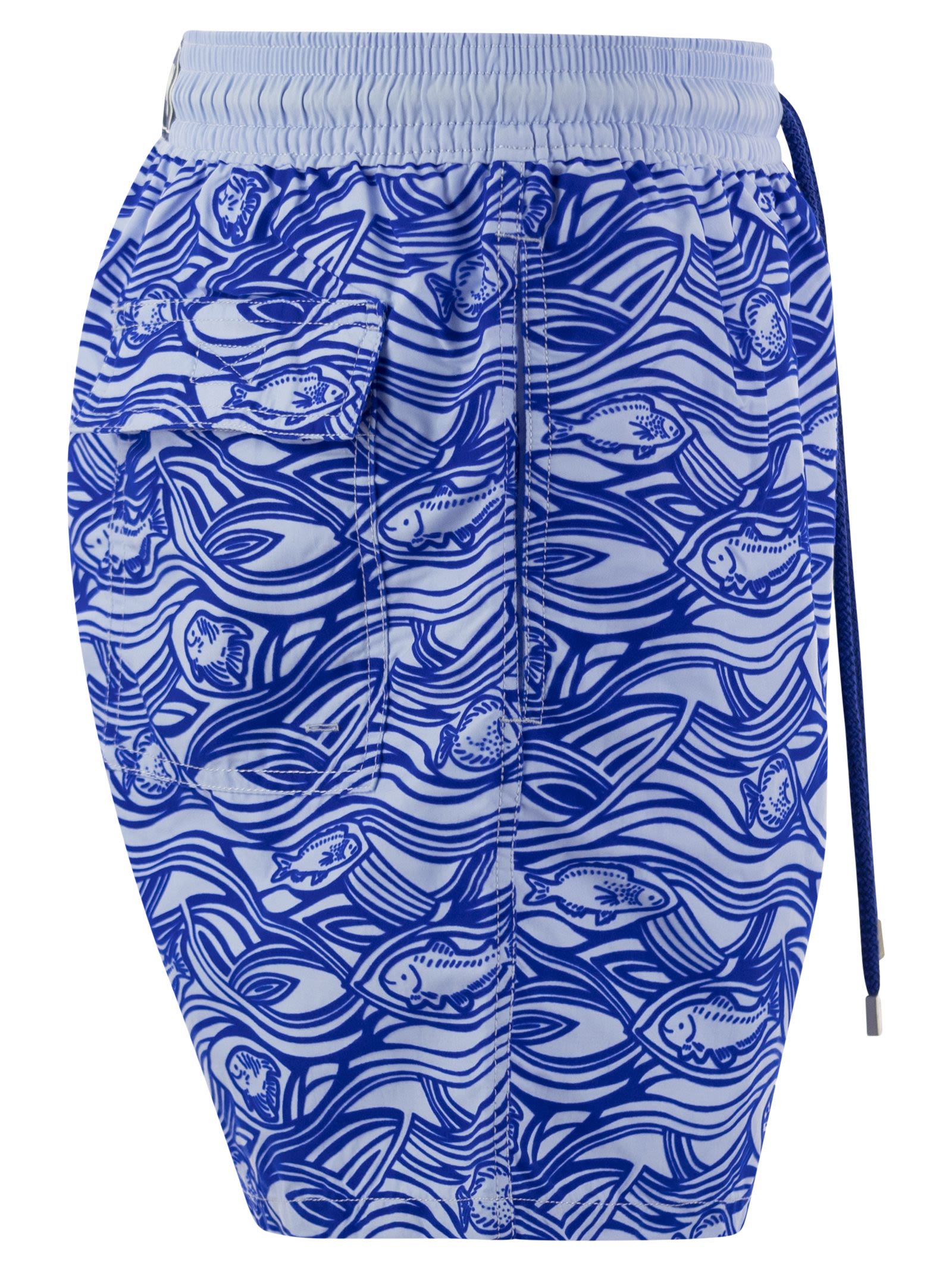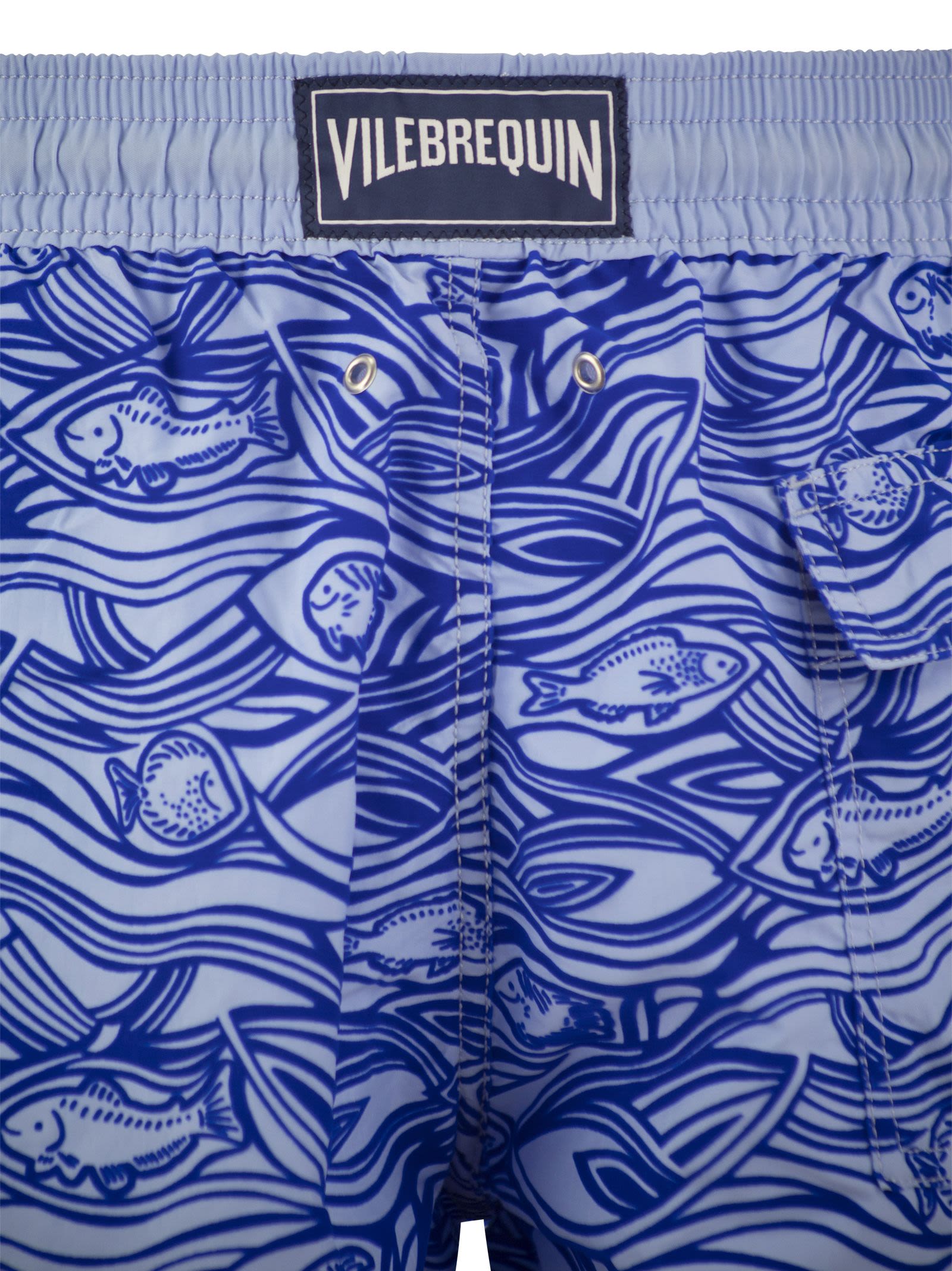 The flocked velvet fabric of this men's swimming costume is sure to attract attention at the beach or poolside. Made of recycled polyamide, with elastic waistband and drawstring. - Swimming costume with elasticated waistband with drawstring and zamak ends with Vilebrequin engraving - Side pockets - Hand-sewn back pocket for perfect visual continuity with the swimming costume print - Two rear eyelets allow water to drain away to reduce the "balloon" effect when getting out of the water - Integral water-resistant mesh lining (100% polyamide) - Fabrics are treated for quick drying - Men's Flocked Aquarium Shorts DESIGNER ID: MOOAD205 603