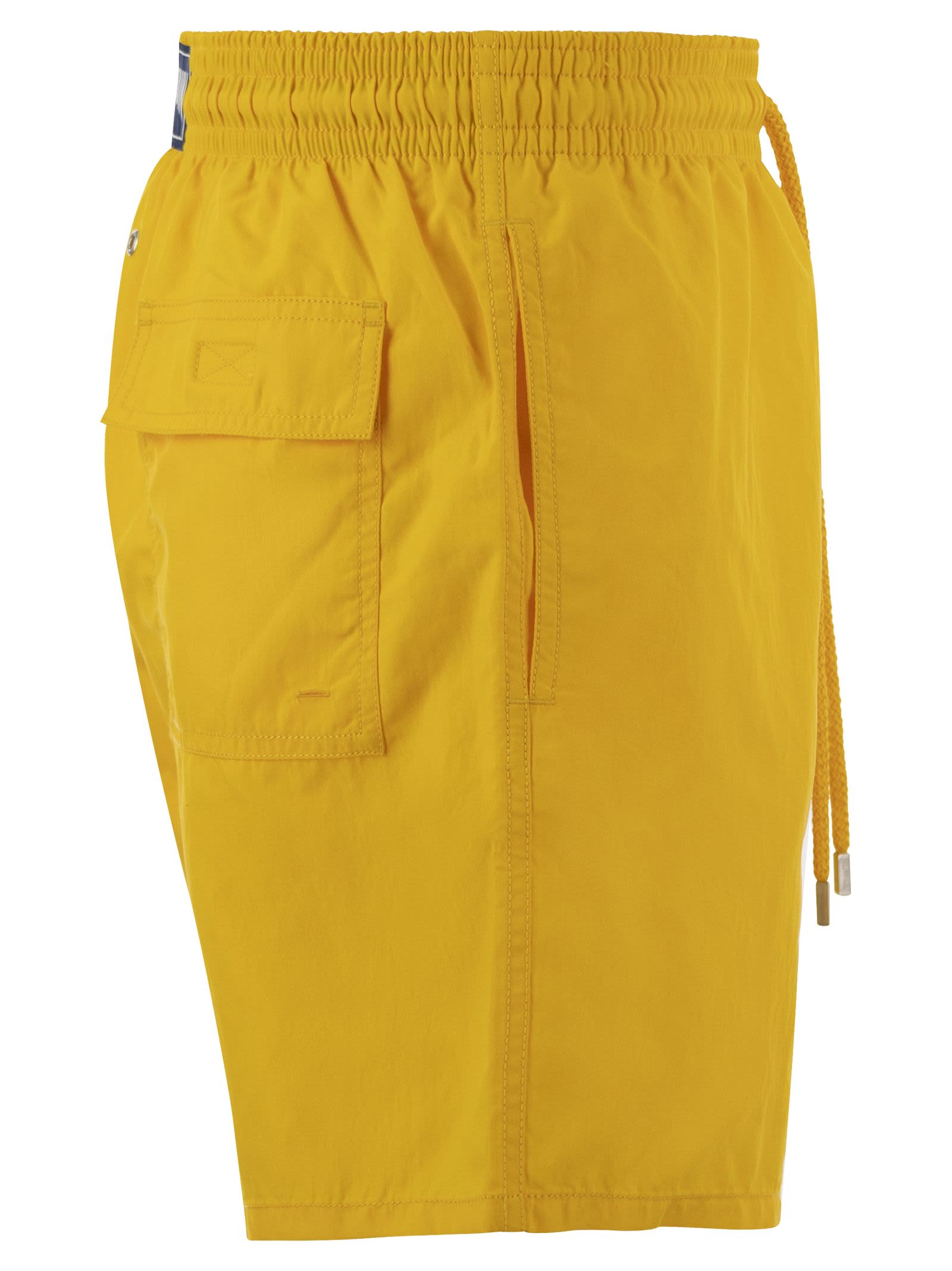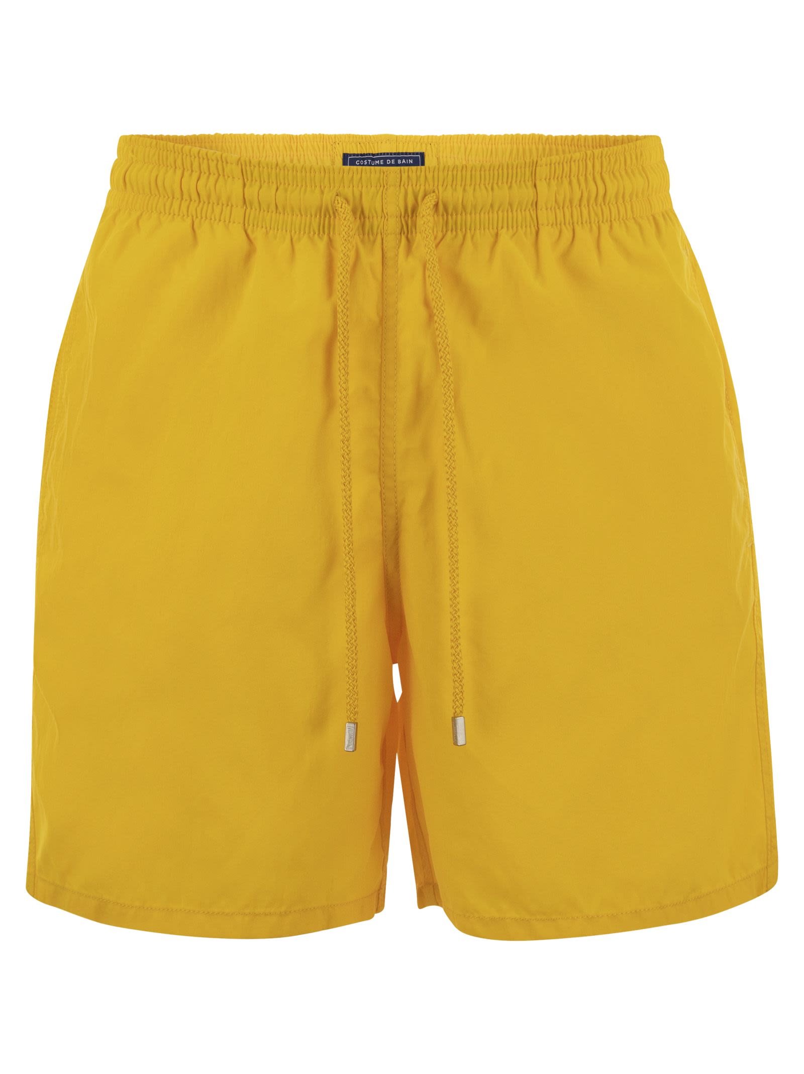 Vilebrequin's casual elegance is embodied by the perfect lines of our men's swimming costume Moorea, a timeless style icon with drawstring, pockets and eyelets. - Swimming costume with elasticated waistband (four seam lines) and drawstring for perfect adjustment - Stretch swimming costume twill fabric with velvet-effect finish for extra softness - With special treatment for ultra-quick-drying men's swim shorts Optimum comfort and fit thanks to the seamless inner brief (100% polyamide) integrated into the swimwear - Solid-coloured men's boardshorts - Men's boardshorts ideal for combining elegance and sophistication - Eyelets and back pocket designed to drain water (and avoid balloon effect) - Drawstring swimming costume with Vilebrequin logo engraved on the ends in stainless zamak - Hand-sewn back pocket for perfect visual continuity with the swimming costume print DESIGNER ID: MOOC4A00 115