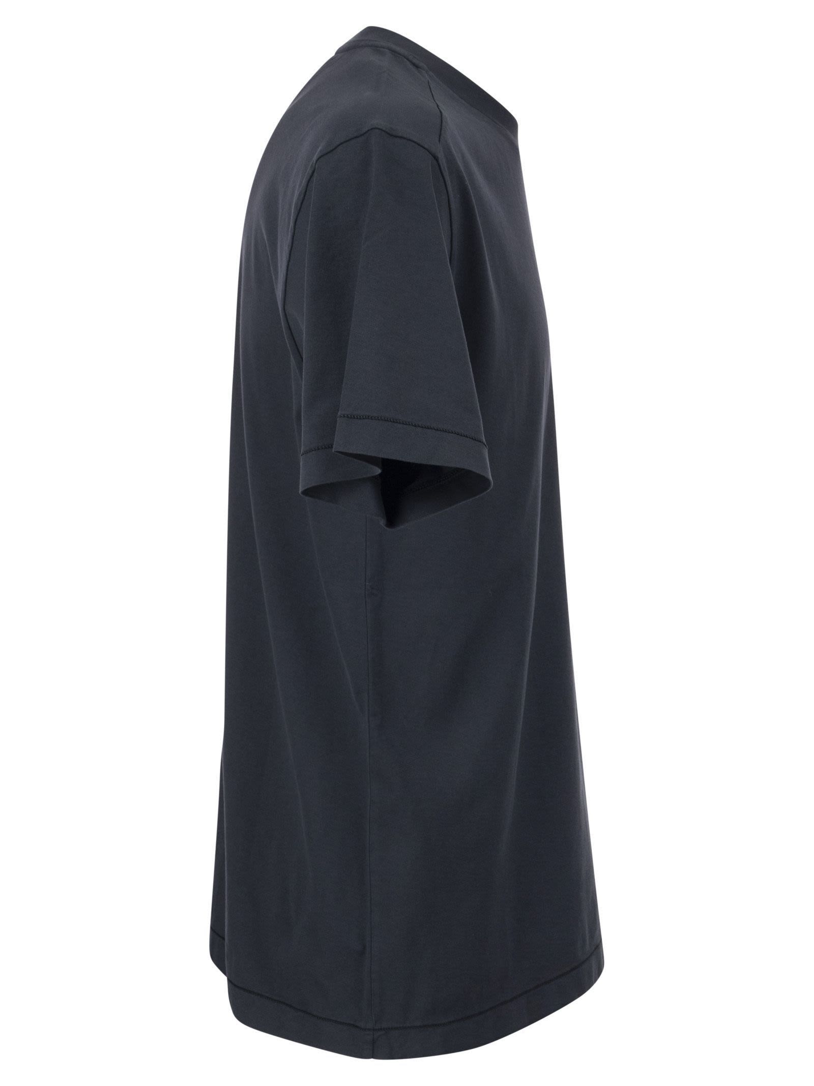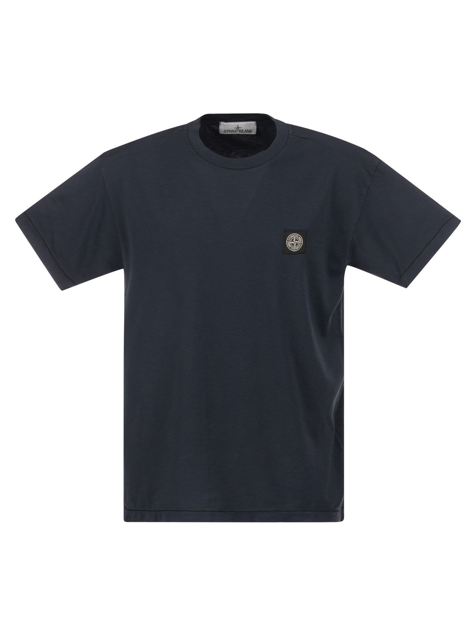 Stone Island presents a brand icon... This short-sleeved, 60/2 cotton jersey t-shirt features a garment dyed, ribbed neckline and Stone Island logo patch applied to the chest. Chain stitch on the bottom sleeve and bottom hem. - Slim fit - Logo patch at chest - Regular fit DESIGNER ID: 801524113 A0020