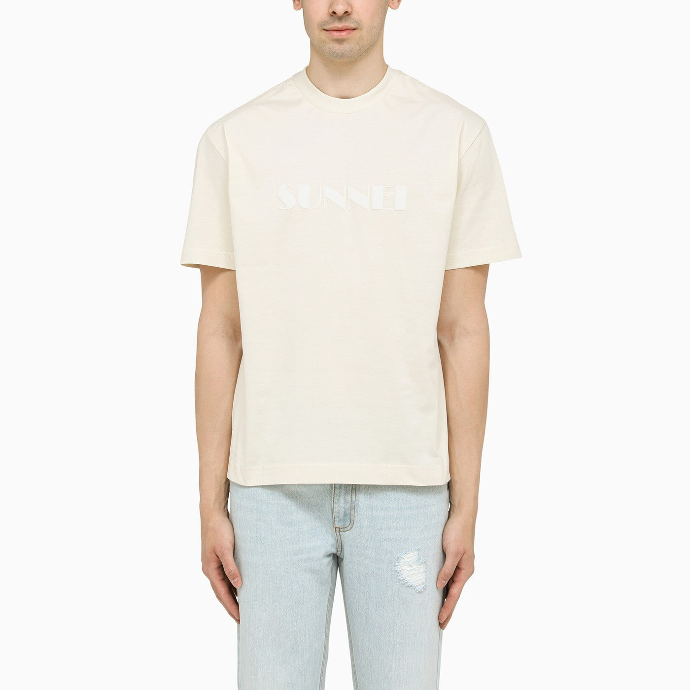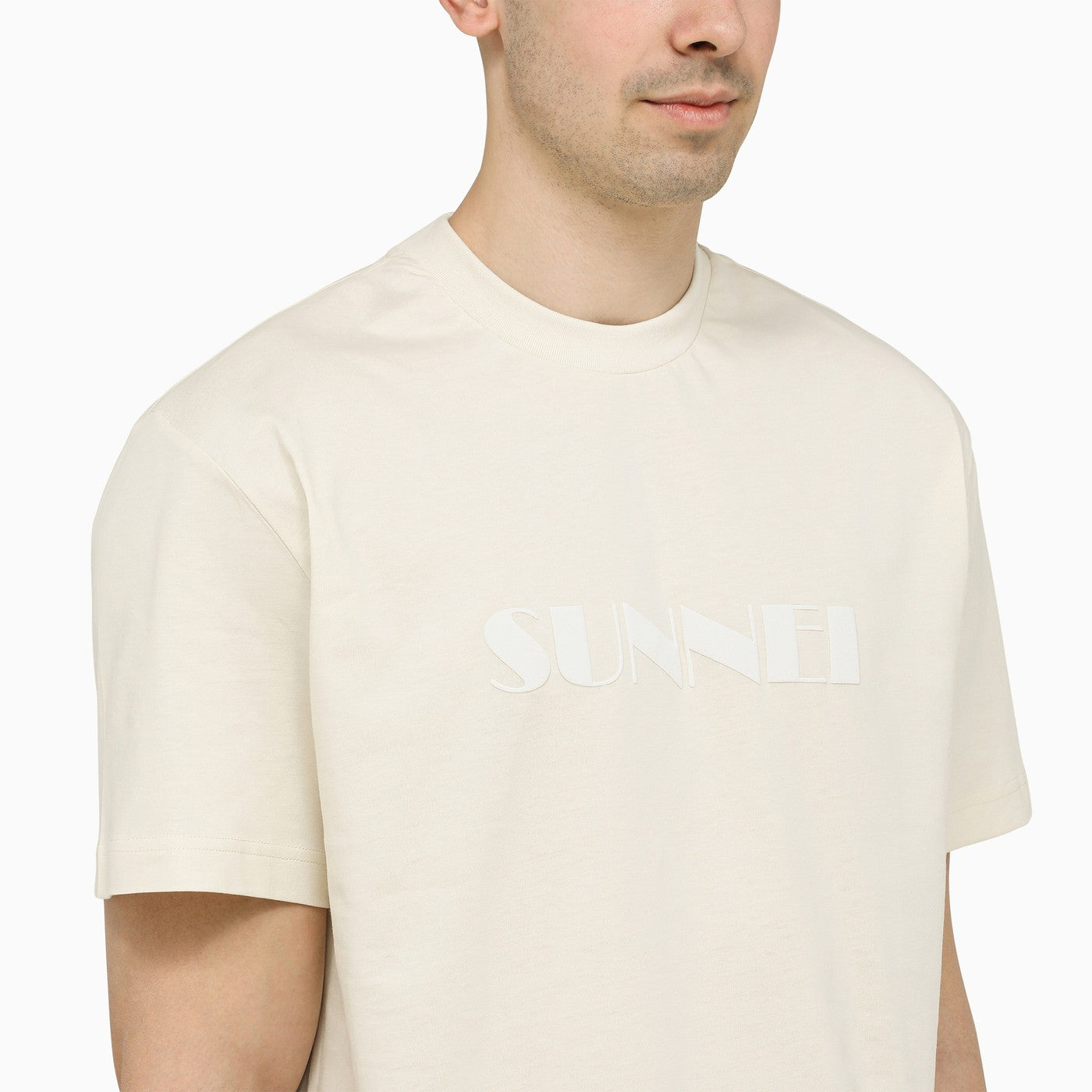 Beige cotton jersey regular T-shirt by Sunnei featuring a printed logo on the chest, short sleeves and a straight hem.