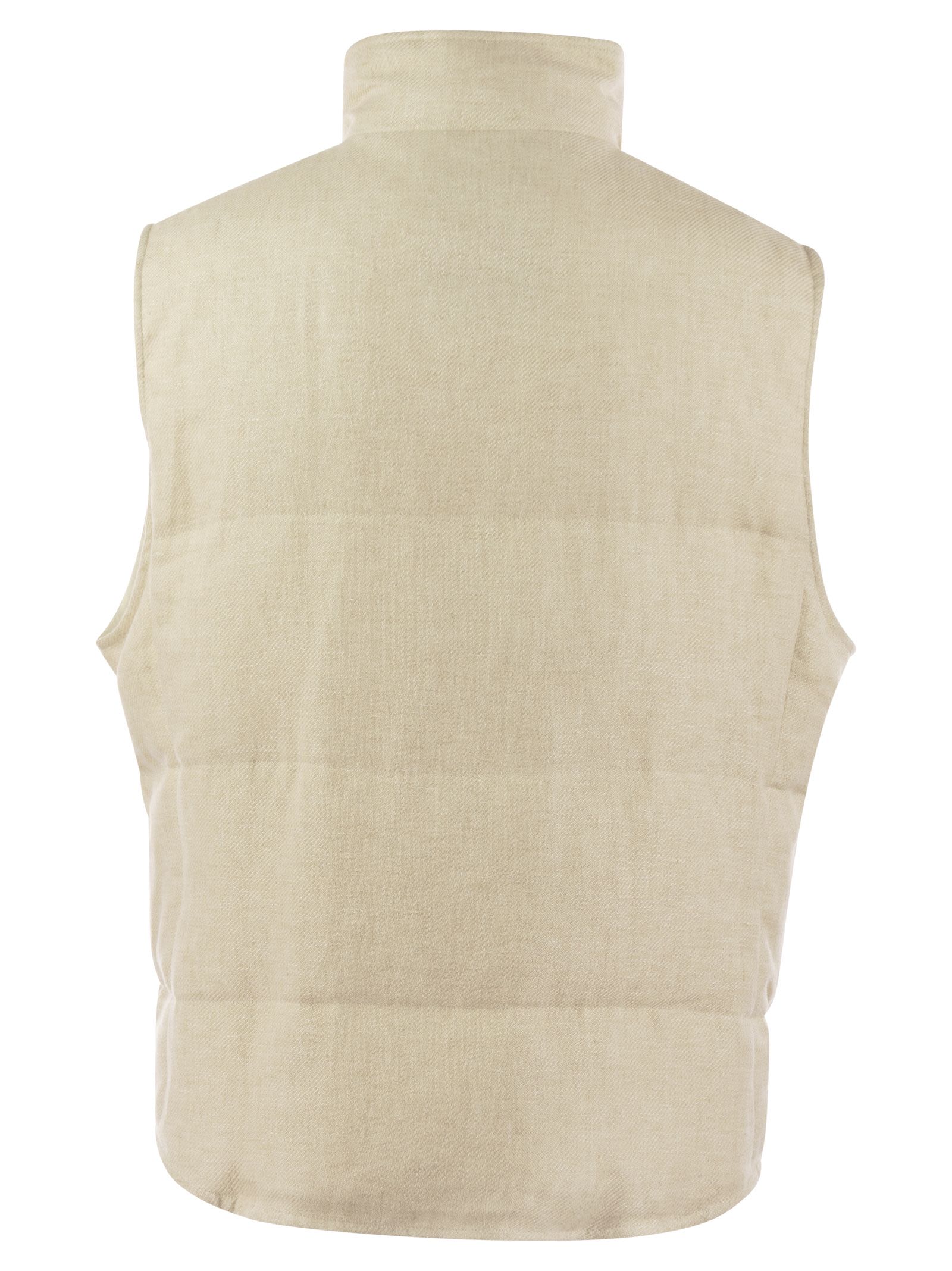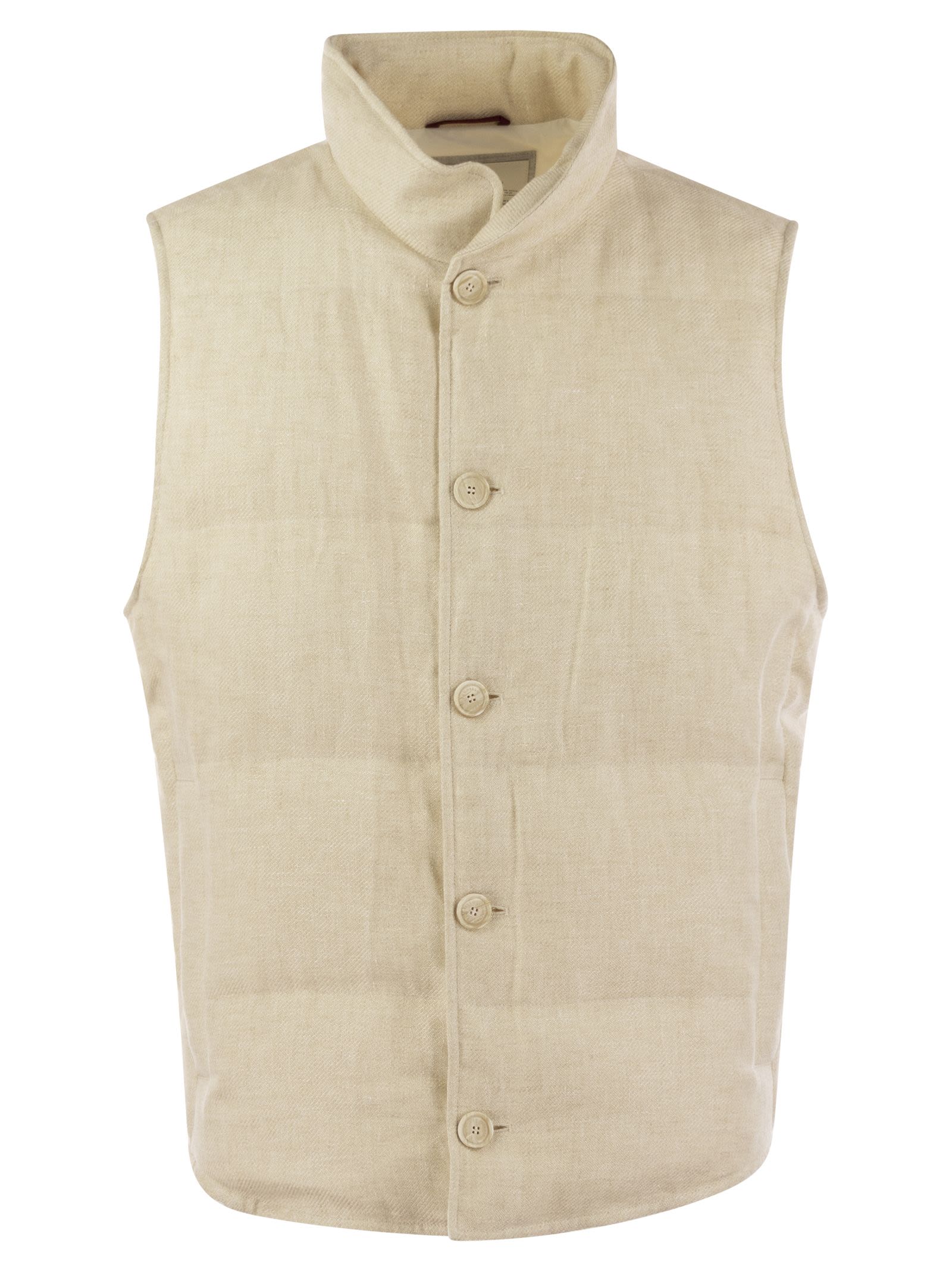 The high-quality Brunello Cucinelli materials enrich the versatile and sophisticated style of the sleeveless down jacket. The fresh texture of the natural fibres is combined with the high-quality 25-gram goose feather filling, making this waistcoat the ideal garment to wear over jackets, topwear and sweaters, especially at the beginning of the season. The matt nylon lining offers a sporty texture and a contrasting colour note. - Button fastening - Small collar - Water-repellent nylon lining - Two inside button pockets and one pen pocket - Low pockets with snap button DESIGNER ID: MW4821852 CDH81 C.V.