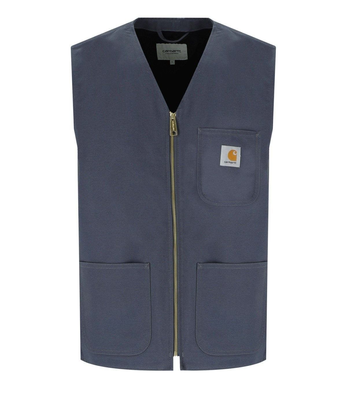 Carhartt Wip Arbor Vest made of blue cotton canvas with contrasting lining. Front pockets with logo patch and zip closure. Relaxed fit. The model is 186 cm tall and wears size M. Composition: 100% cotton.