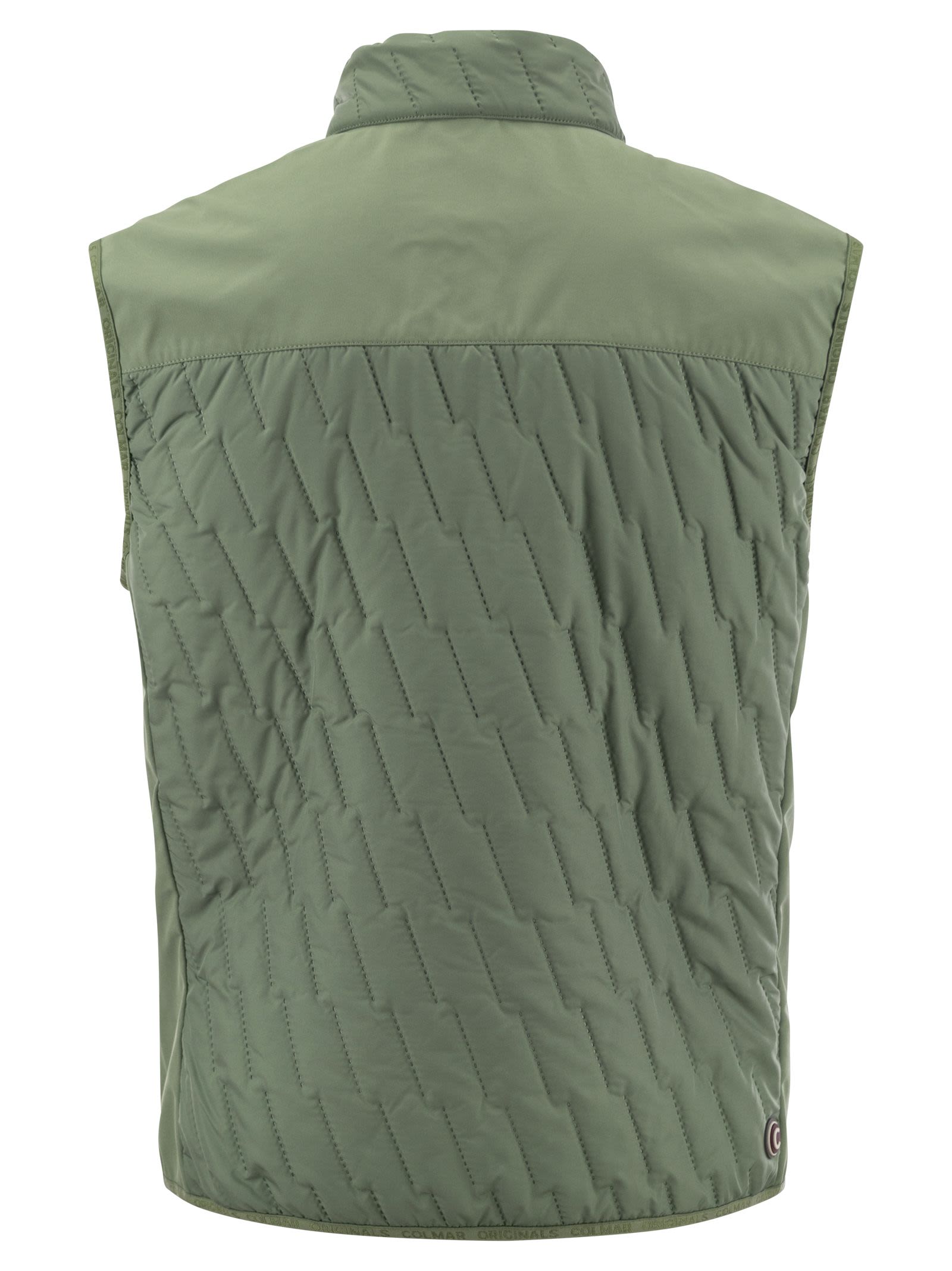Men's sleeveless jacket padded with light wadding and made of 3-layer matt fabric. The union, thanks to ultrasonic stitching, between the outer fabric, the lightweight wadding and the inner lining creates a water-repellent thermal material. The mix of smooth softshell inserts and the diagonal quilting pattern combines style and practicality of movement, giving this garment an edgy look. - Regular fit - Lightweight - Zip closure - Side pockets and inside zip pocket - Elastic ribbon on armholes and hem - Light padding - Colmar Originals logo applied to chest DESIGNER ID: 1154 4XM 647