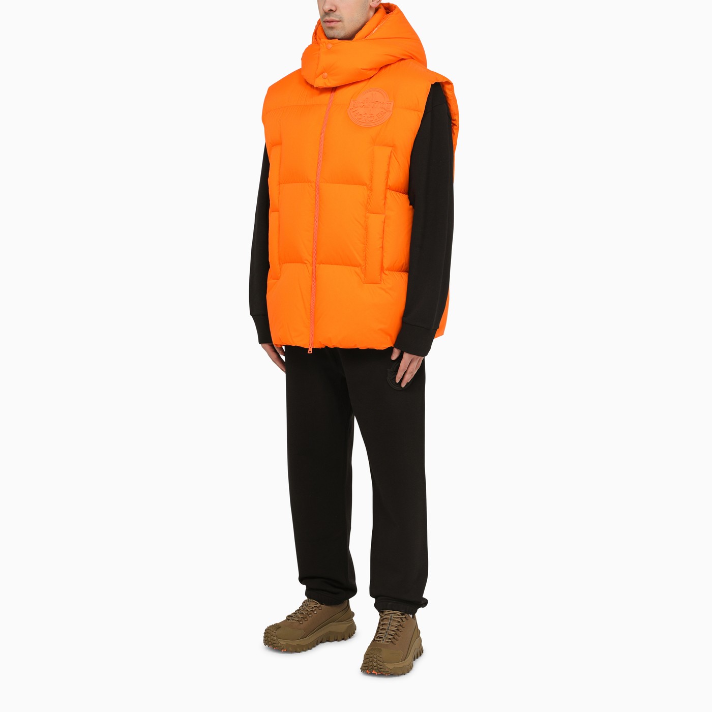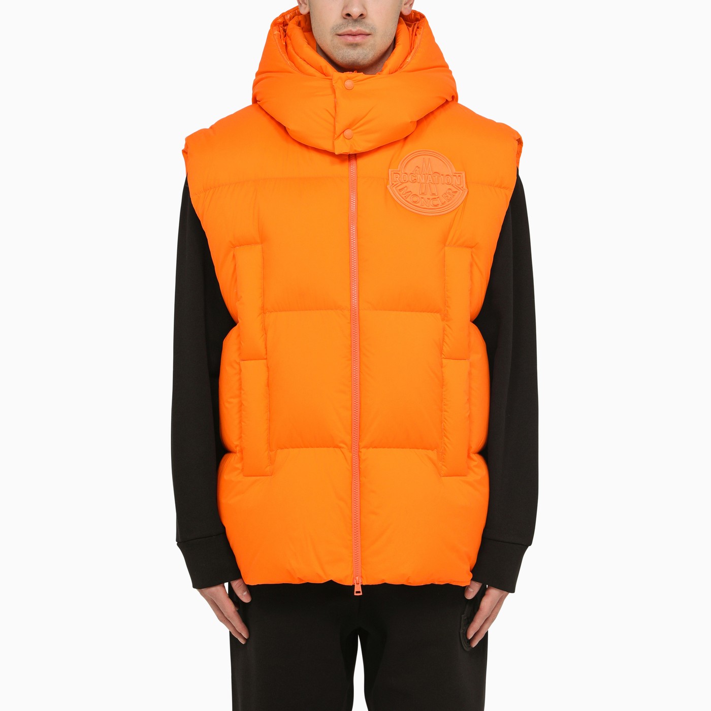 Padded gilet by Moncler X Roc Nation designed by JAY-Z in opaque orange nylon, featuring a removable hood, front zip fastening, down filling, tone-on-tone logo patch on chest, two side welt pockets with double opening and elasticated drawstring hem.