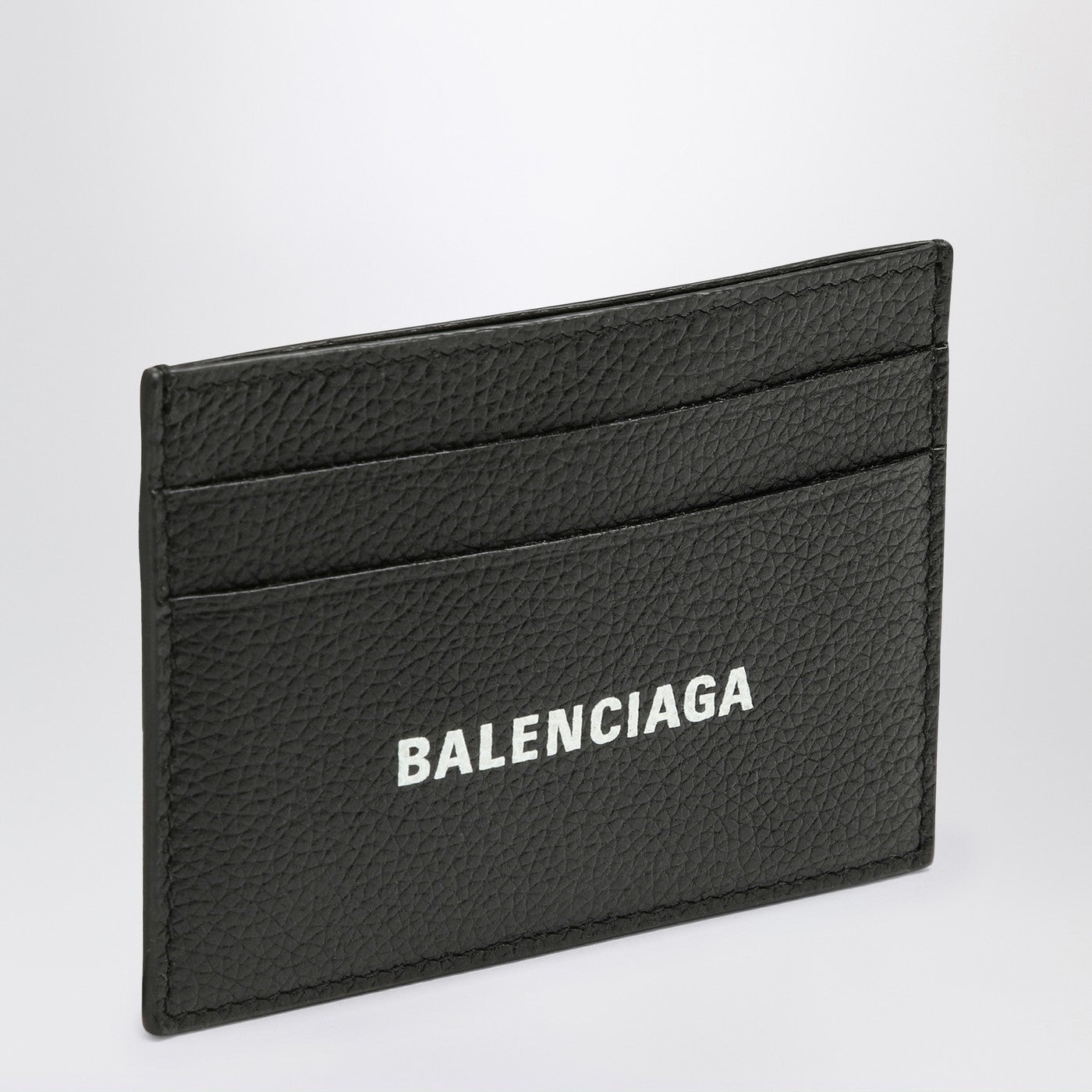 Card holder by Balenciaga in black grained leather, featuring central compartment, six slot pockets for credit cards and contrasting logo print on the front.