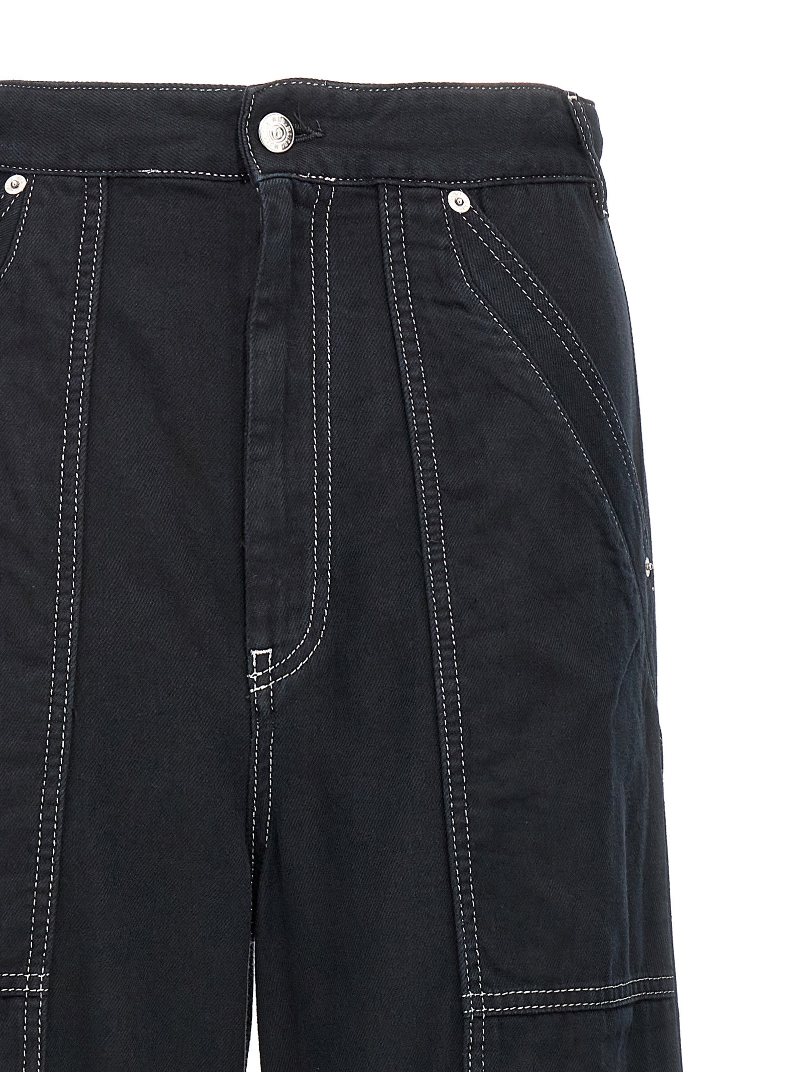 Cotton denim jeans with lurex stitching, zip and button closure, pockets, wide leg.