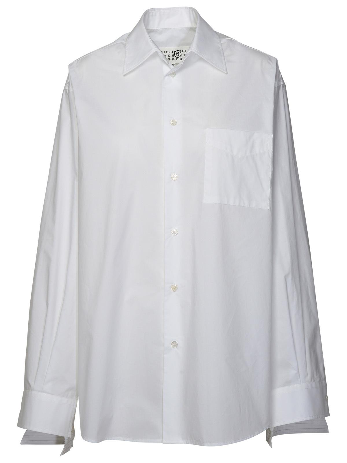 Over fit, pointed collar, front button closure, chest patch pocket, contrast striped fabric on the sides, 'Numeric Signature MM6' label on the side, 'white stitch line' feature on the back, unstructured cuffs with buttons, lowered back hem