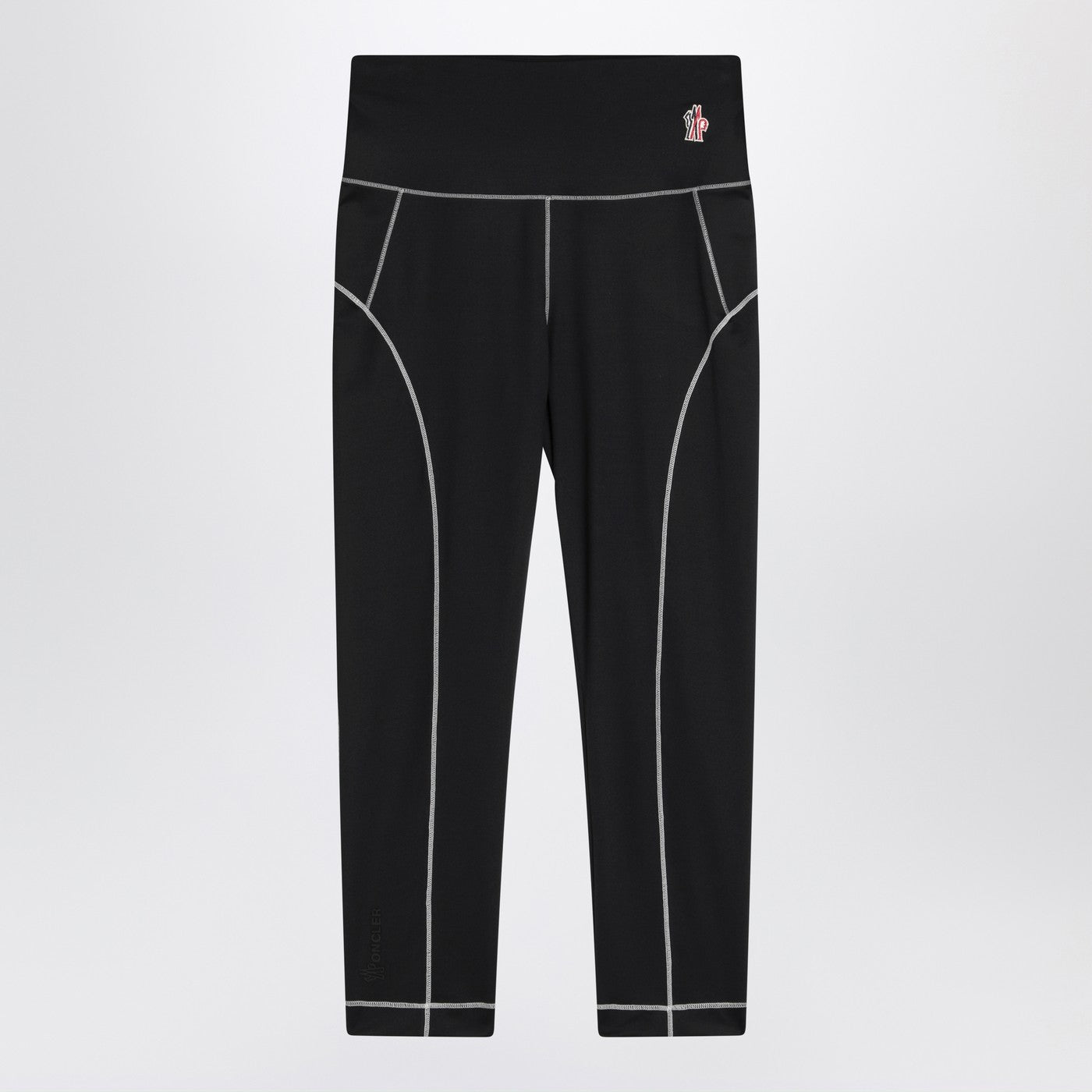 Moncler Grenoble leggings in black stretch nylon blend, characterized by a high waist, contrasting white stitching, logo patch on the front, and tone-on-tone lettering logo on the side.