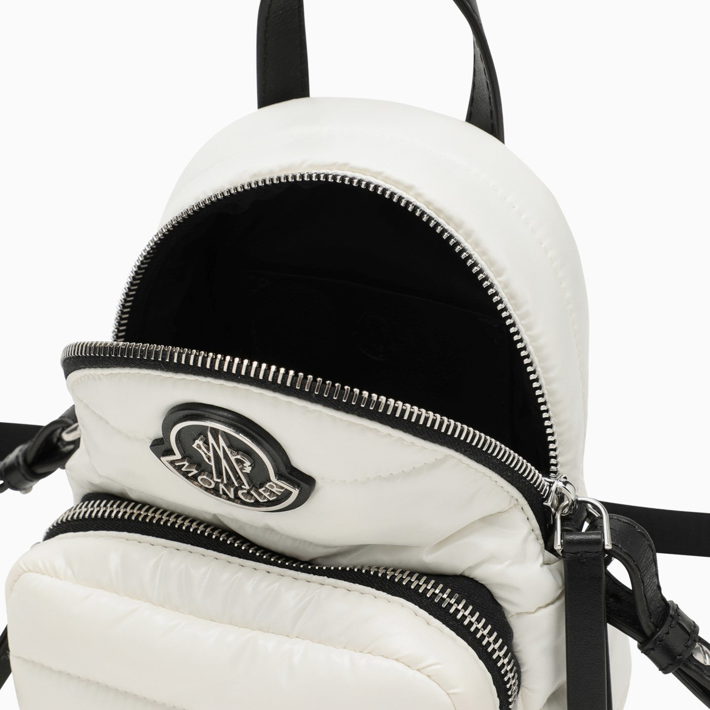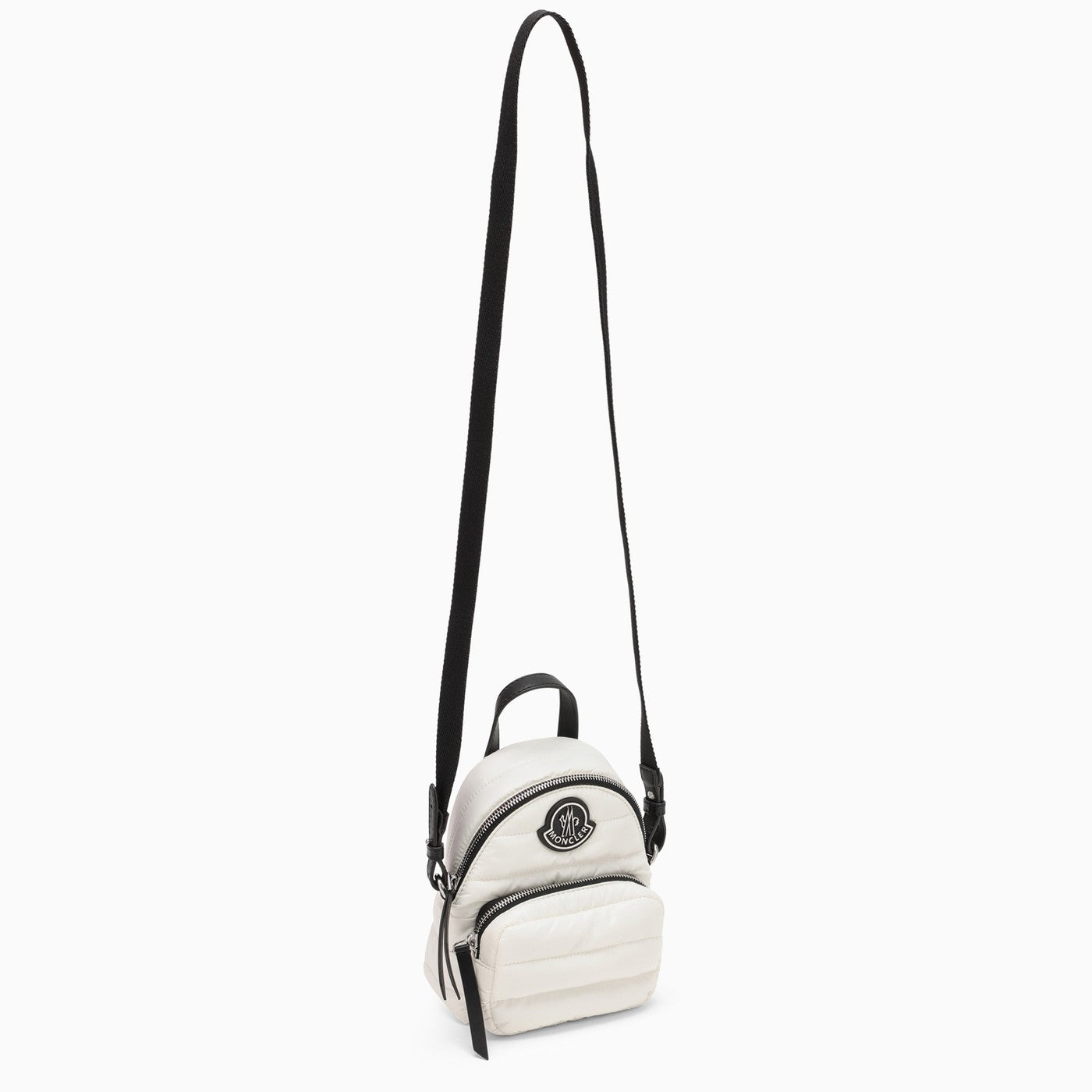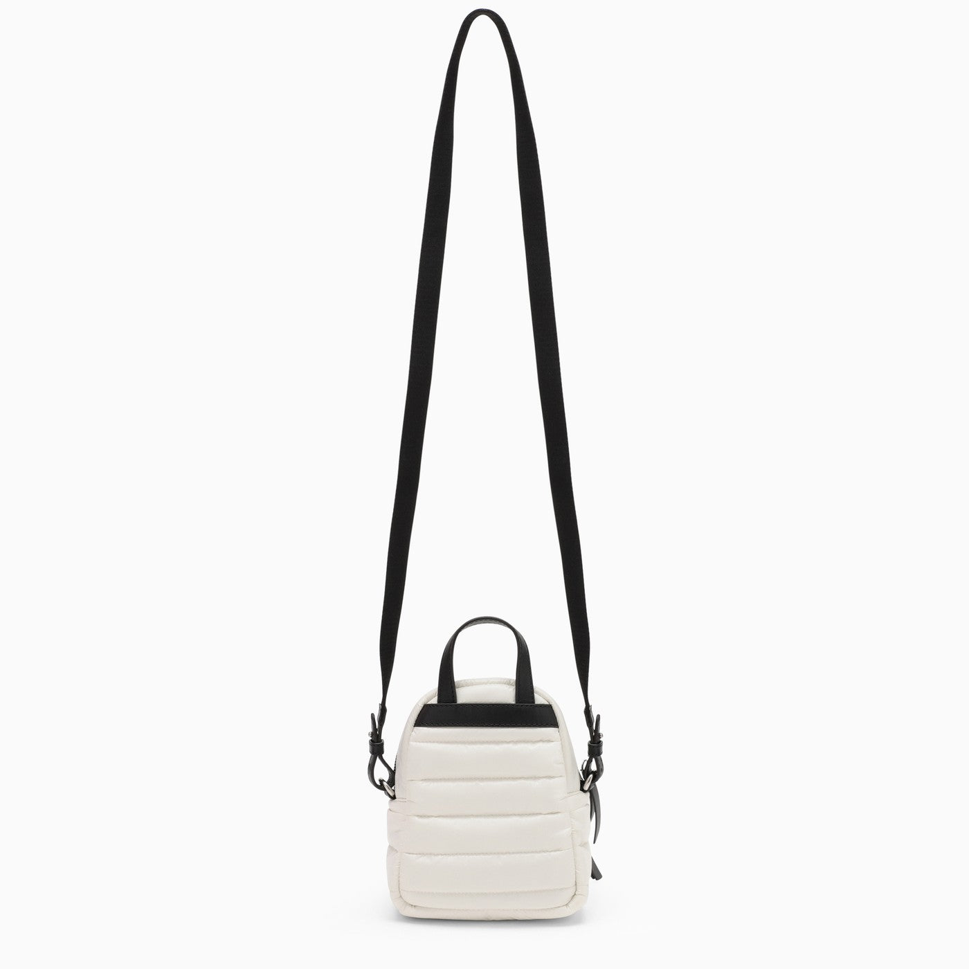 Small white quilted nylon bag from Moncler featuring an adjustable and removable shoulder strap, a front zipper pocket, zipper closure, top handle and leather details, an interior flat pocket and contrasting logo patch on the front.