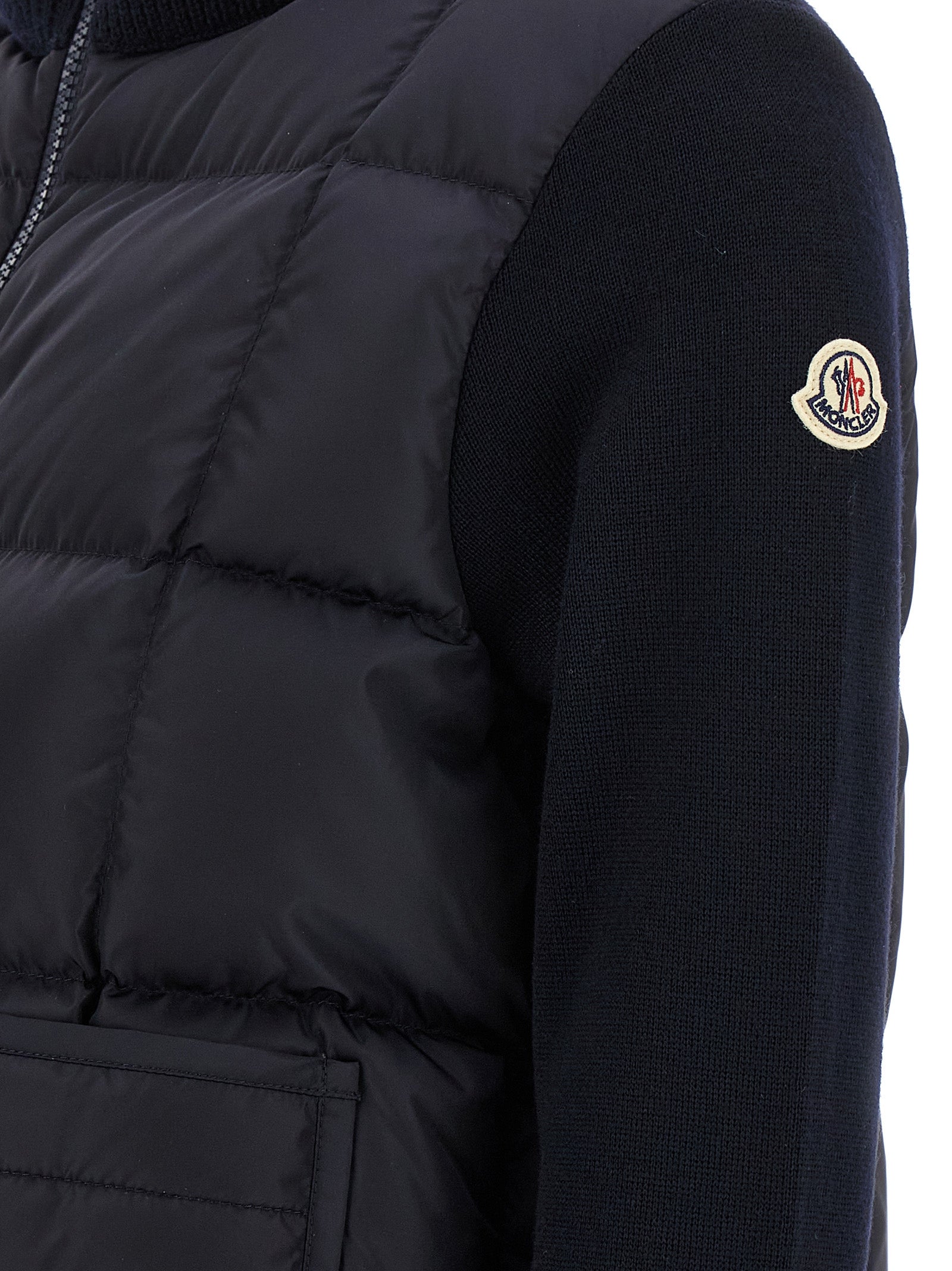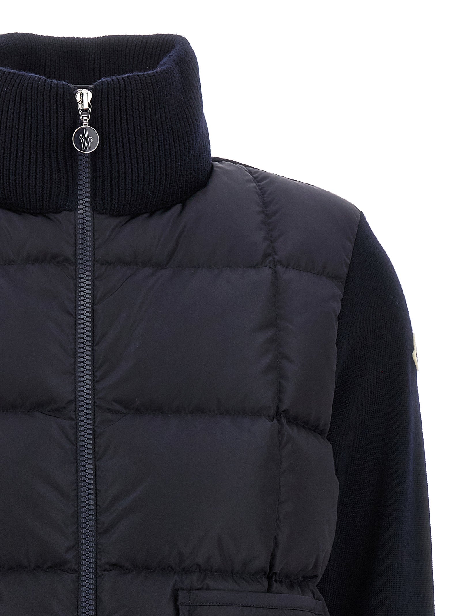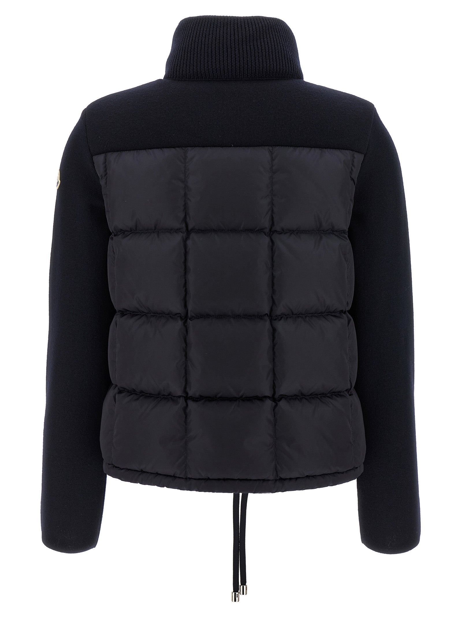 Fineness 14 merino wool cardigan with quilted saison quilted longue vest, goose down padding, high neck, front zip closure, pockets, long sleeves with felt logo patch, drawstring on the hem.