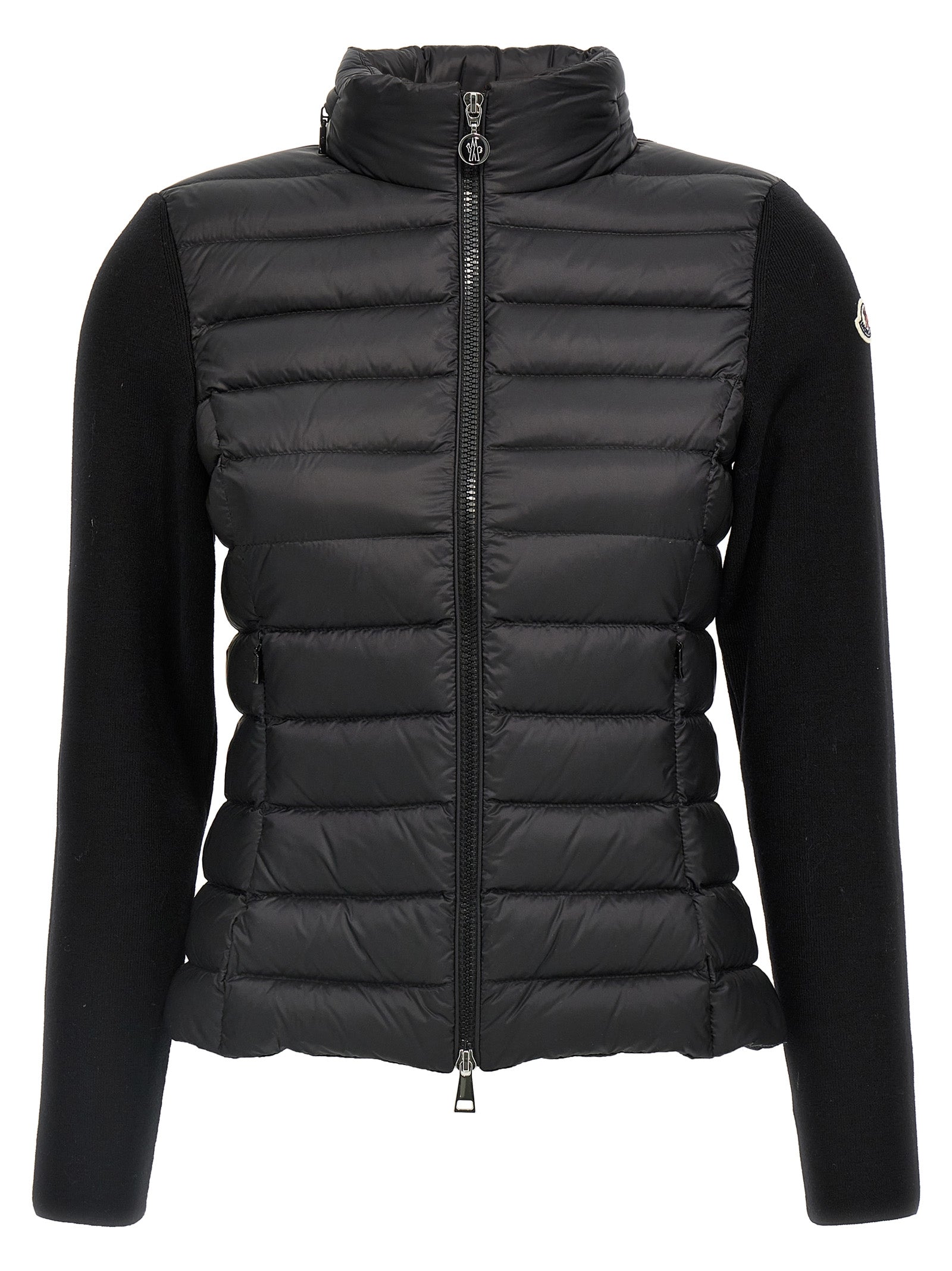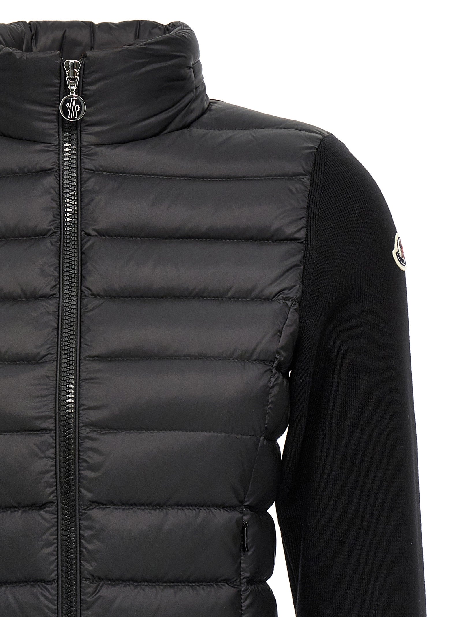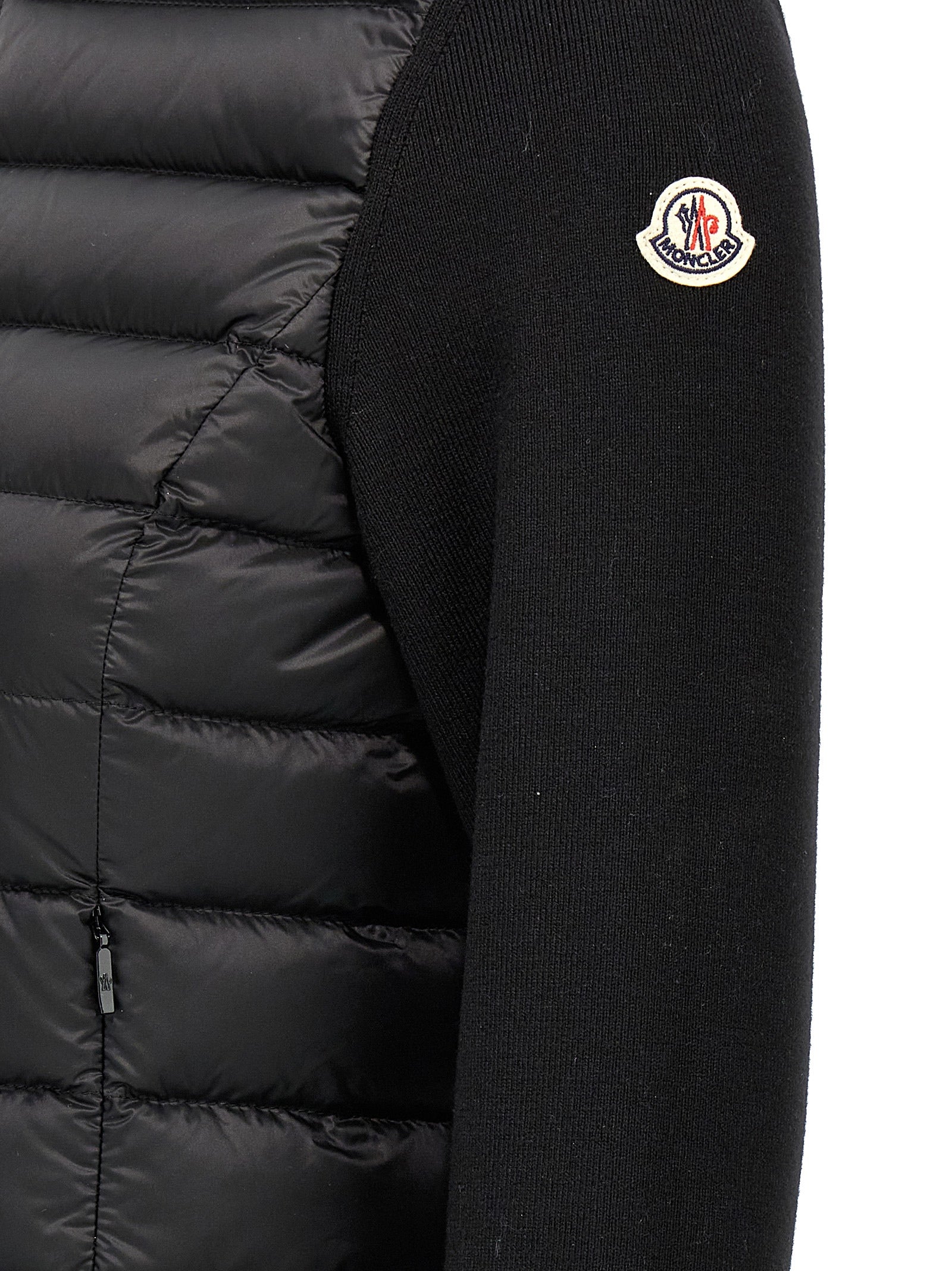 Two-material nylon cardigan padded with feather and extra fine stretch merino wool, zip closure, pockets, standing collar with removable hood in saison longue, long sleeves with logo patch.