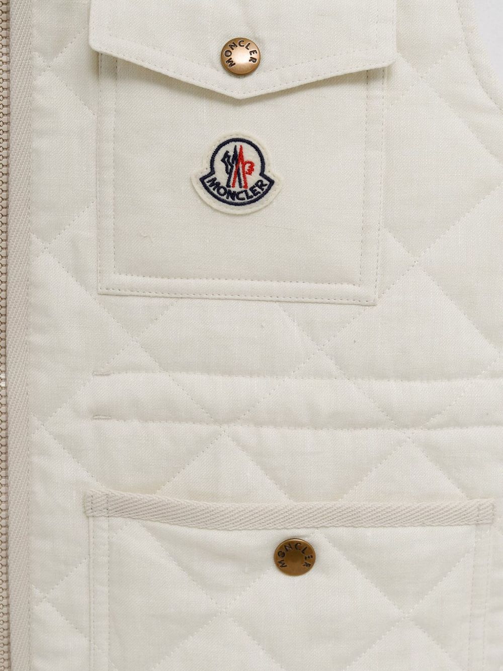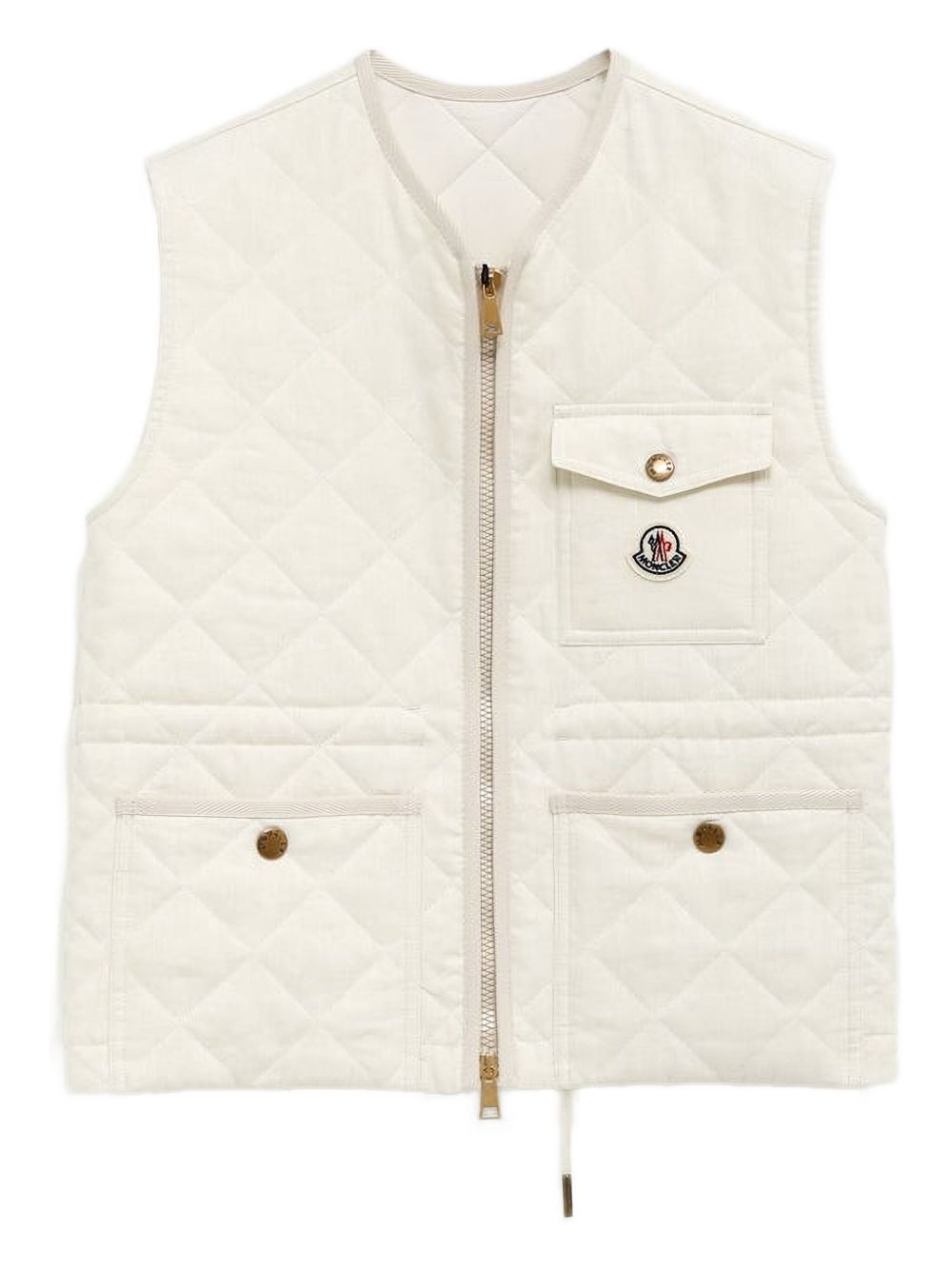 cream colour front zip fastening two patch pockets logo detail diamond quilt pattern drawstring hem