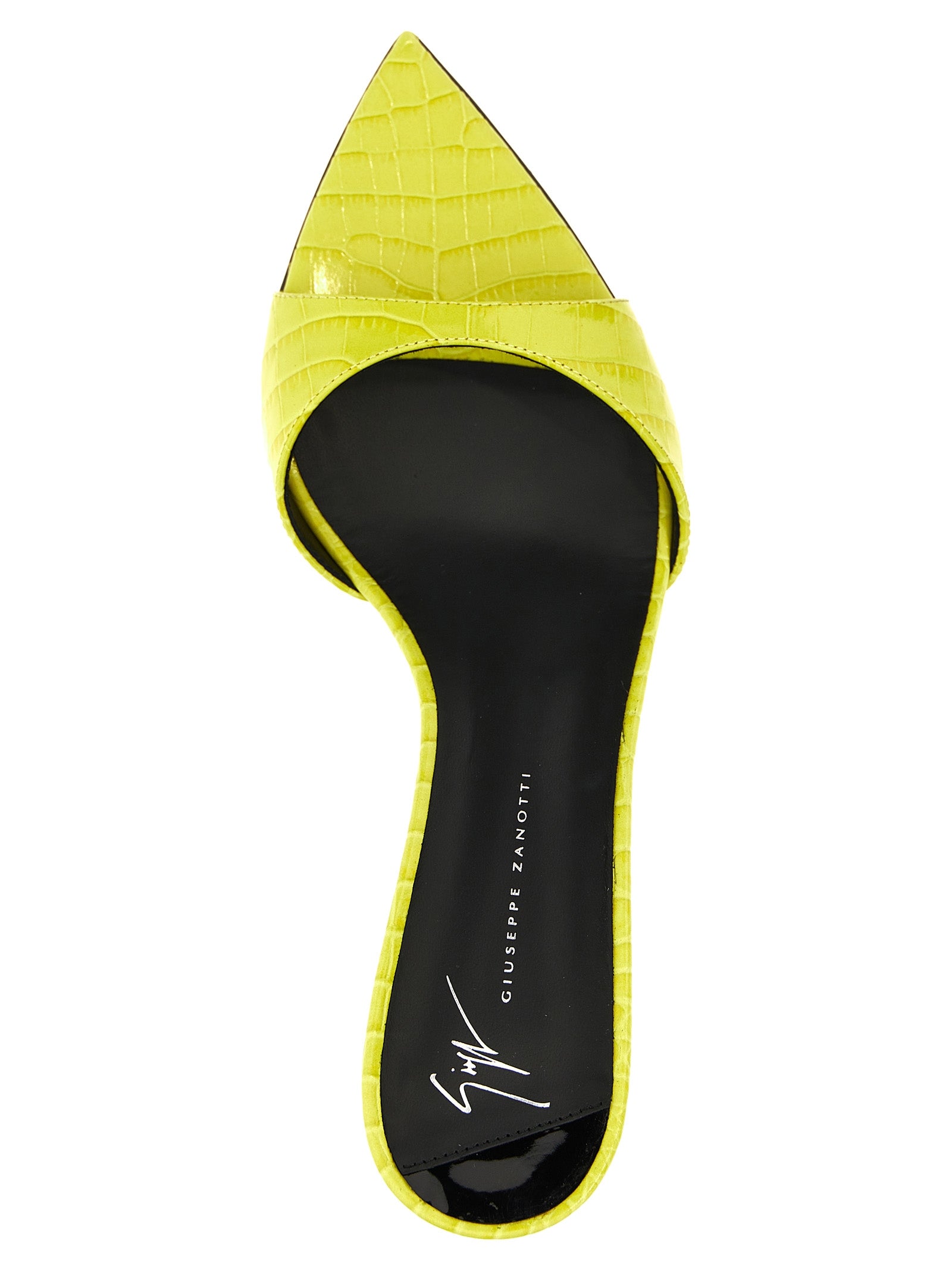 'Intrigo' mule in croc print leather, pointed toe, heel.