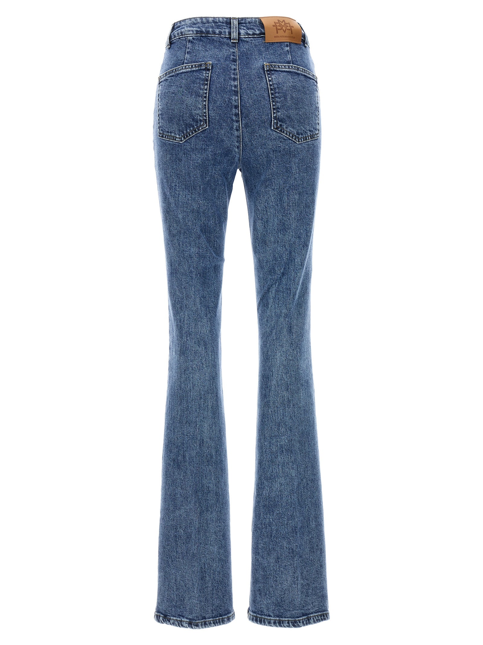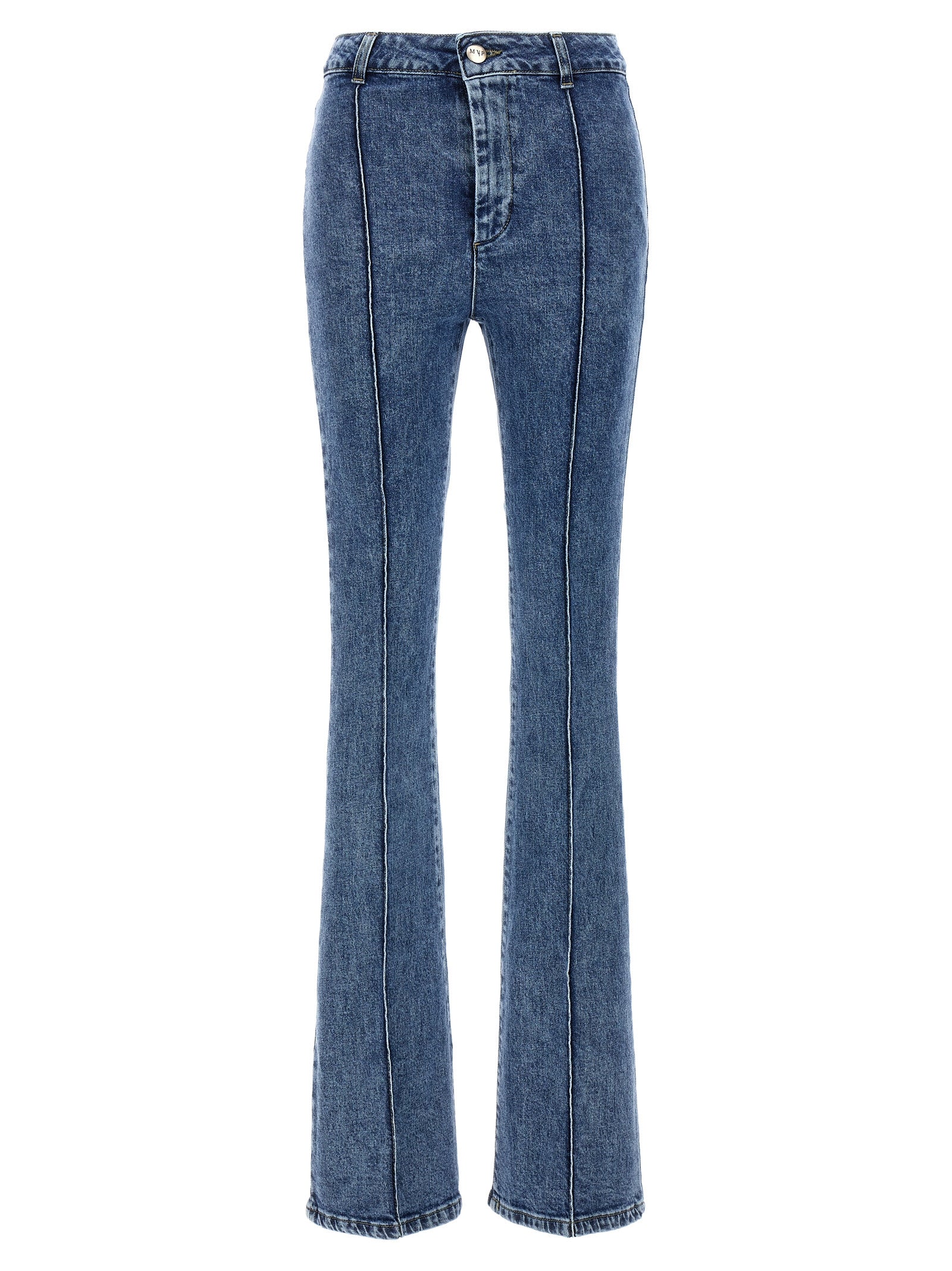 'Bonnet' stretch cotton denim jeans with zip and button closure, pockets, flared leg with central stitching.
