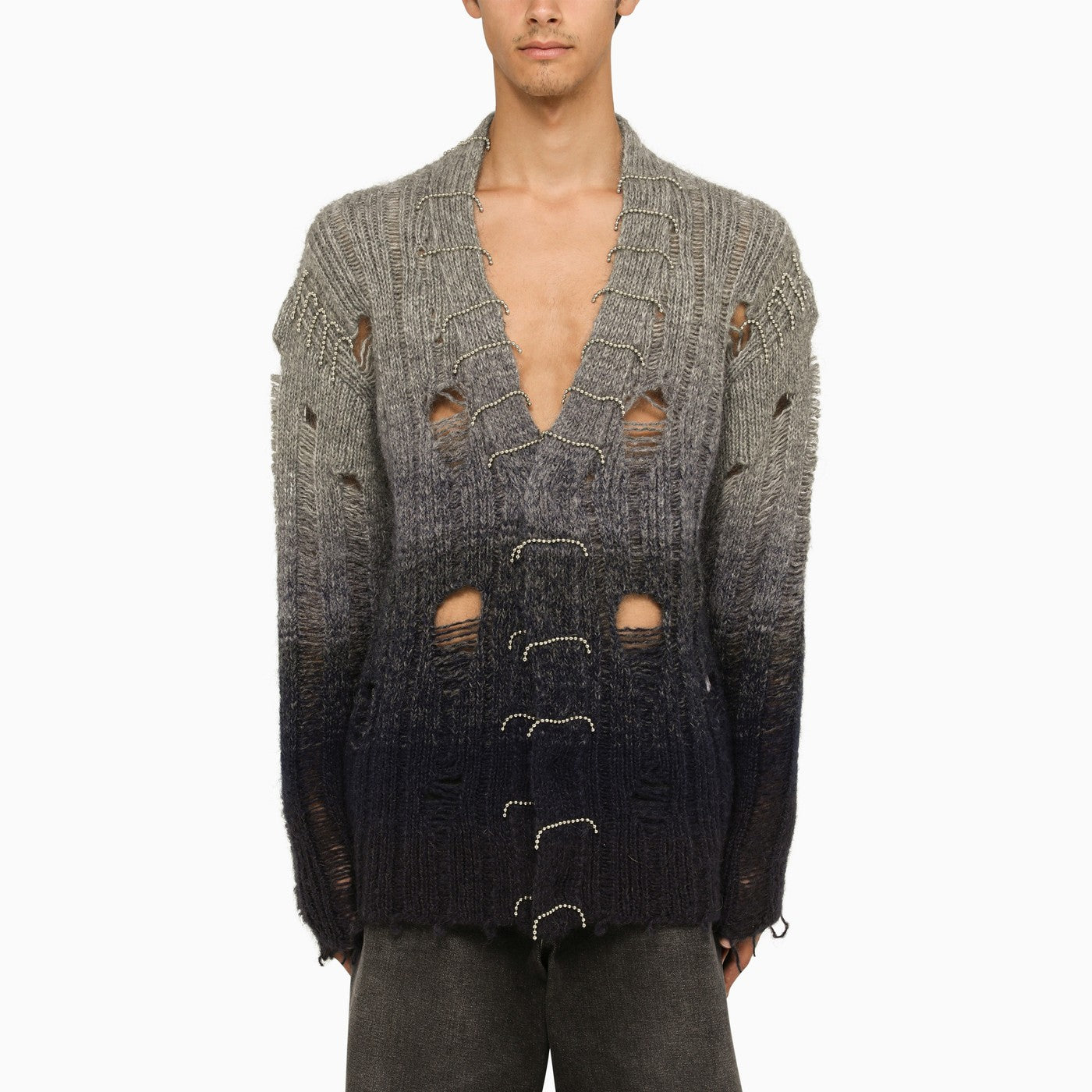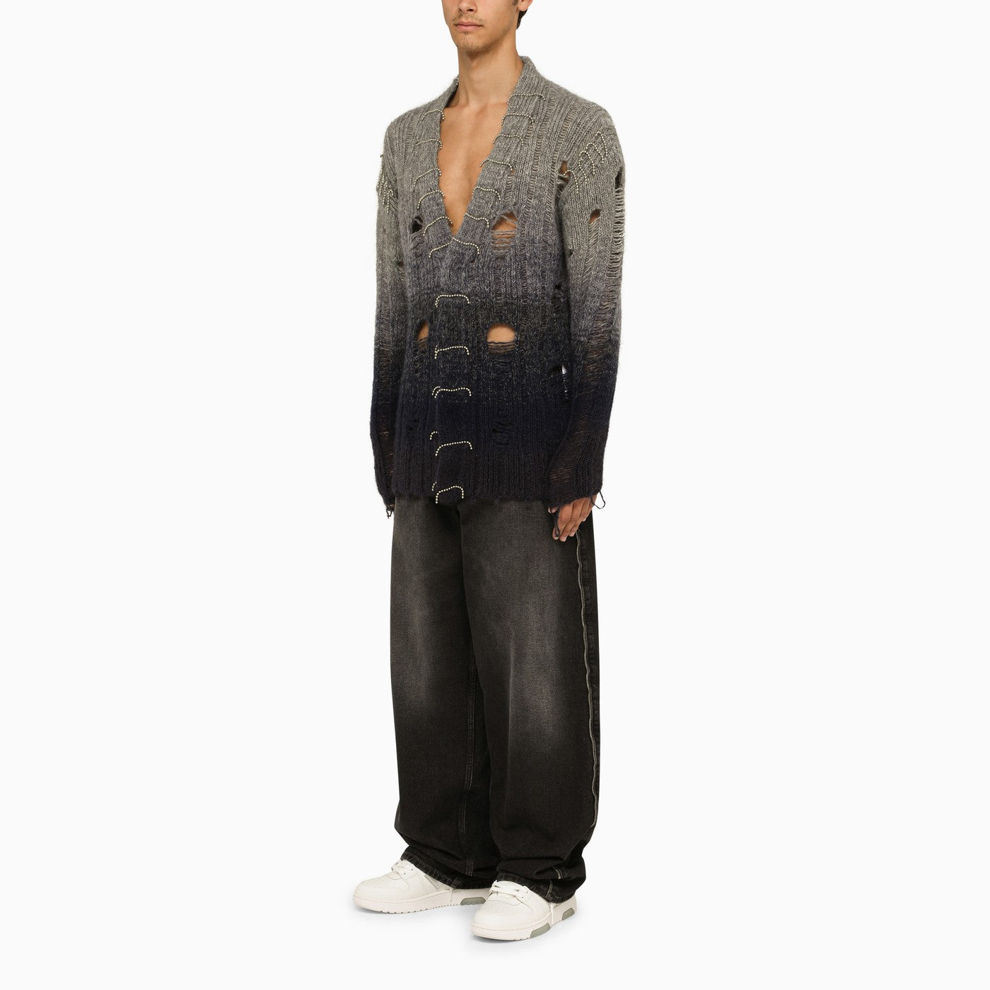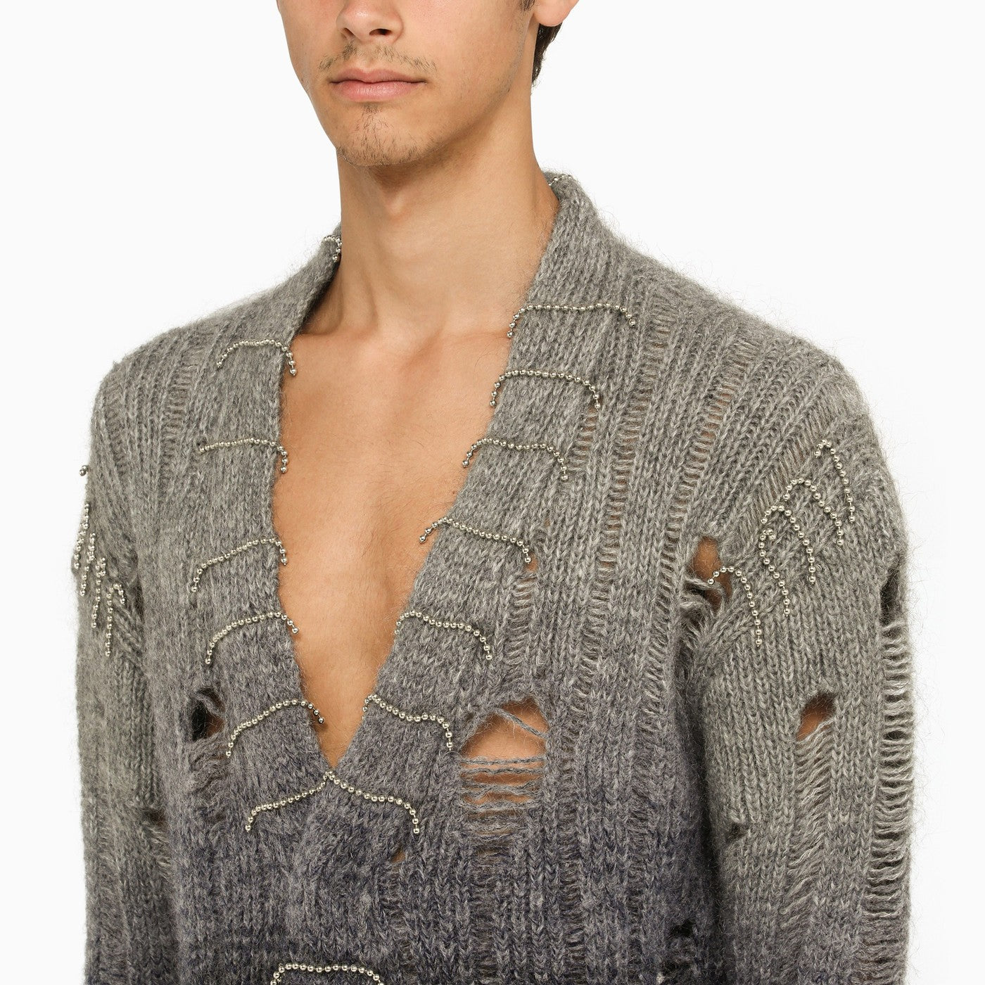 Off-White's grey mohair blend cardigan features localised wear, rhinestone detailing, degradé dyeing and long sleeves.