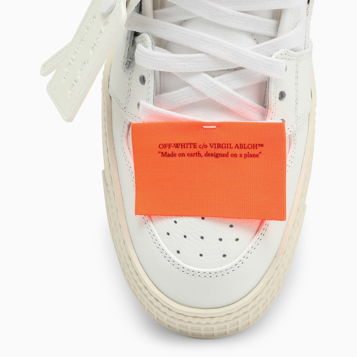 White leather and canvas high-top trainer by Off-White features a black Arrows patch on the side, a lace-up fastening, a perforated round toe, a white Safety tag appliqué, logo tags and a rubber sole.