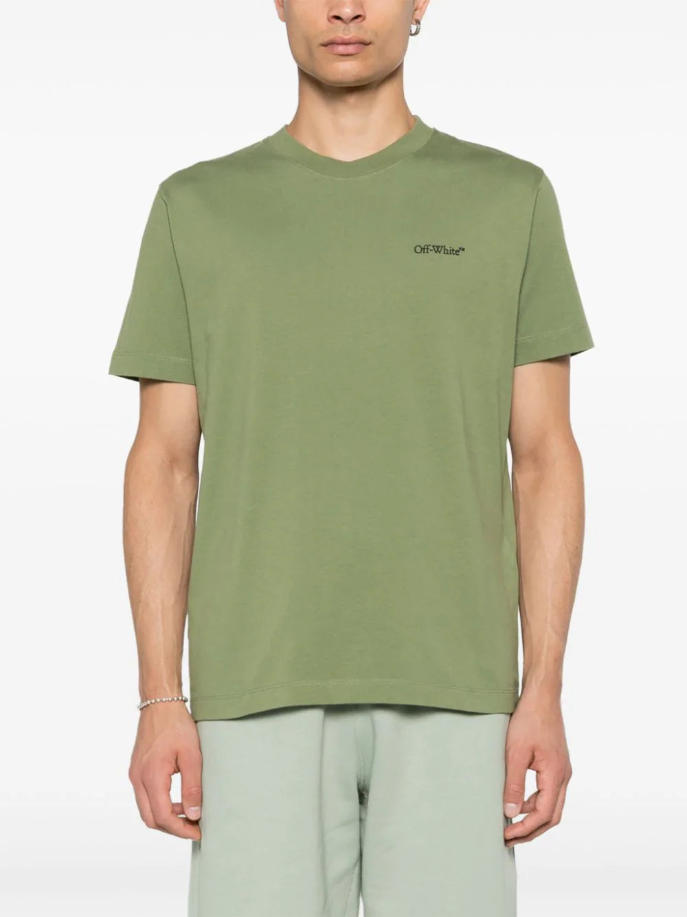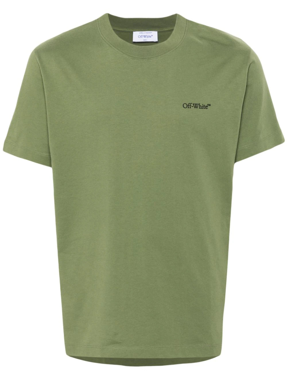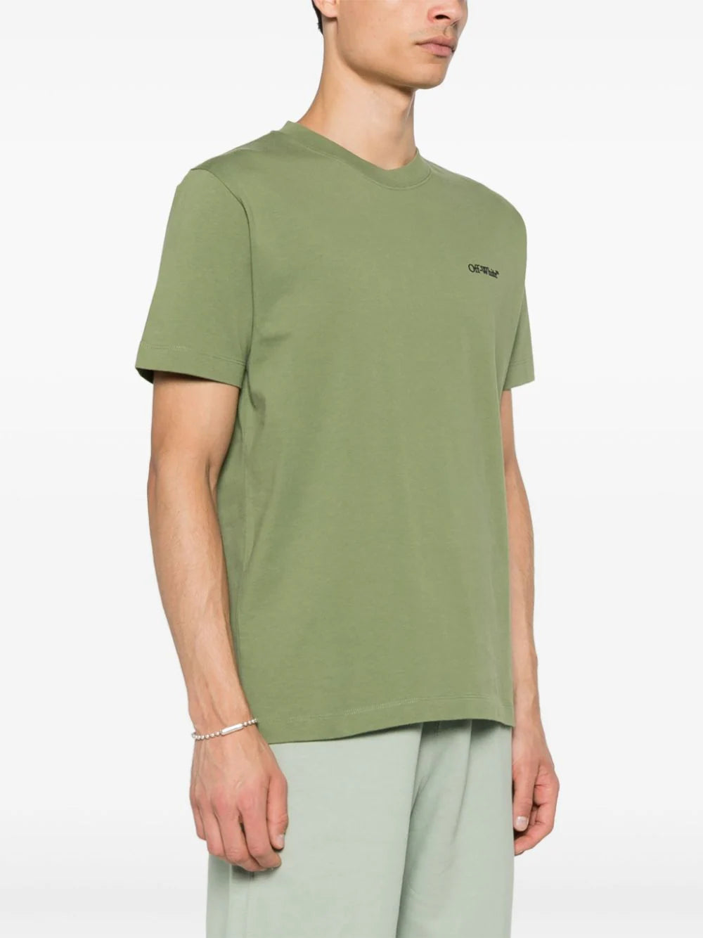 Crew-neck short-sleeved T-shirt in green cotton with rubberized Off-White logo embossed on the chest and rubberized Windy Arrow motif embossed on the back.