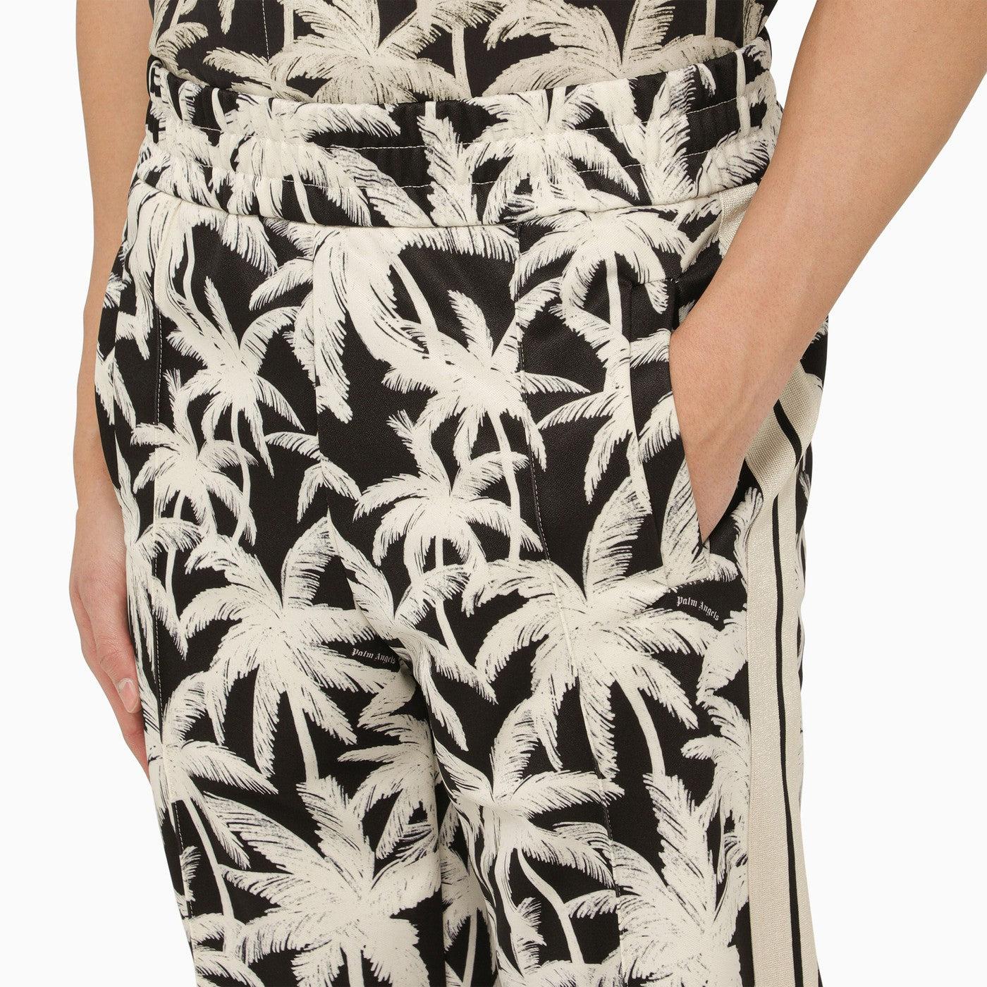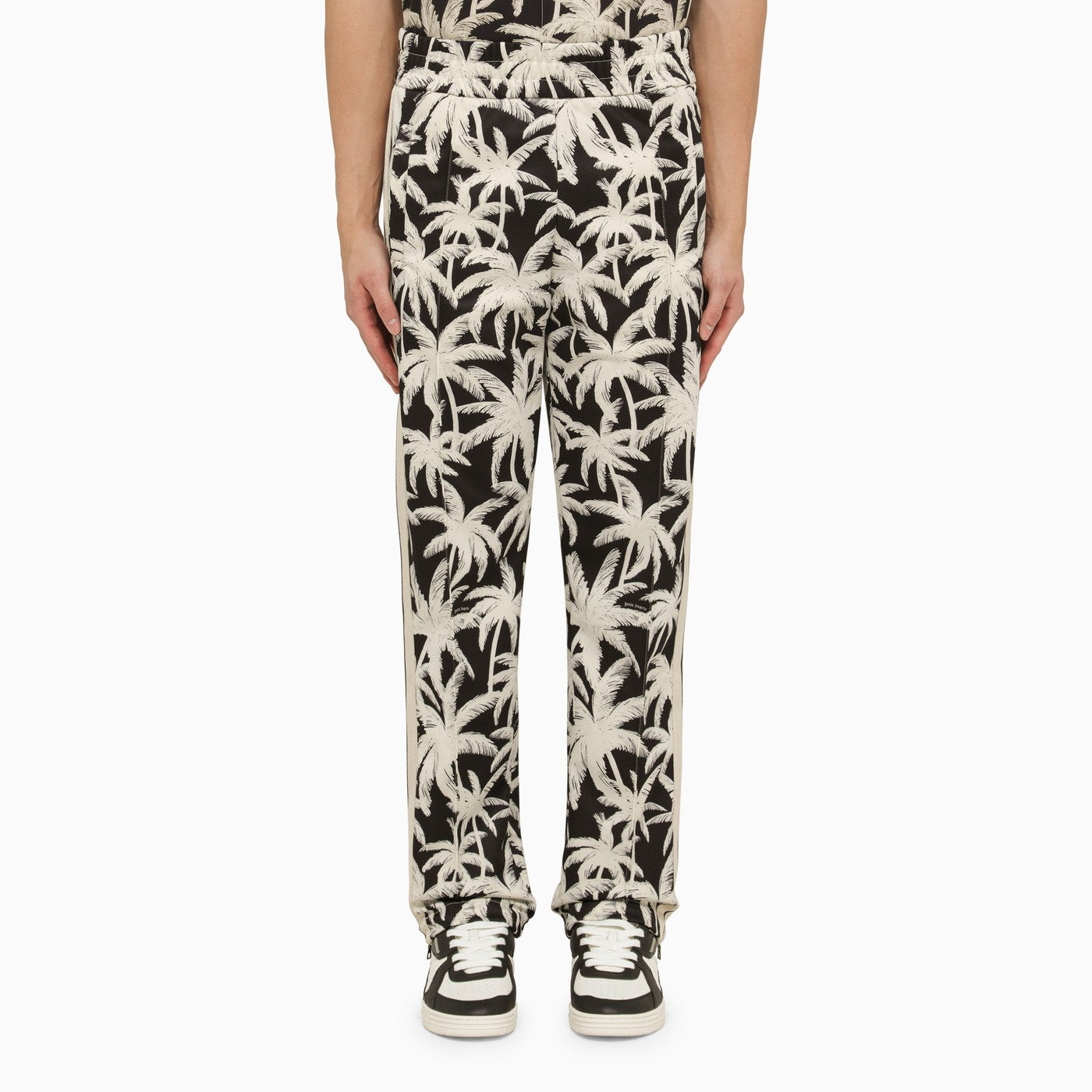 Jogging trousers by Palm Angels in black nylon with an all over white Palm print, featuring contrasting side bands, an elasticated waistband, side welt pockets and a side zip leg bottom.