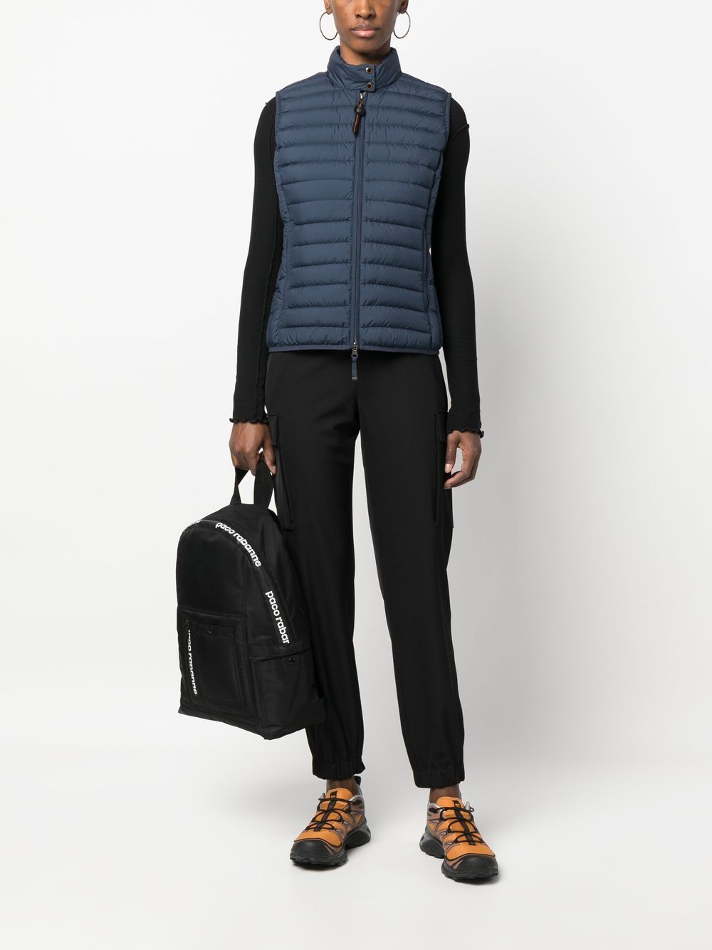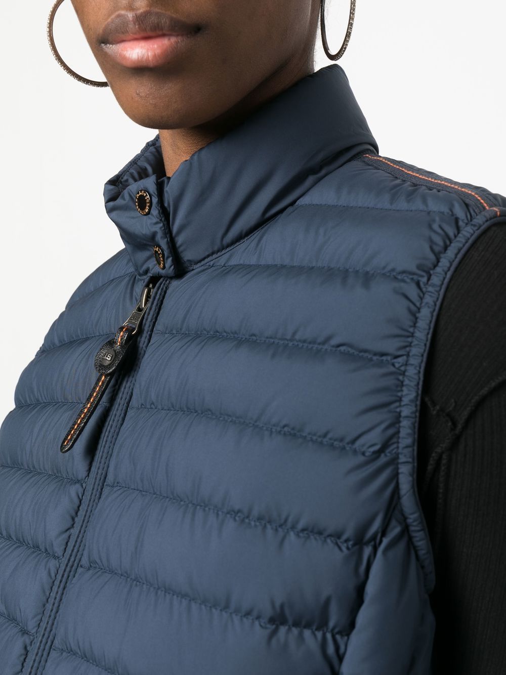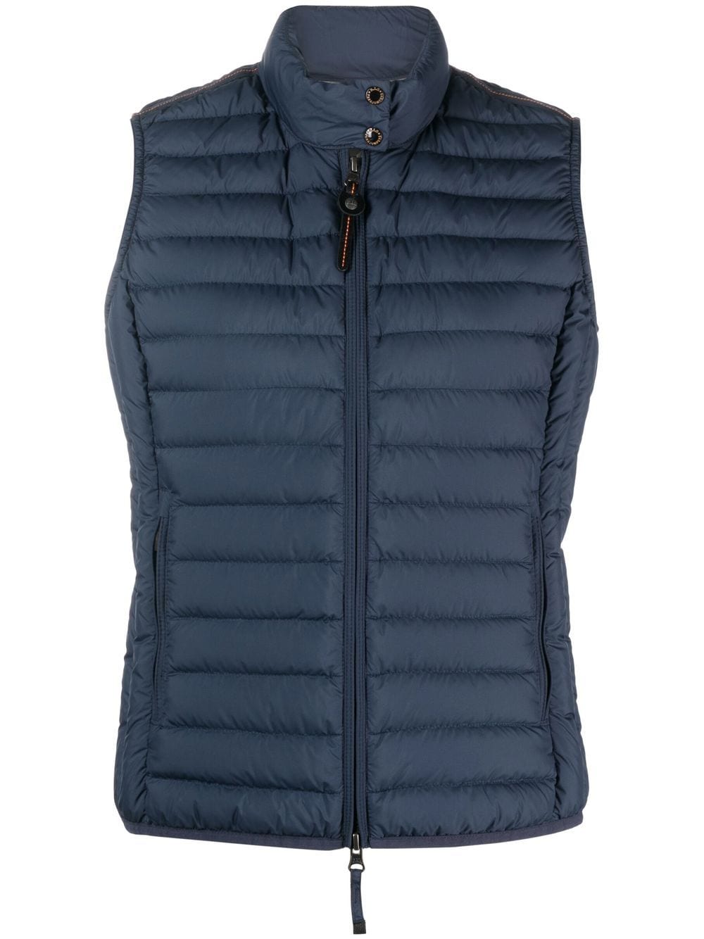 feather-down gillet from PARAJUMPERS featuring navy blue, feather down, padded design, logo patch to the rear, stand-up collar, front zip fastening, branded zip puller and sleeveless.