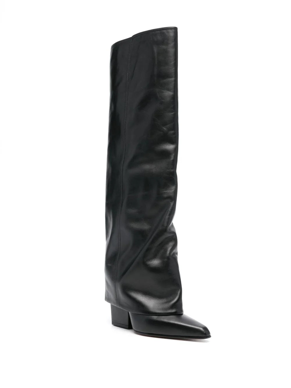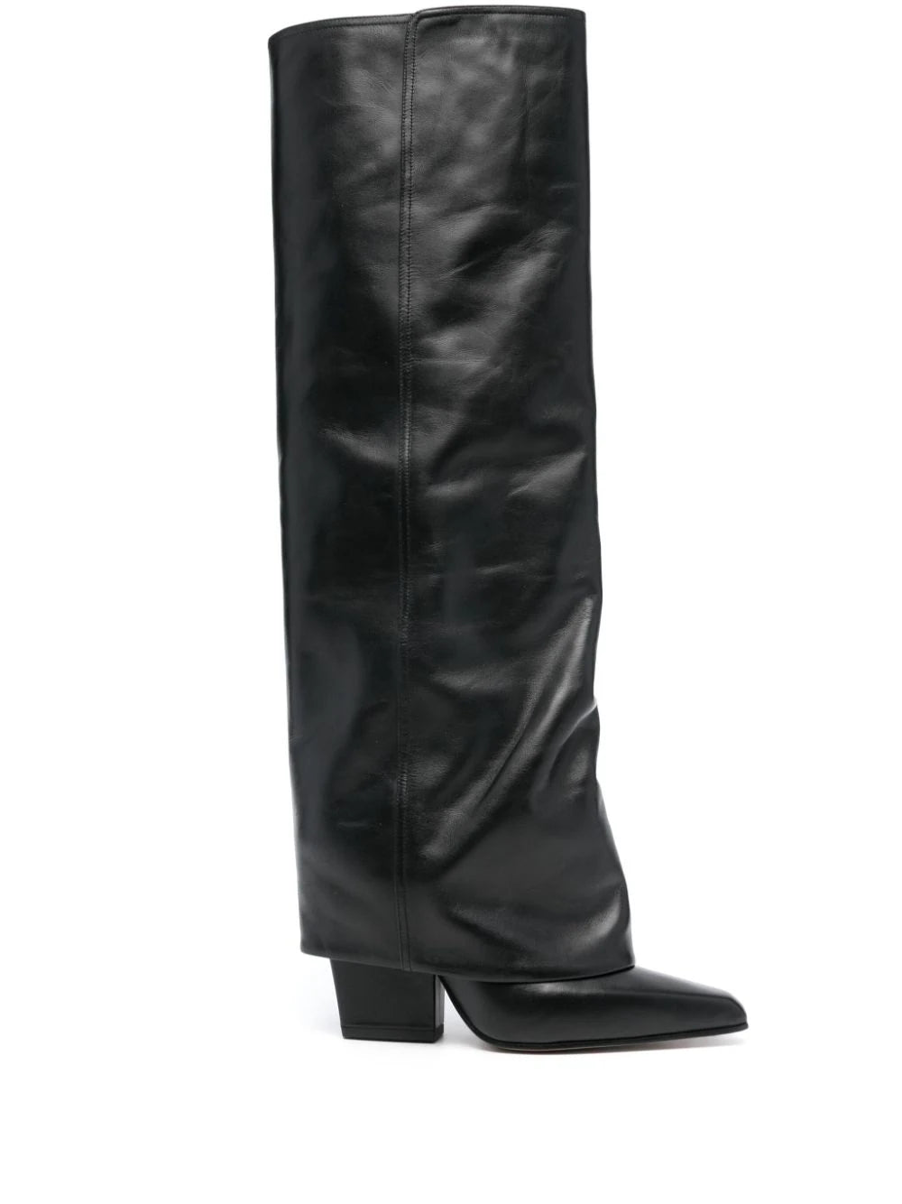 Slip-on style in black calfskin, 90mm high block heel, knee-high pointed leather sole