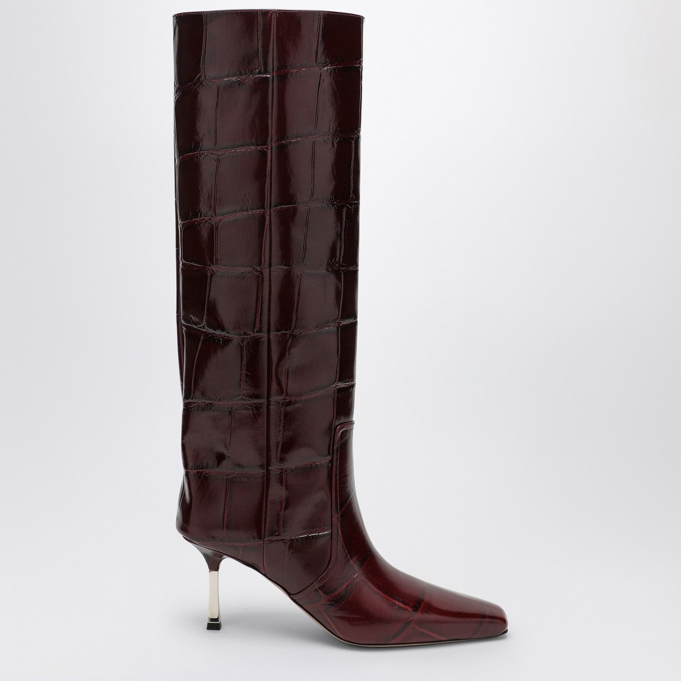 Boot in rouge noir leather with crocodile print by Paris Texas, featuring a square toe, a high bootleg, a leather sole and a metal heel.