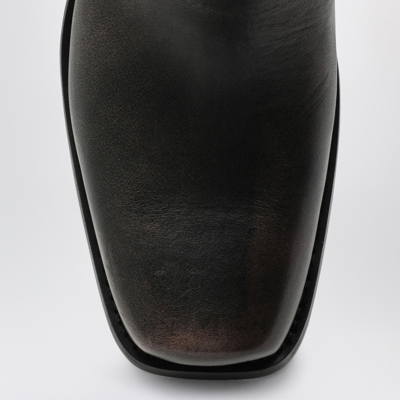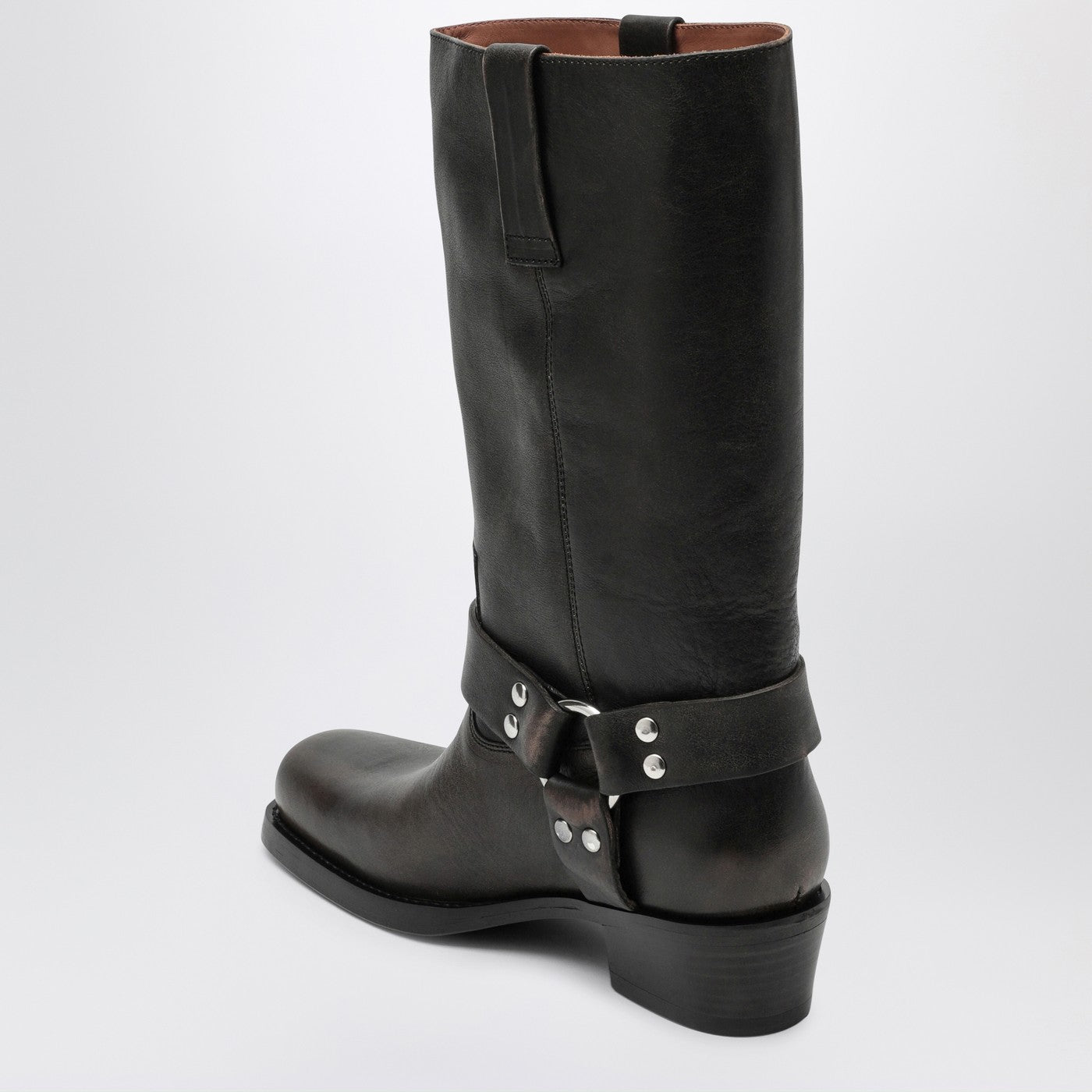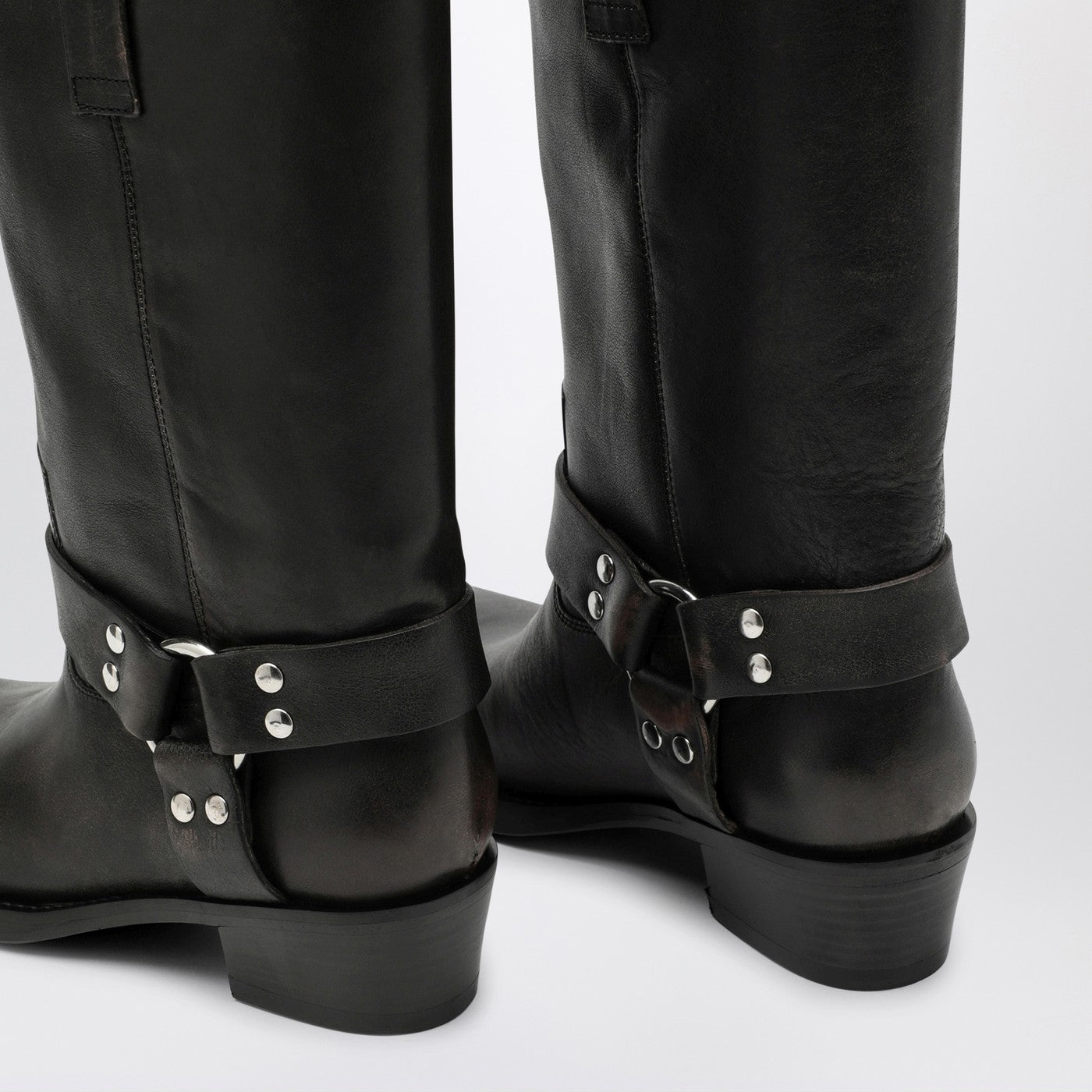 Black brushed leather Paris Texas biker boot featuring a square toe, Texan-style ankle decoration with metal straps and ring, tube bootleg, wide heel and leather sole.