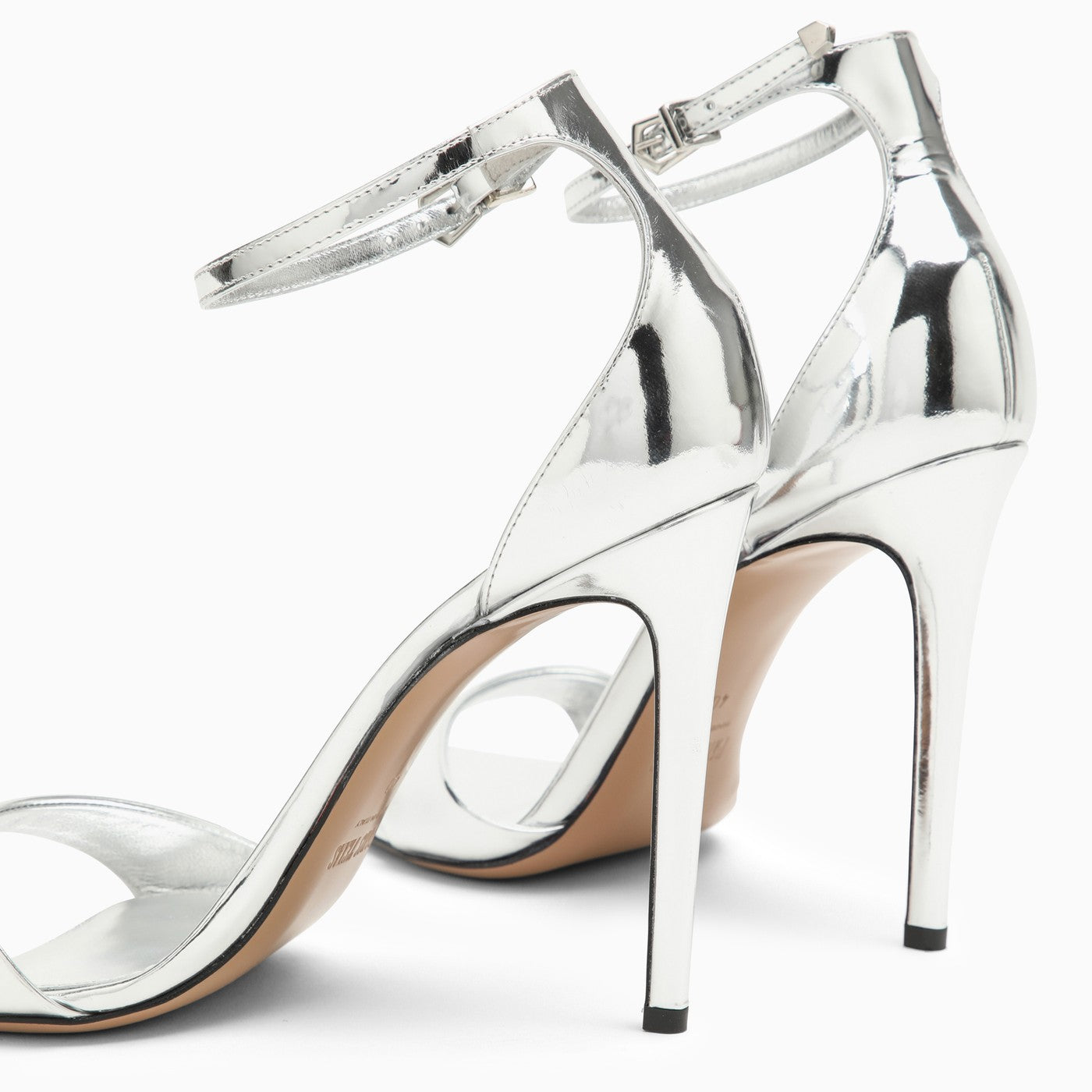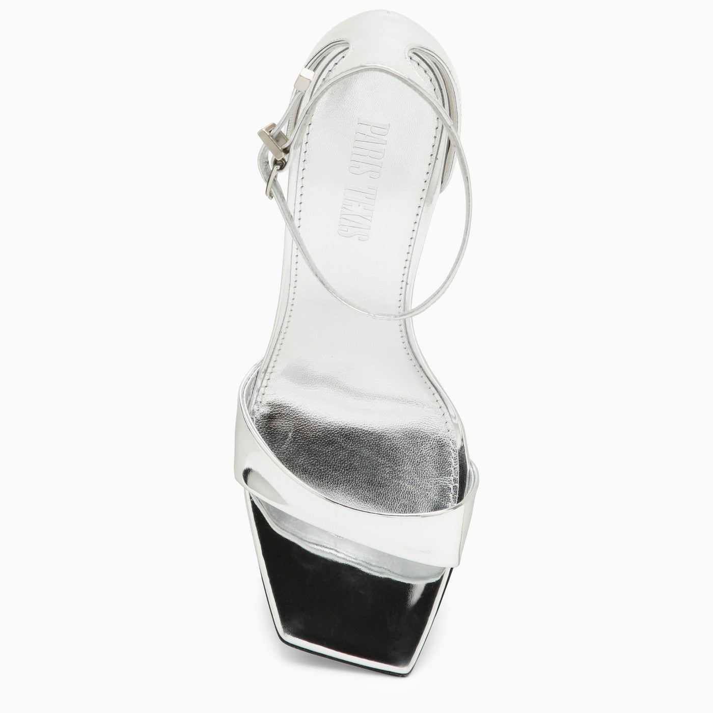 Silver-coloured smooth leather high sandal by Paris Texas featuring a metal buckle fastening, square open toe, stiletto heel and leather sole.