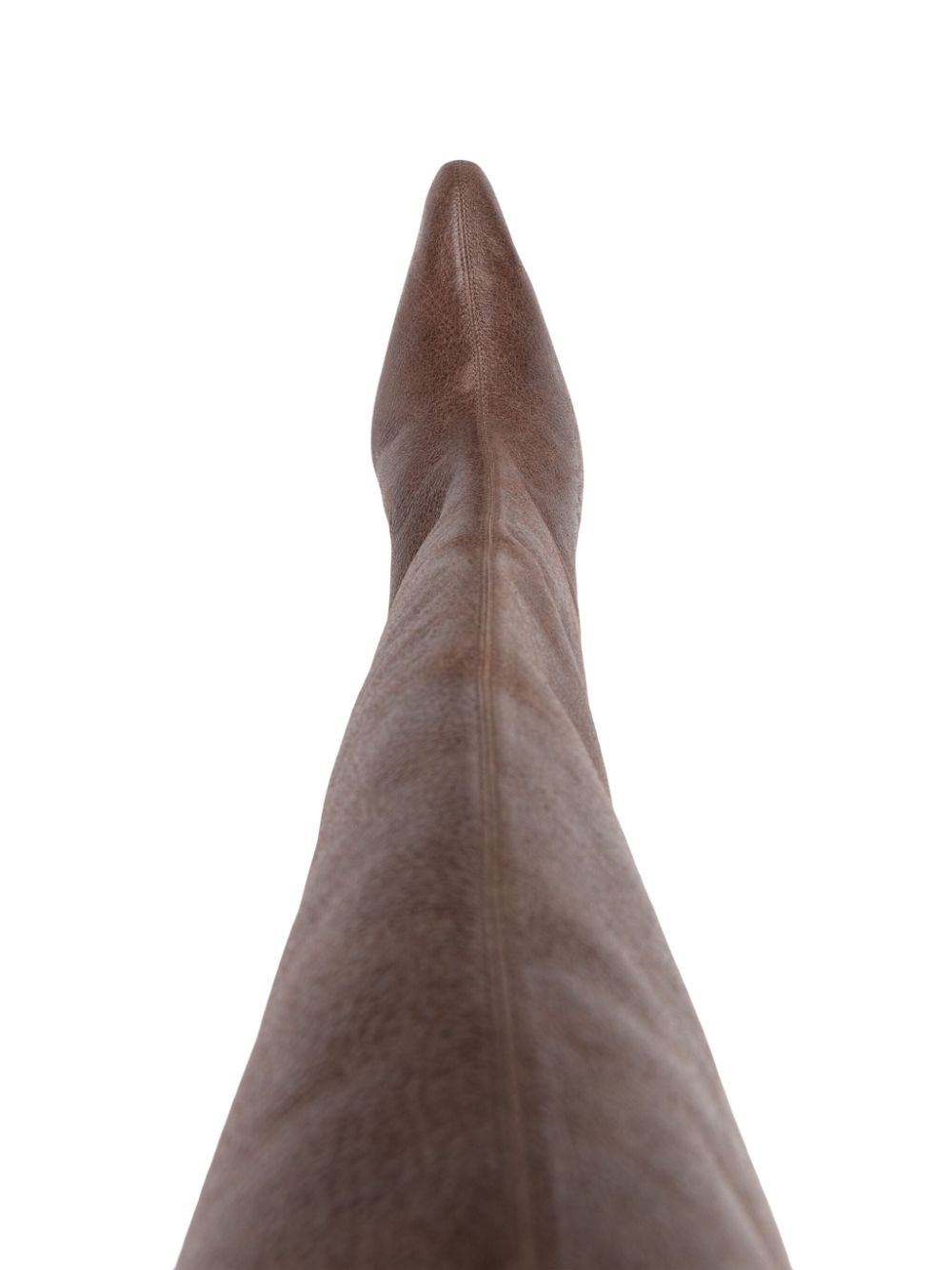 Jude 100mm knee-high boots from PARIS TEXAS featuring tobacco brown, calf leather, grained texture, knee-high, pull-on style, pointed toe and high stiletto heel.