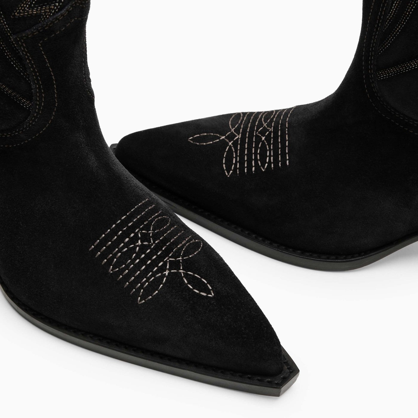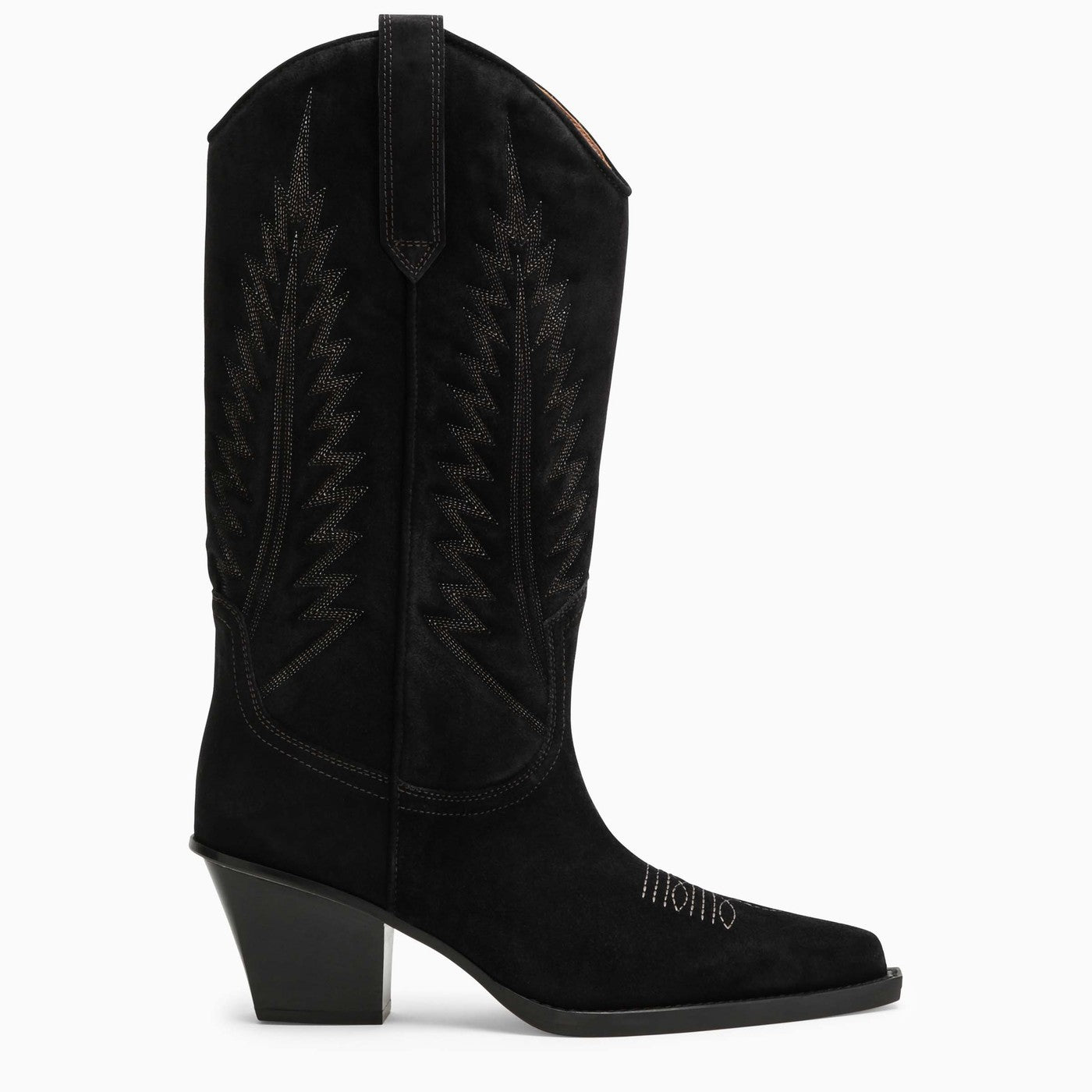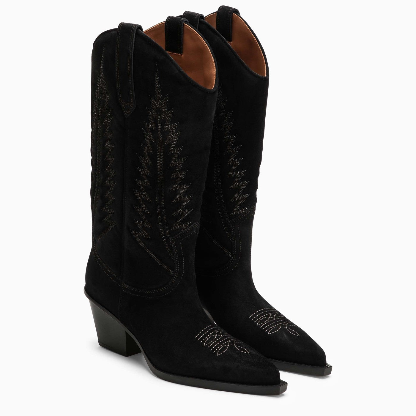 Black leather Texan boot from Paris Texas featuring a pointed toe design, a stiff shaft, a wide heel and a leather sole.