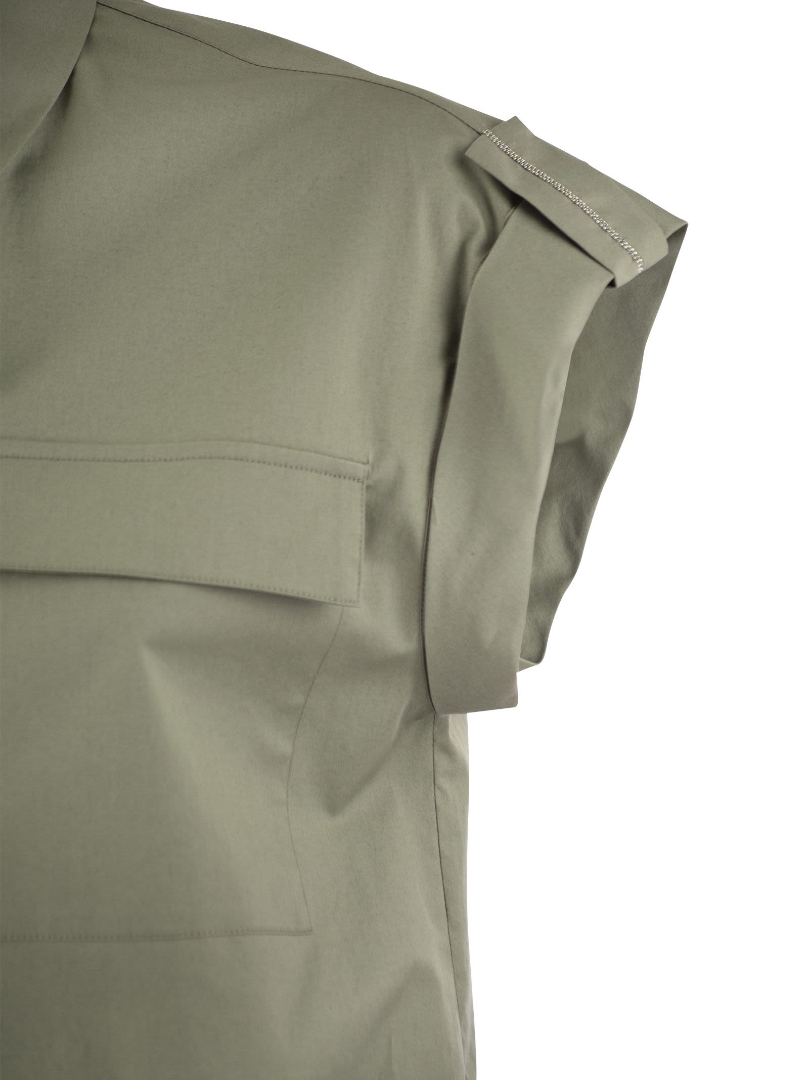 The lightweight stretch cotton satin 'sail hand' safari style shirt is a garment of adventurous elegance. The kimono sleeves, with turn-up and toggle, add a touch of originality and practicality. The spotlight detail on the toggle adds a sophisticated touch to the garment, while patch pockets on the chest with flaps contribute to the safari style. The adjustable drawstring hem offers versatility in the fit, ensuring comfort and a contemporary look. An exposed button front fastening completes the design, making this shirt perfect for an adventurous and classy feel. - Shirt with sail collar - Kimoncino sleeves, with turn-up and frog fastening - Light stitch detail on frog fastener - Patch pockets on chest with flap - Adjustable hem with drawstring - Loose fit - Front button closure DESIGNER ID: S06750D 01979 736