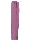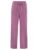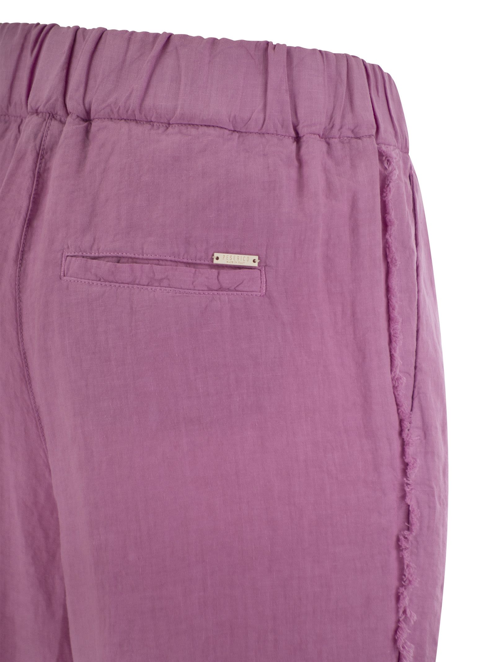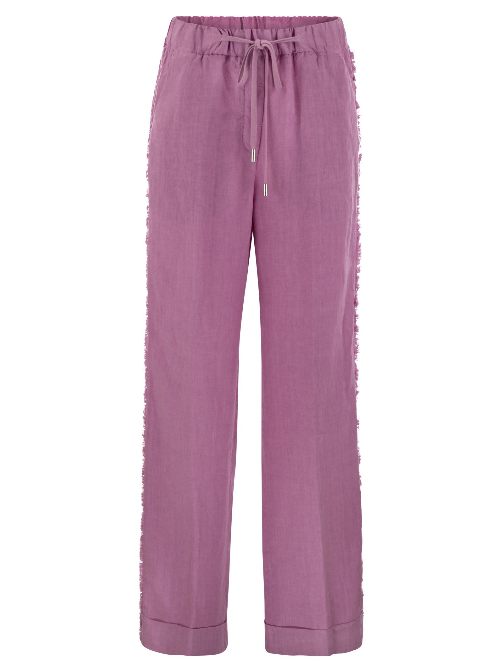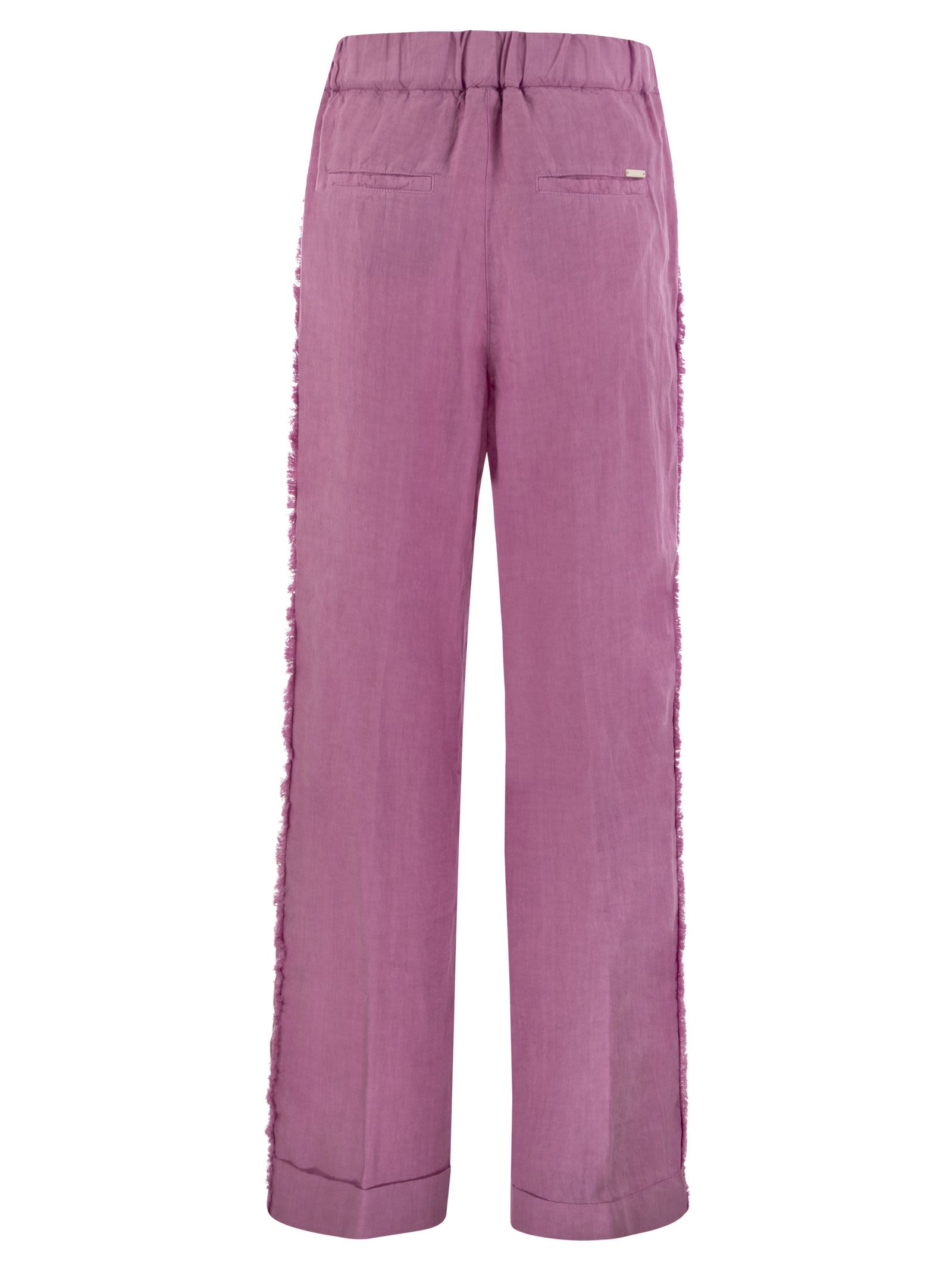 The trousers, made of a light and fresh pure linen canvas, embody summer elegance with a touch of refined comfort. The turn-up at the bottom adds a tailored detail, giving the garment a note of sophistication. The wide leg, falling palazzo style, contributes to a fluid and contemporary silhouette. Emphasised by the high waist that gracefully completes the aesthetic of this refined and versatile garment. - Side slit pockets, welt at the back - Drawstring waist - Loose fit - High waist - Side fringes DESIGNER ID: P04145T00D 01617 798