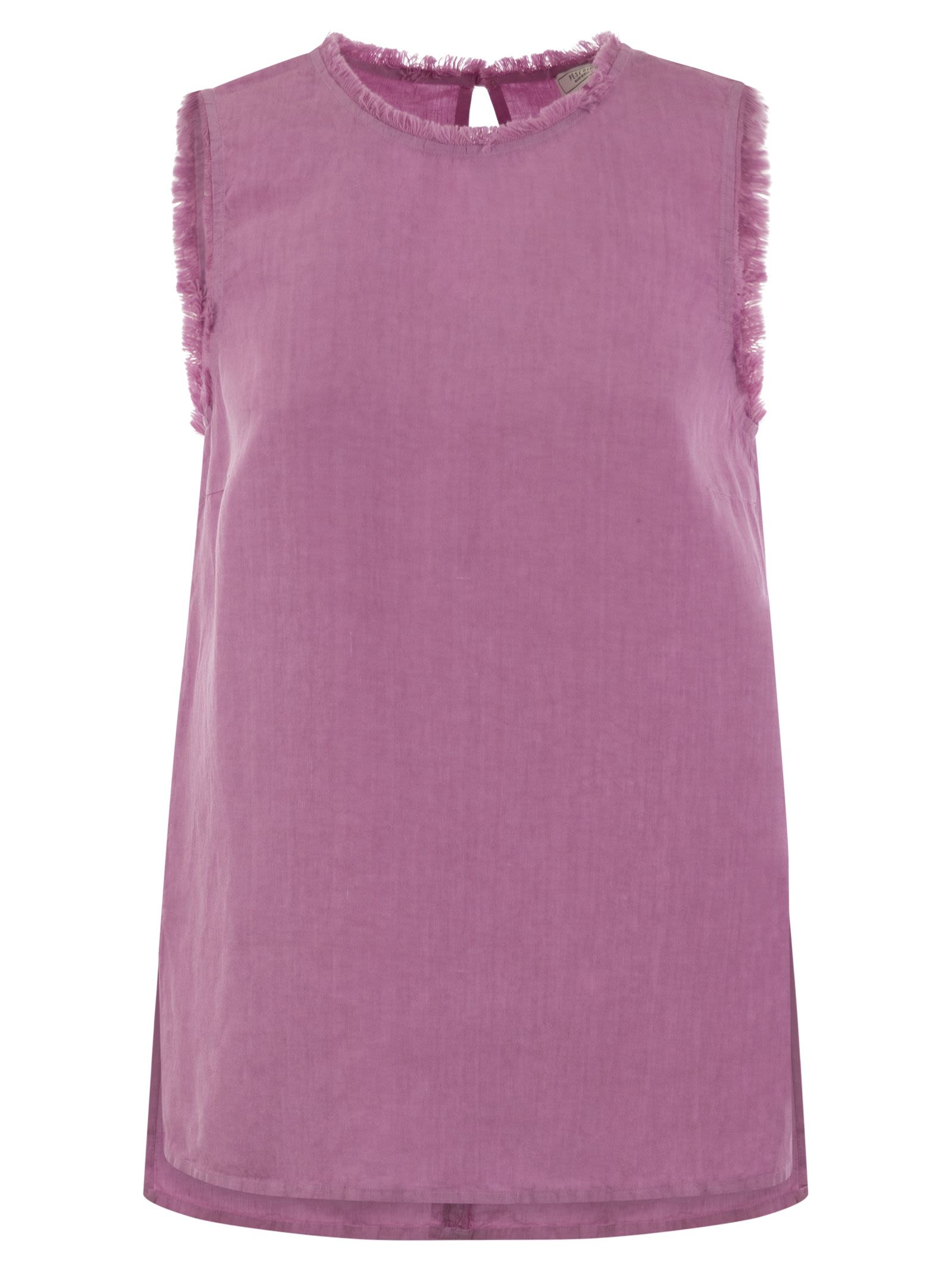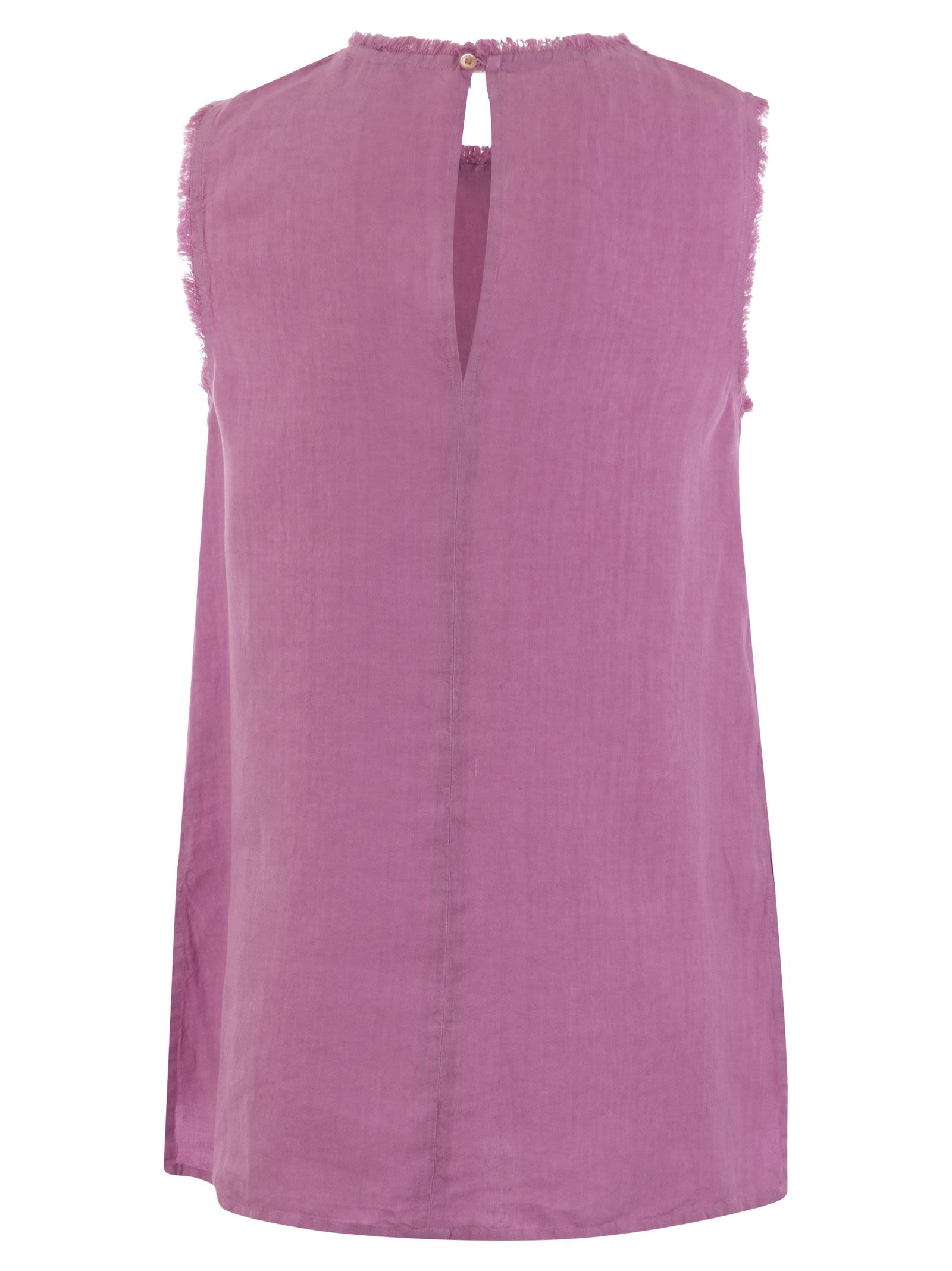 The cool fabric of linen is revealed in this sleeveless top. The round neck finished with fringes adds a touch of timeless sophistication to this garment. Rounded hem, longer at the back and fringed sleeves. - Sleeveless - Loose fit - Drop back button fastening - Sleeveless DESIGNER ID: S08299T0 01617 798