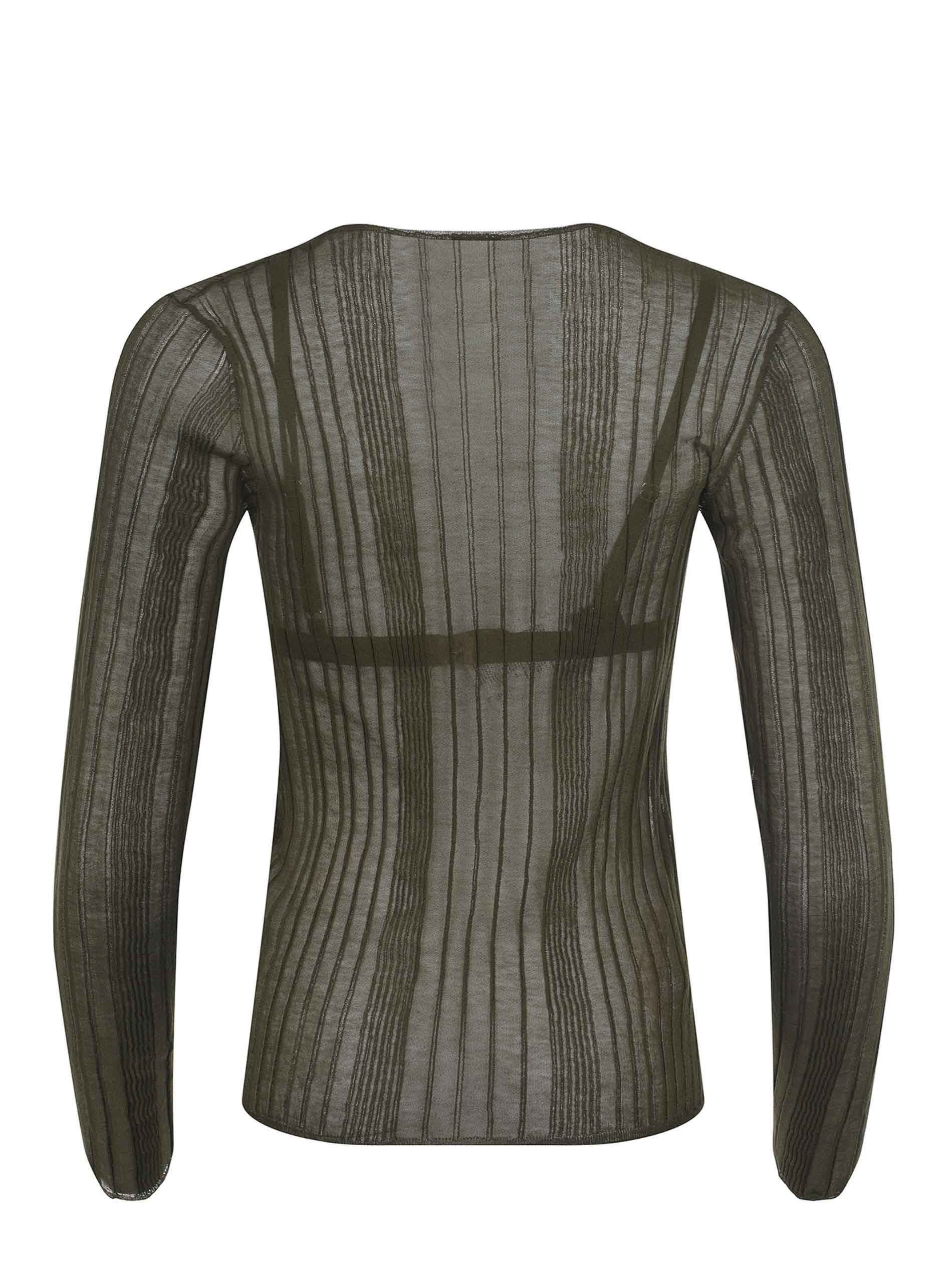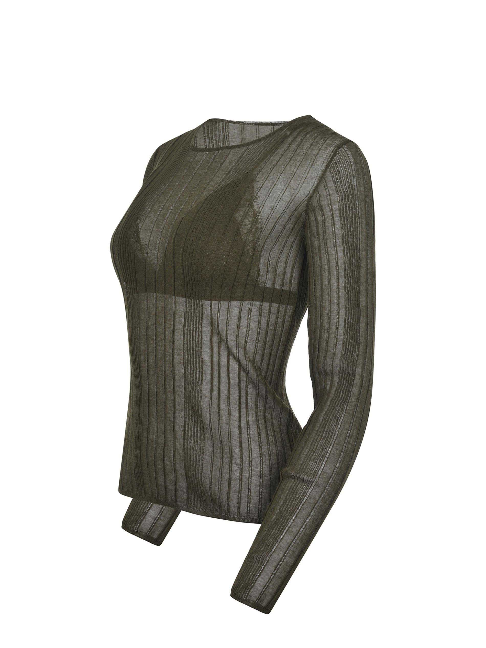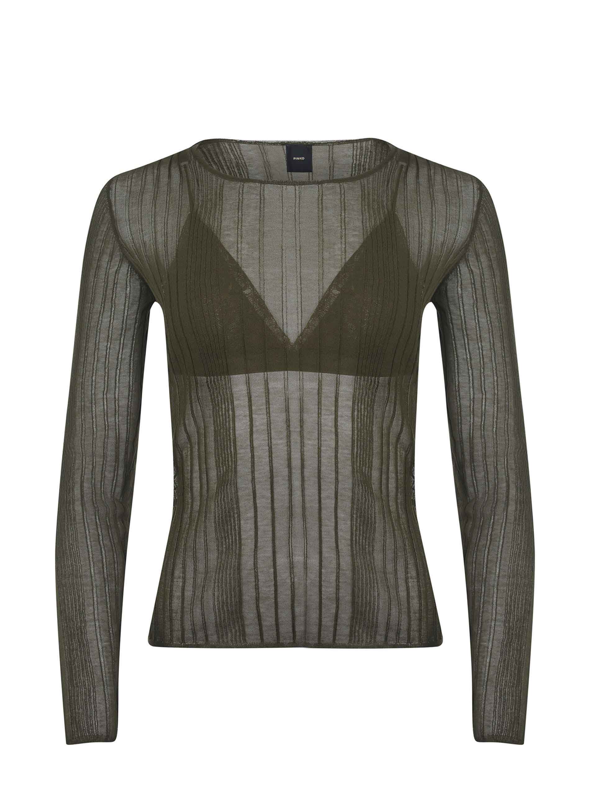 Pinko "Alchemilla" sweater made of a cotton blend in military green. Semi-transparent ribbed fabric. Long sleeves. Crew neck. Removable tone-on-tone lace bralette with adjustable straps. Bralette 100% nylon, 82% cotton, 18% nylon.